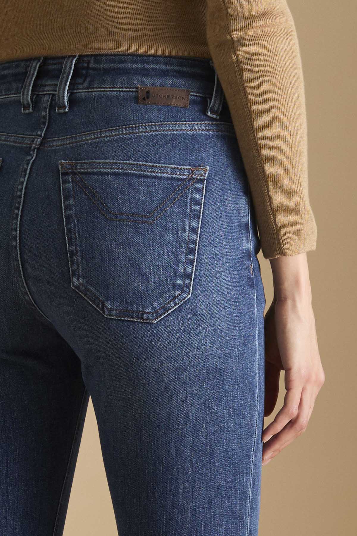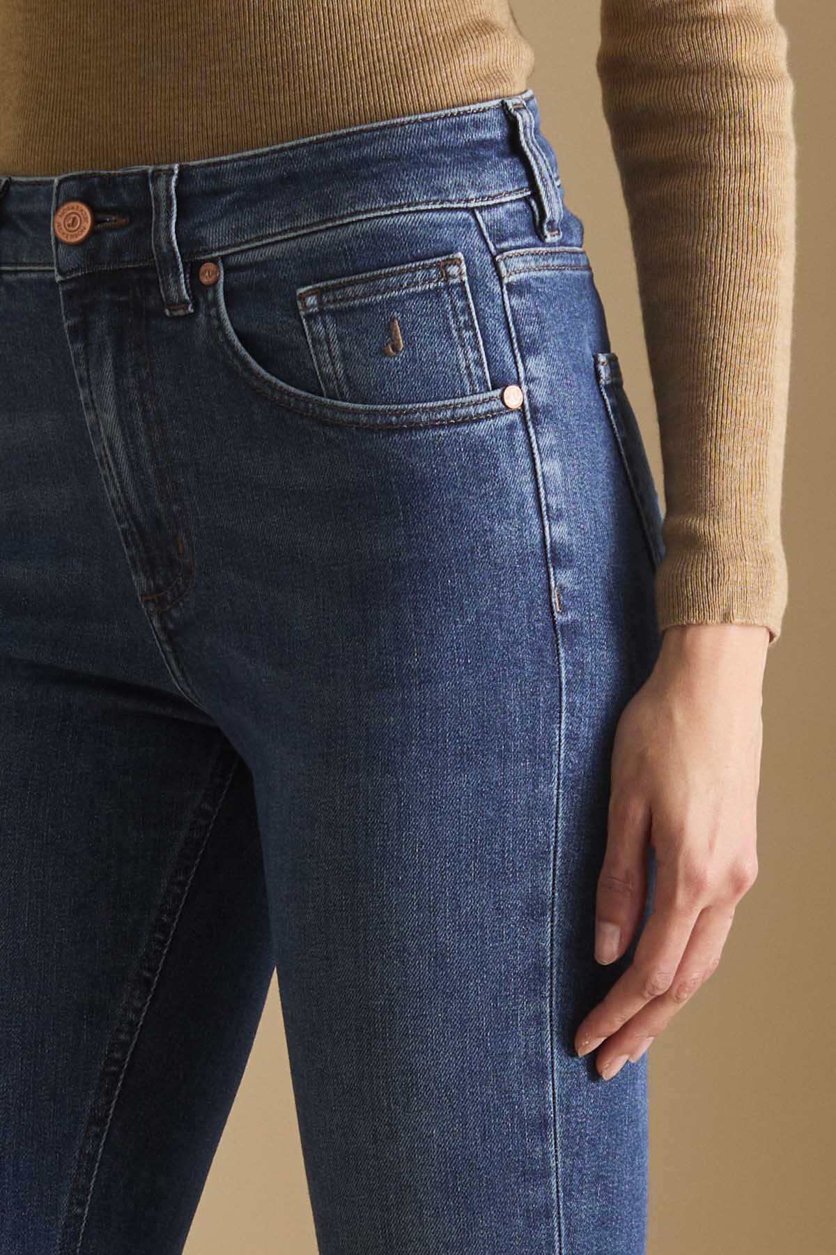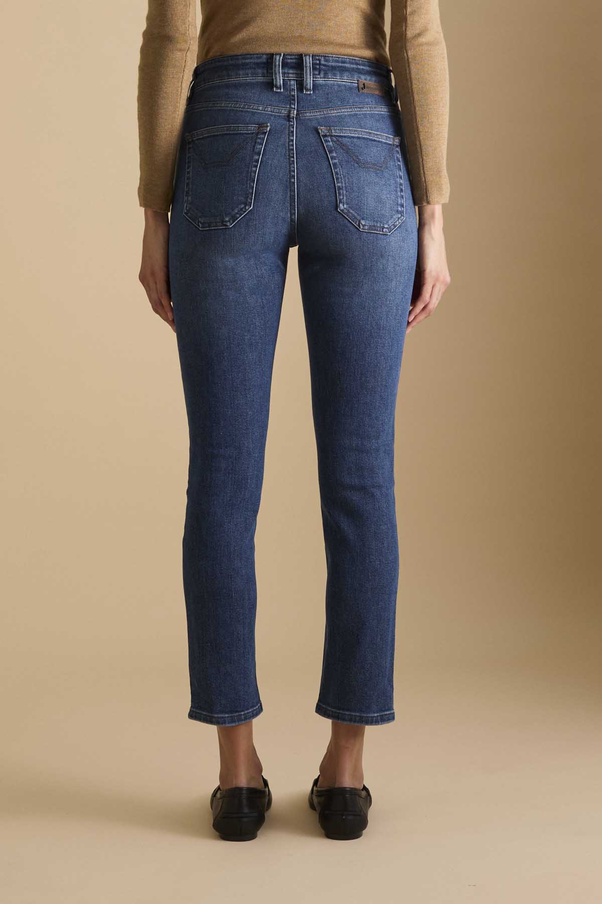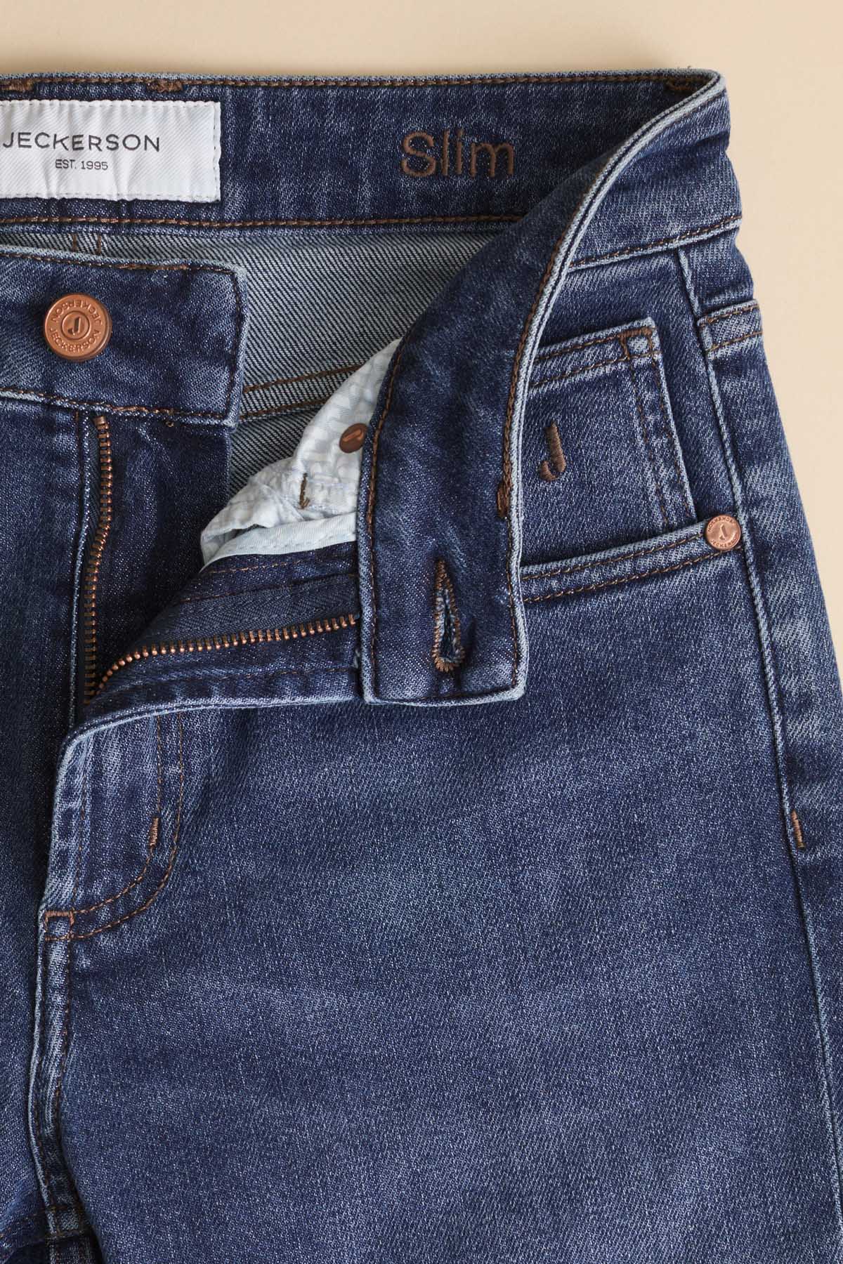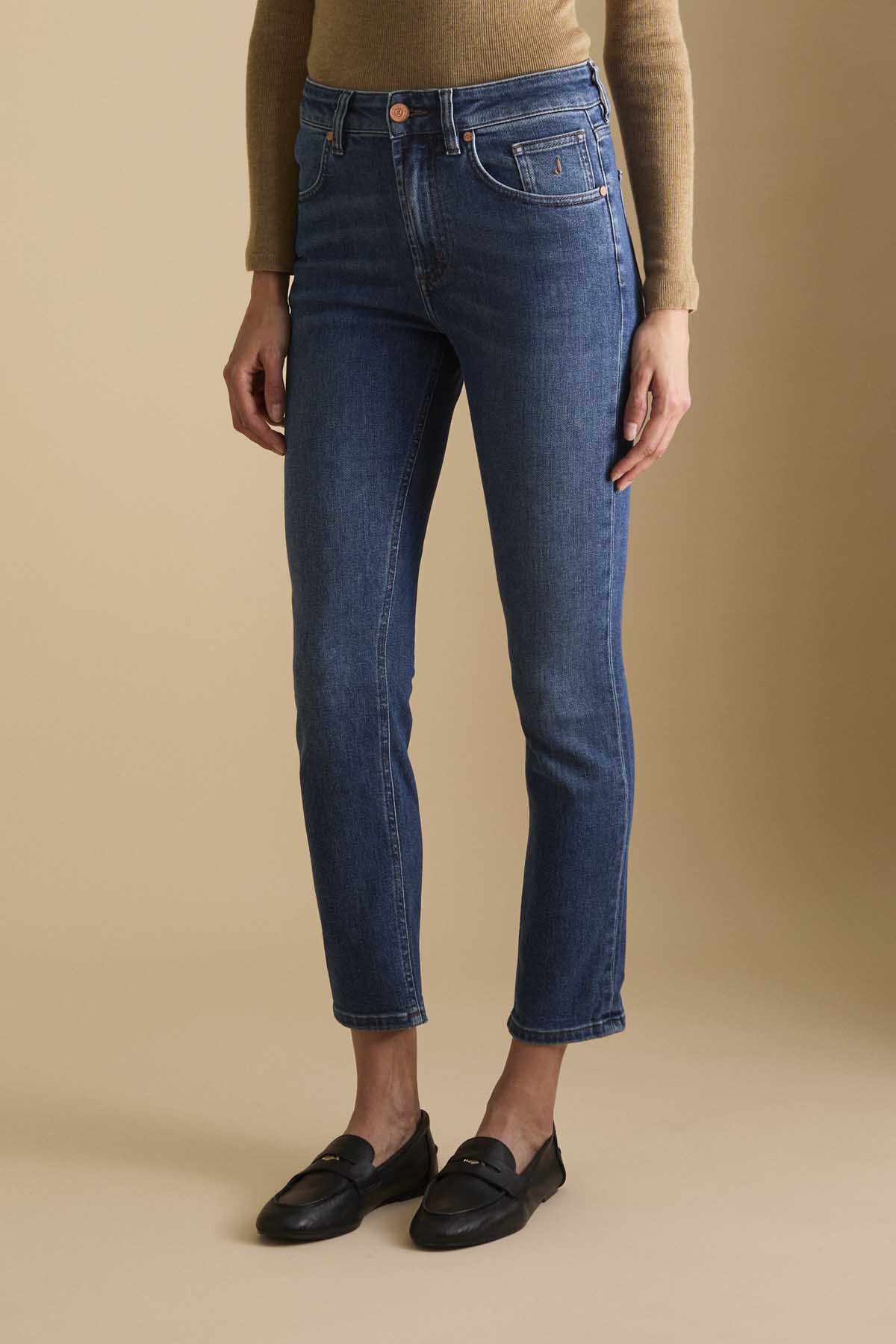 Jeans 5 tasche slim fit con lavaggio blu scuro in denim base blu dalla mano compatta e setosa conferitagli dal lyocell che dona una sensazione di leggerezza e un aspetto autentico. Il pantalone è dotato di metalleria loggata in colore ottone e cuciture colore tabacco, tipiche del mondo denim. La salpa è in pelle tinta in colore testa di moro cerata manualmente. Il lavaggio dall’aspetto medio ha delle lievi sabbiature per mantenere l’aspetto più sofisticato e autentico del blue denim. Questo denim è caratterizzato da una vestibilità aderente, vita media e fondo corto alla caviglia ed è un evergreen adatto a qualsiasi occasione.