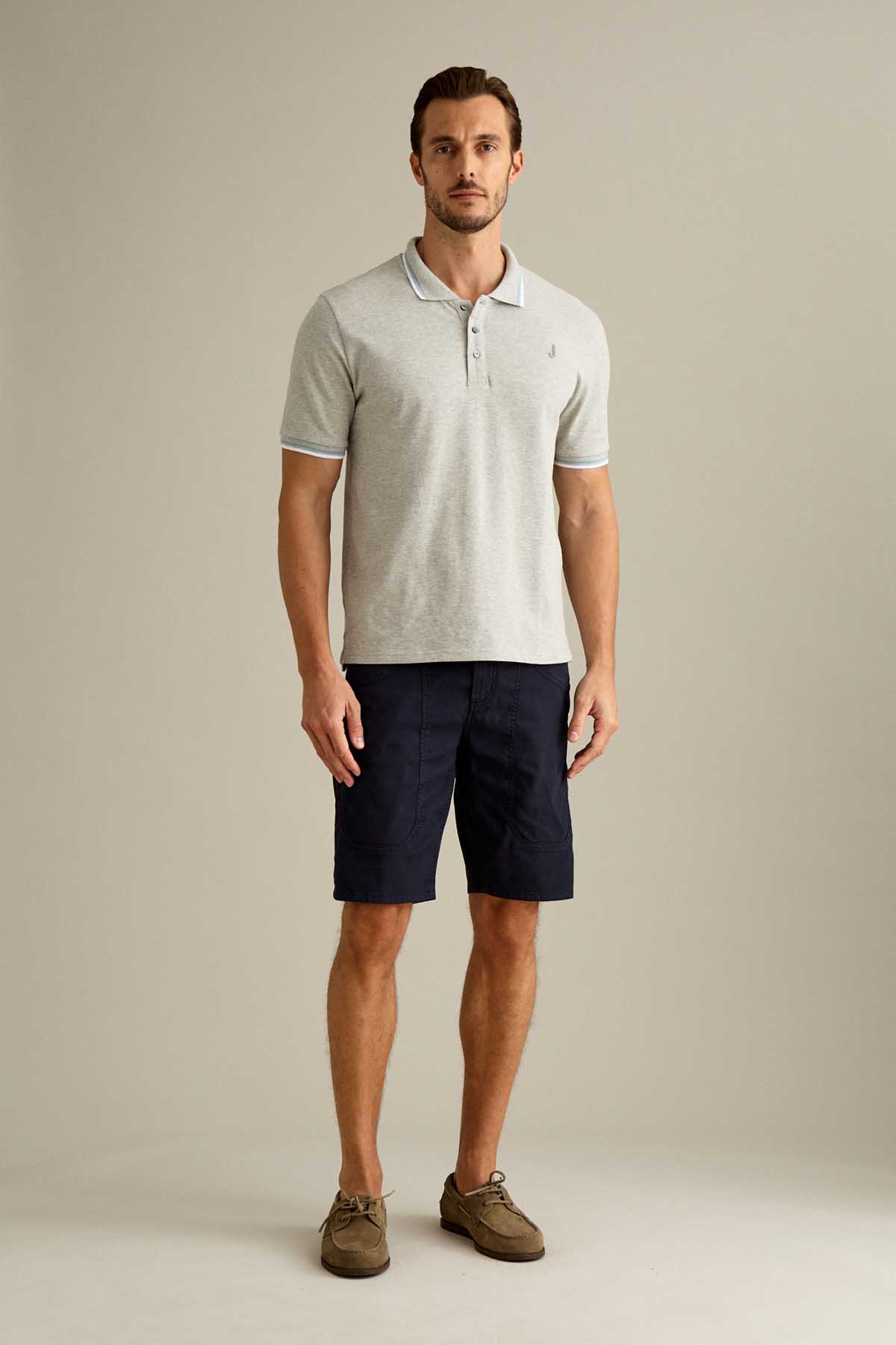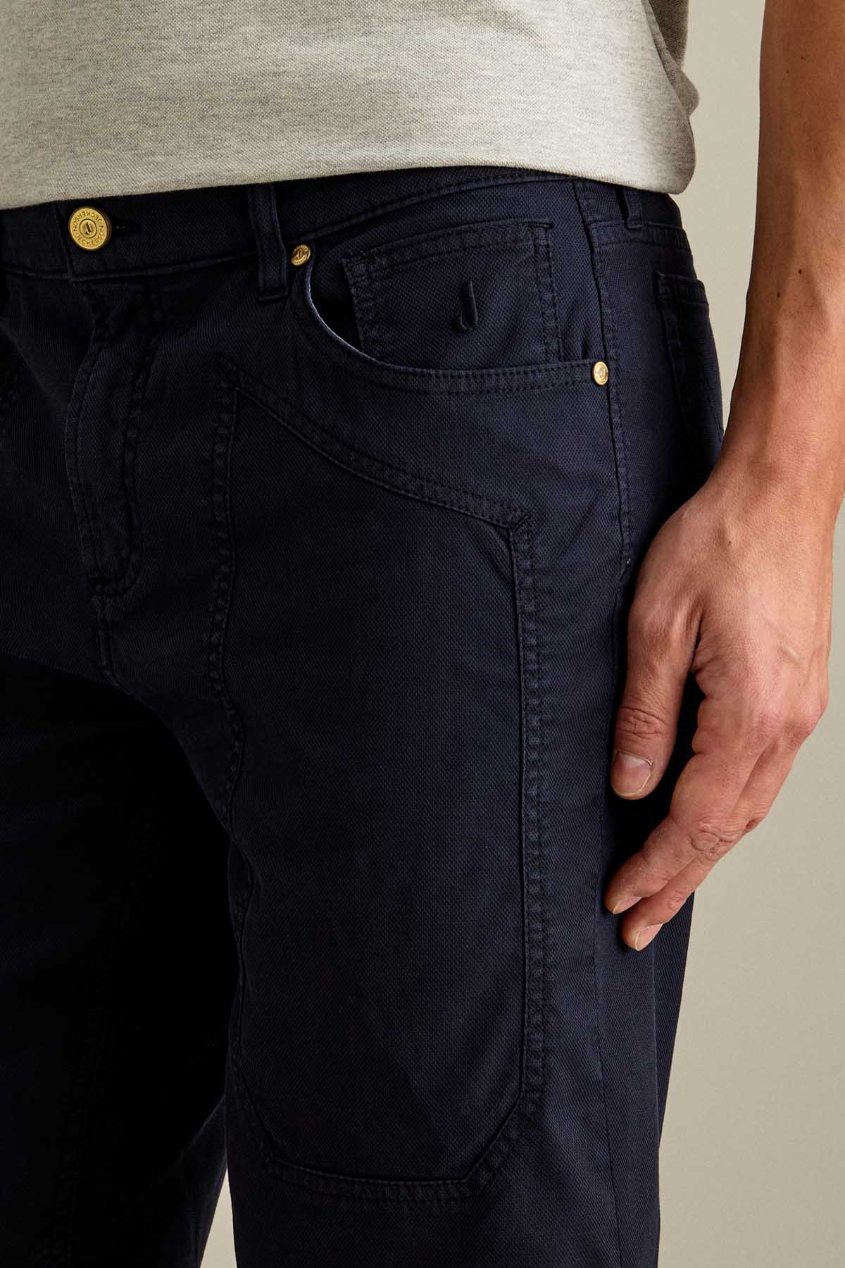 Il bermuda Jayden 5 tasche slim fit, con iconico inserto toppa, è ideale per uno stile estivo moderno e versatile. Realizzato in armatura comfort micro nido d’ape, assicura leggerezza, traspirabilità e comfort durante tutta la giornata. Tinto in capo nella tonalità Blu Scuro, per uno stile elegante e senza tempo. Dotato di chiusura con zip e bottone, è completato da salpa in pelle, bottone in vita e rivetti personalizzati in finitura ottone.