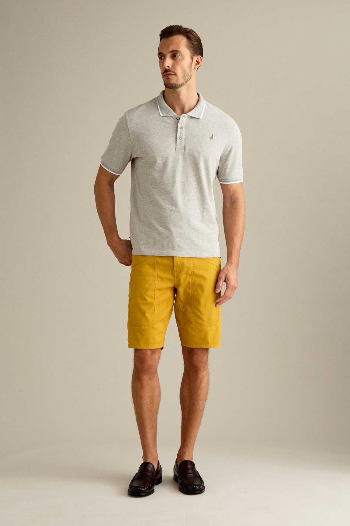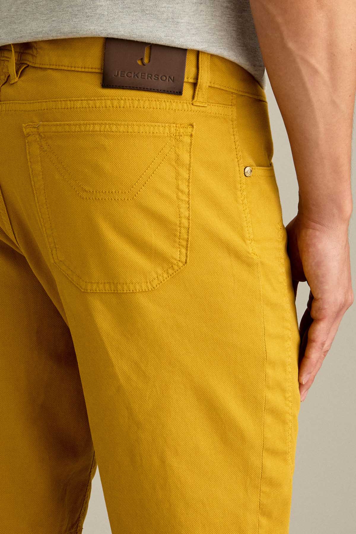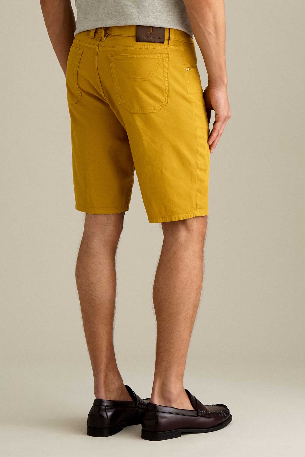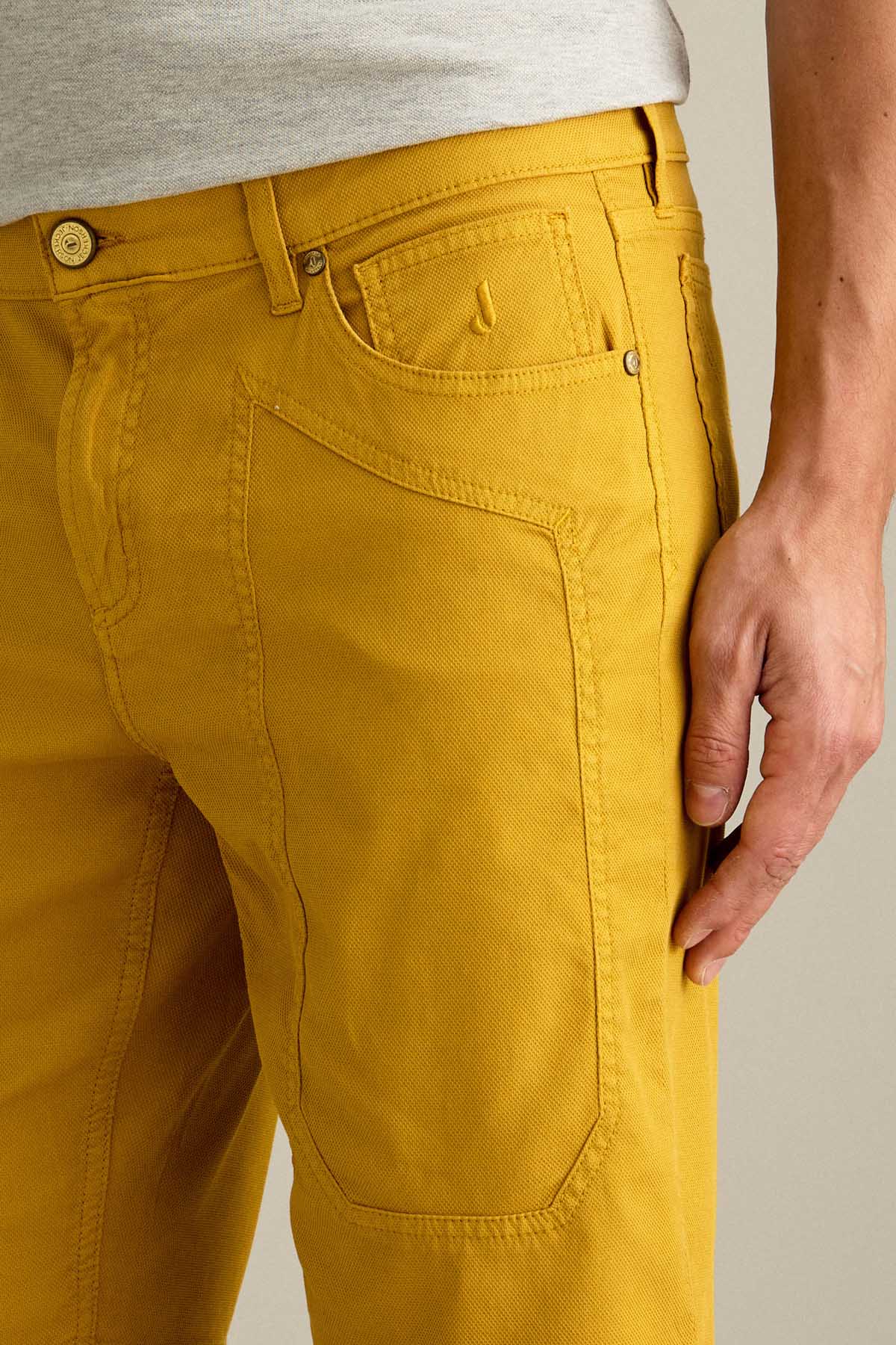 Il bermuda Jayden 5 tasche slim fit, con iconico inserto toppa, è ideale per uno stile estivo moderno e versatile. Realizzato in armatura comfort micro nido d’ape, assicura leggerezza, traspirabilità e comfort durante tutta la giornata. Tinto in capo nella tonalità Giallo Oro, per uno stile luminoso e distintivo.. Dotato di chiusura con zip e bottone, è completato da salpa in pelle, bottone in vita e rivetti personalizzati in finitura ottone. opaco.