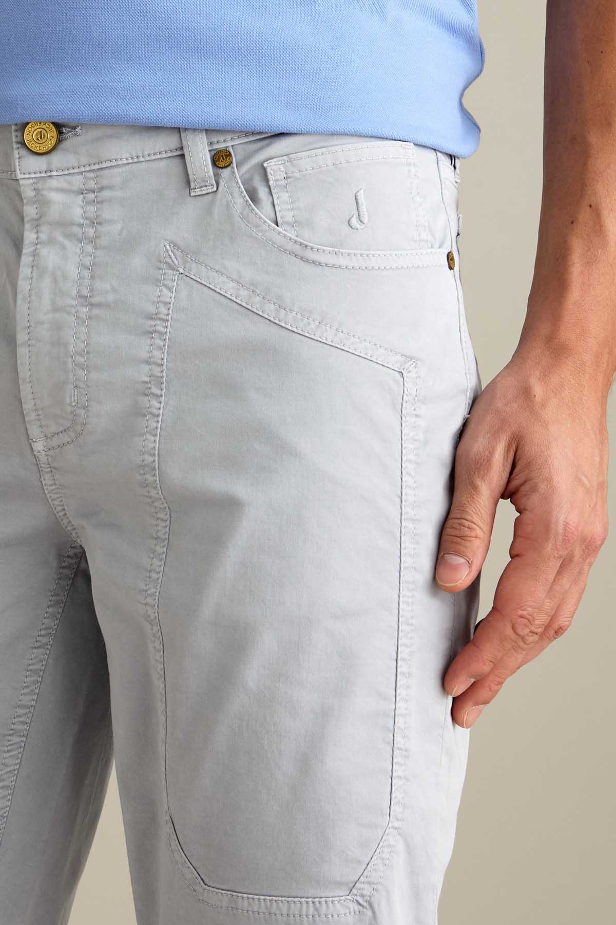 Il bermuda Jayden 5 tasche slim fit, con iconico inserto toppa, è ideale per uno stile estivo moderno e versatile. Realizzato in raso comfort e sottoposto a lavaggio old, conferisce al capo un effetto tridimensionale e una mano piacevole al tatto. Tinto in capo nella tonalità Grigio Cemento, dona un’estetica moderna e materica. Dotato di chiusura con zip e bottone, è completato da bottone in vita e rivetti personalizzati in finitura ottone opaco.