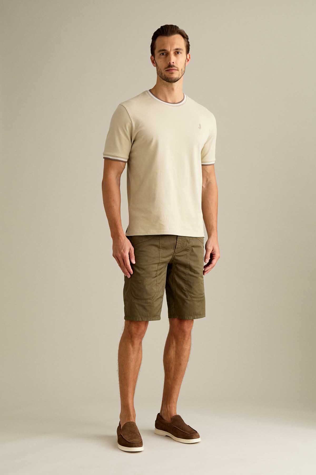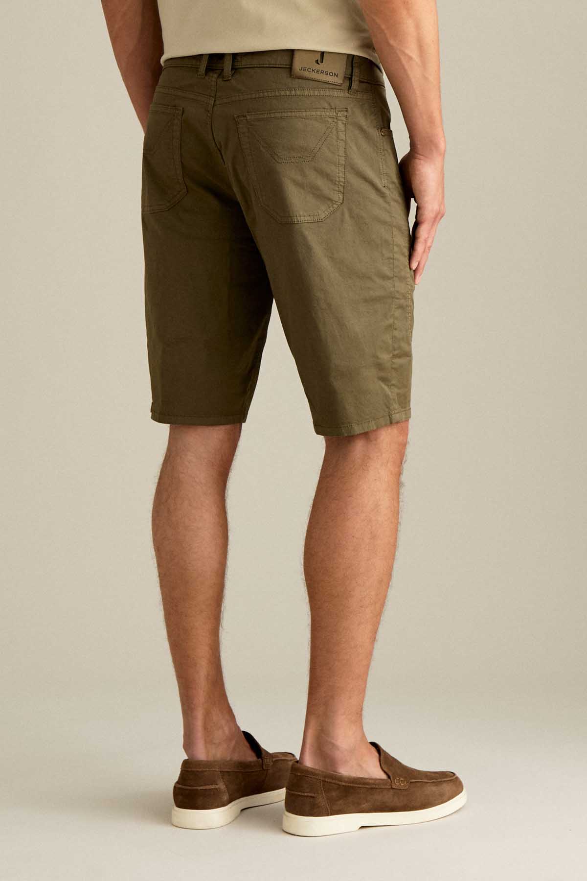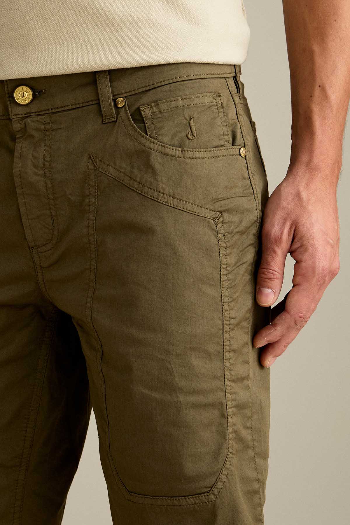 Il bermuda 5 tasche slim fit con iconico inserto toppa è ideale per un look estivo moderno e versatile. Realizzato in gabardina light comfort, assicura leggerezza, traspirabilità e comfort per tutta la giornata. Tinto in capo nella tonalità Verde Militare, per uno stile deciso e contemporaneo. Dotato di chiusura con zip e bottone, è completato da salpa logata in pelle, bottone in vita e rivetti in finitura ottone opaco.