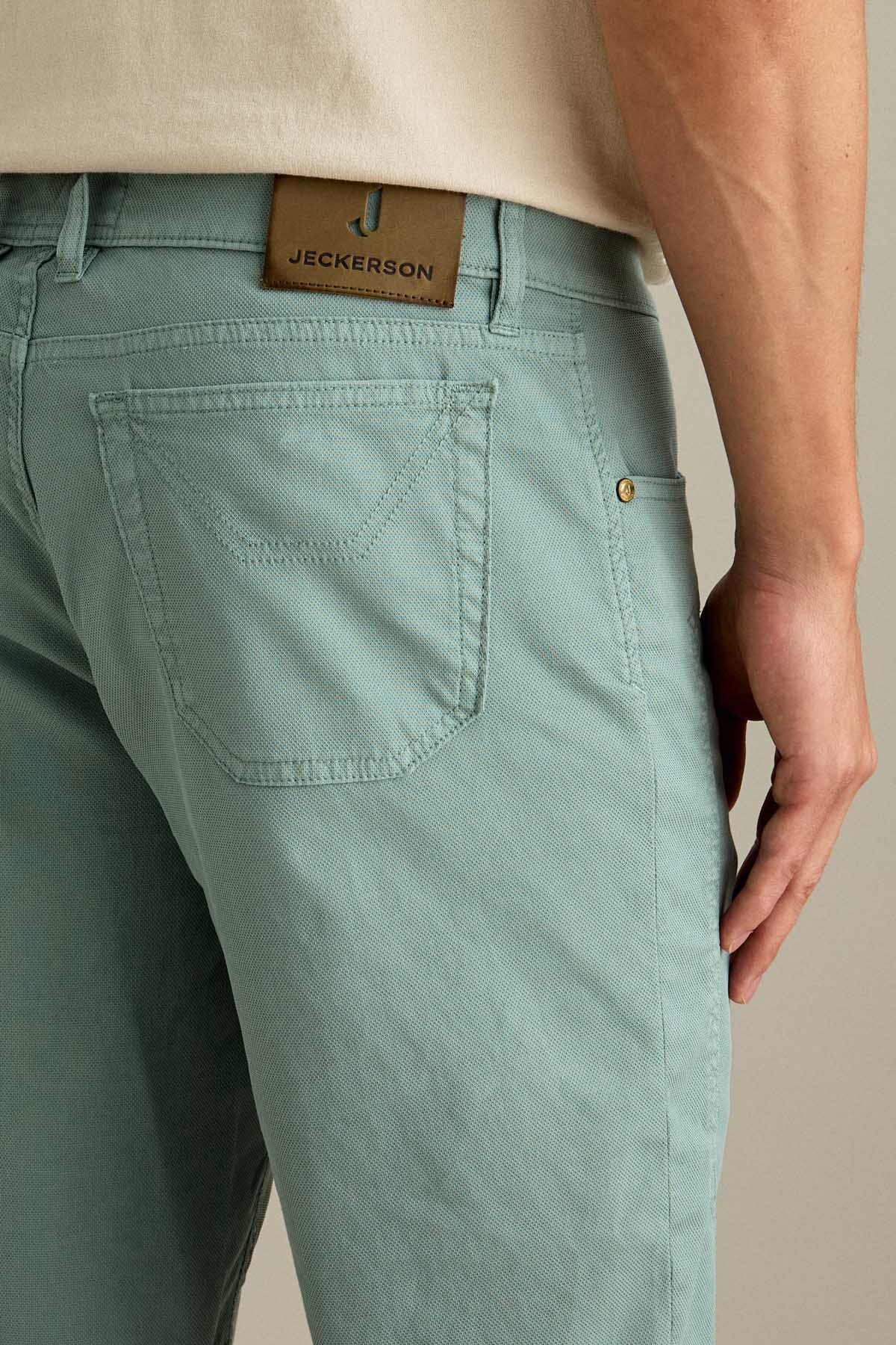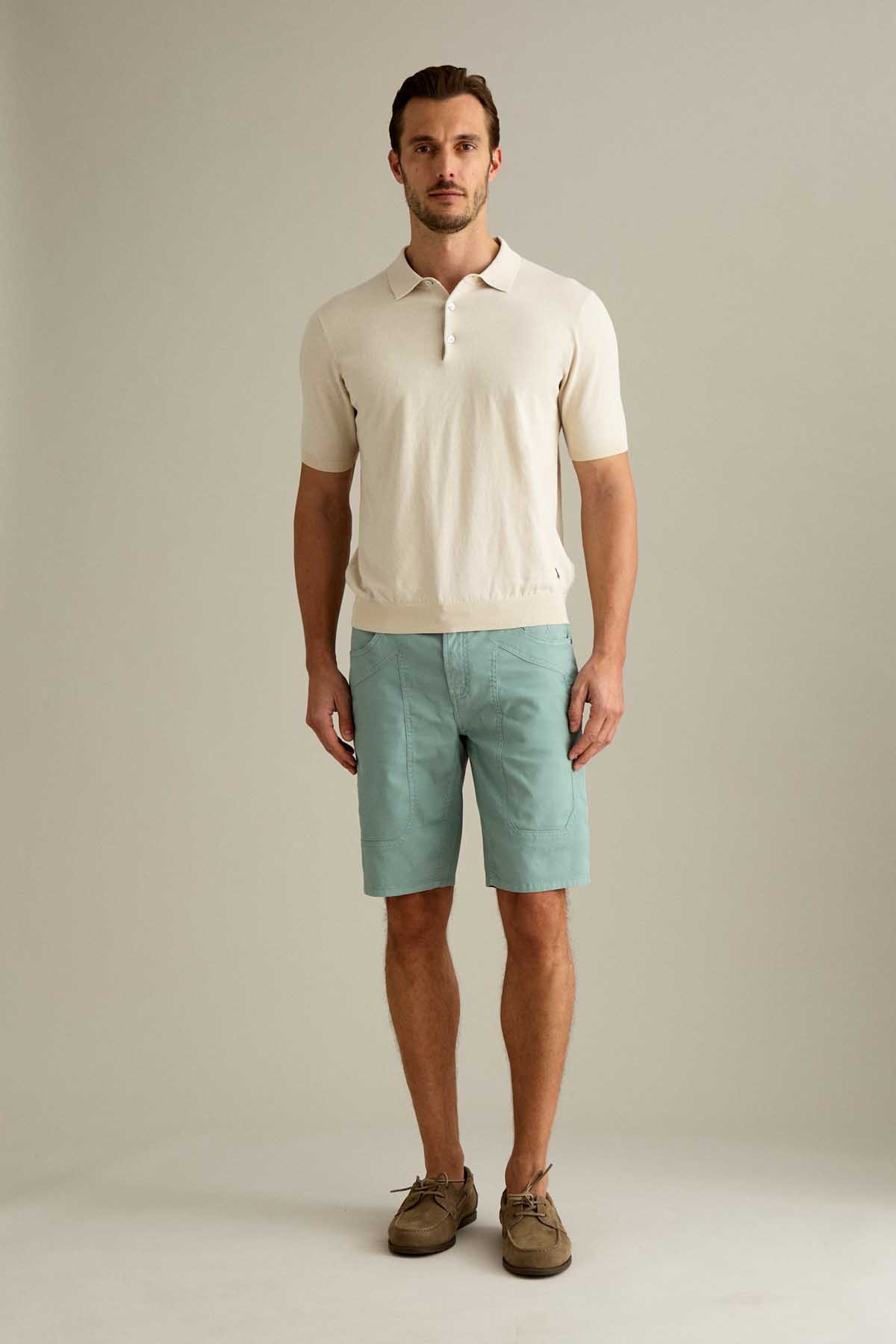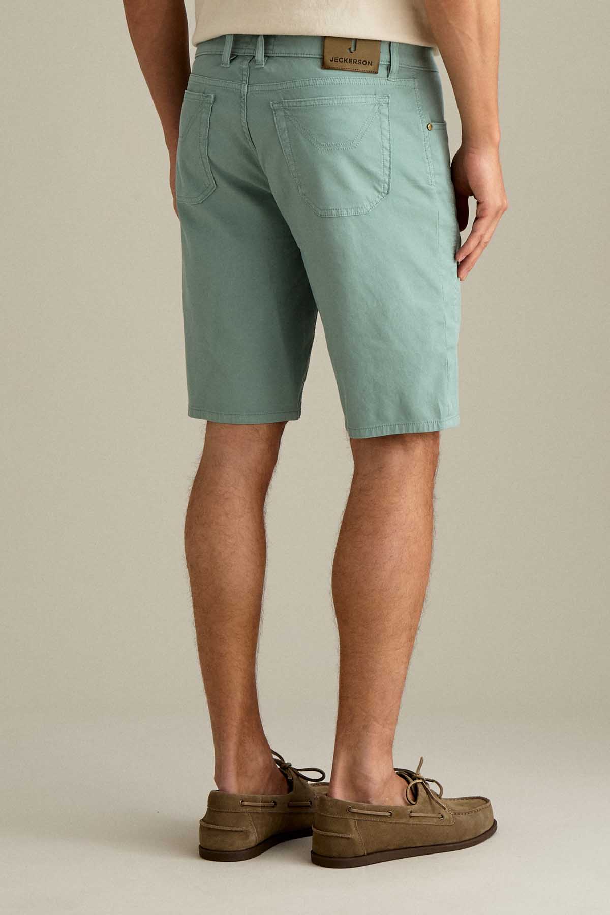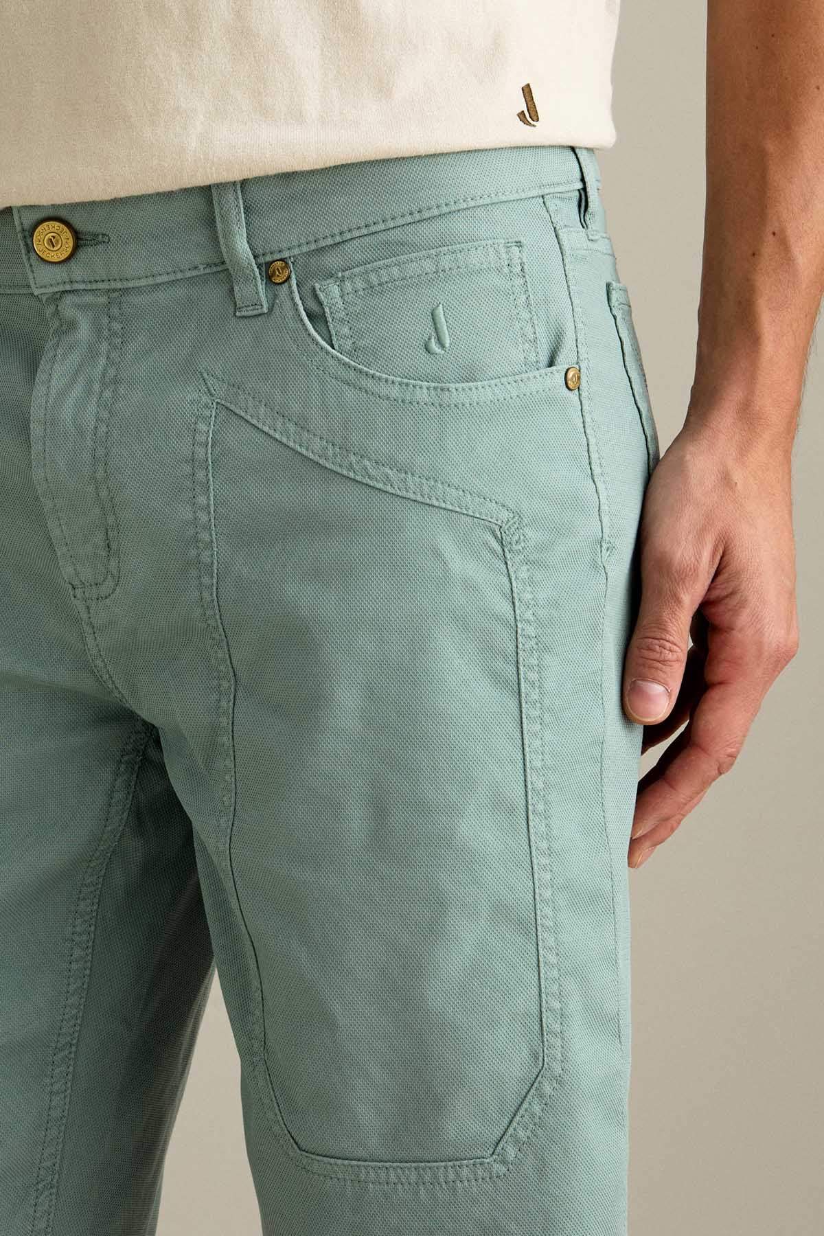 Il bermuda Jayden 5 tasche slim fit, con iconico inserto toppa, è ideale per uno stile estivo moderno e versatile. Realizzato in armatura comfort micro nido d’ape, assicura leggerezza, traspirabilità e comfort durante tutta la giornata. Tinto in capo nella tonalità Verde Pastello, per un’estetica fresca e contemporanea. Dotato di chiusura con zip e bottone, è completato da salpa in pelle, bottone in vita e rivetti personalizzati in finitura ottone.