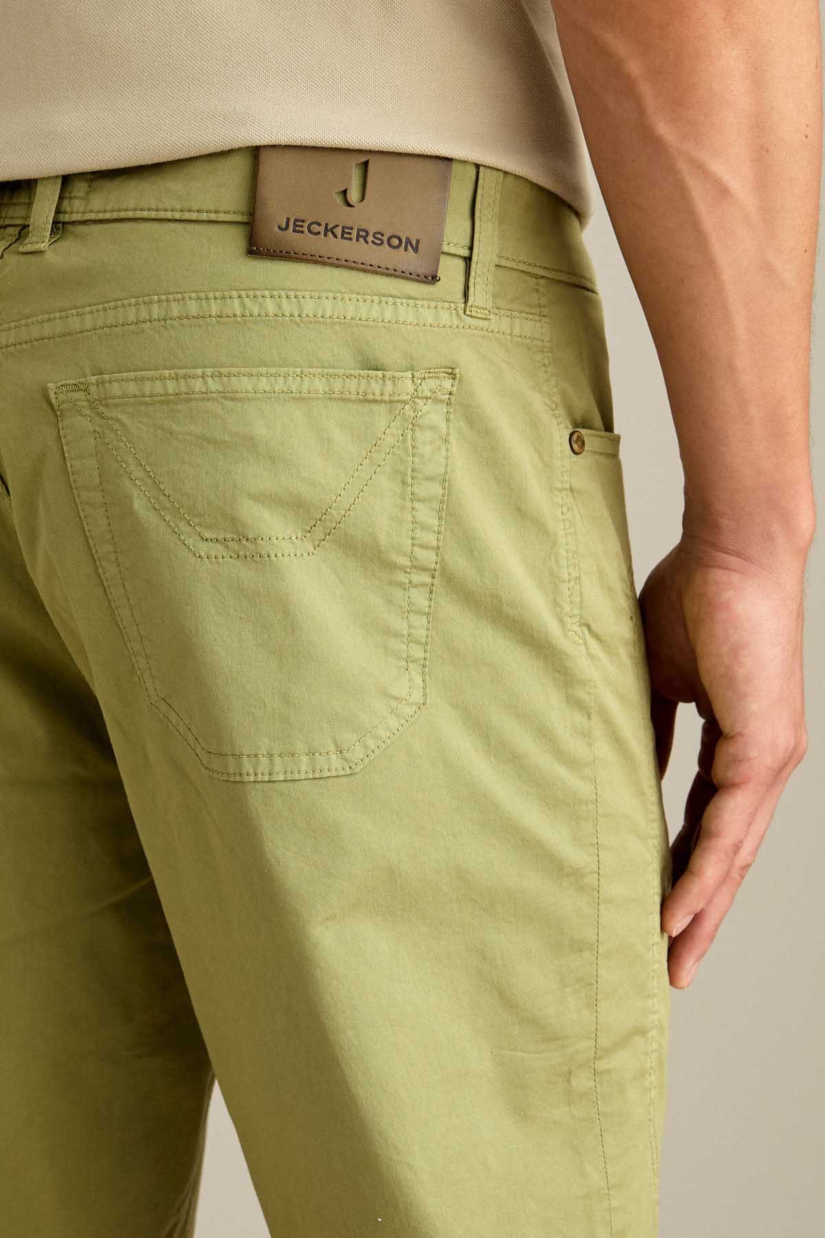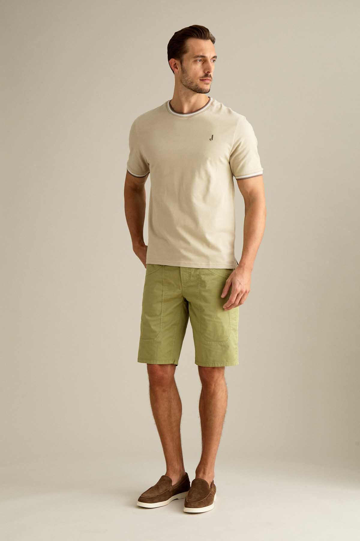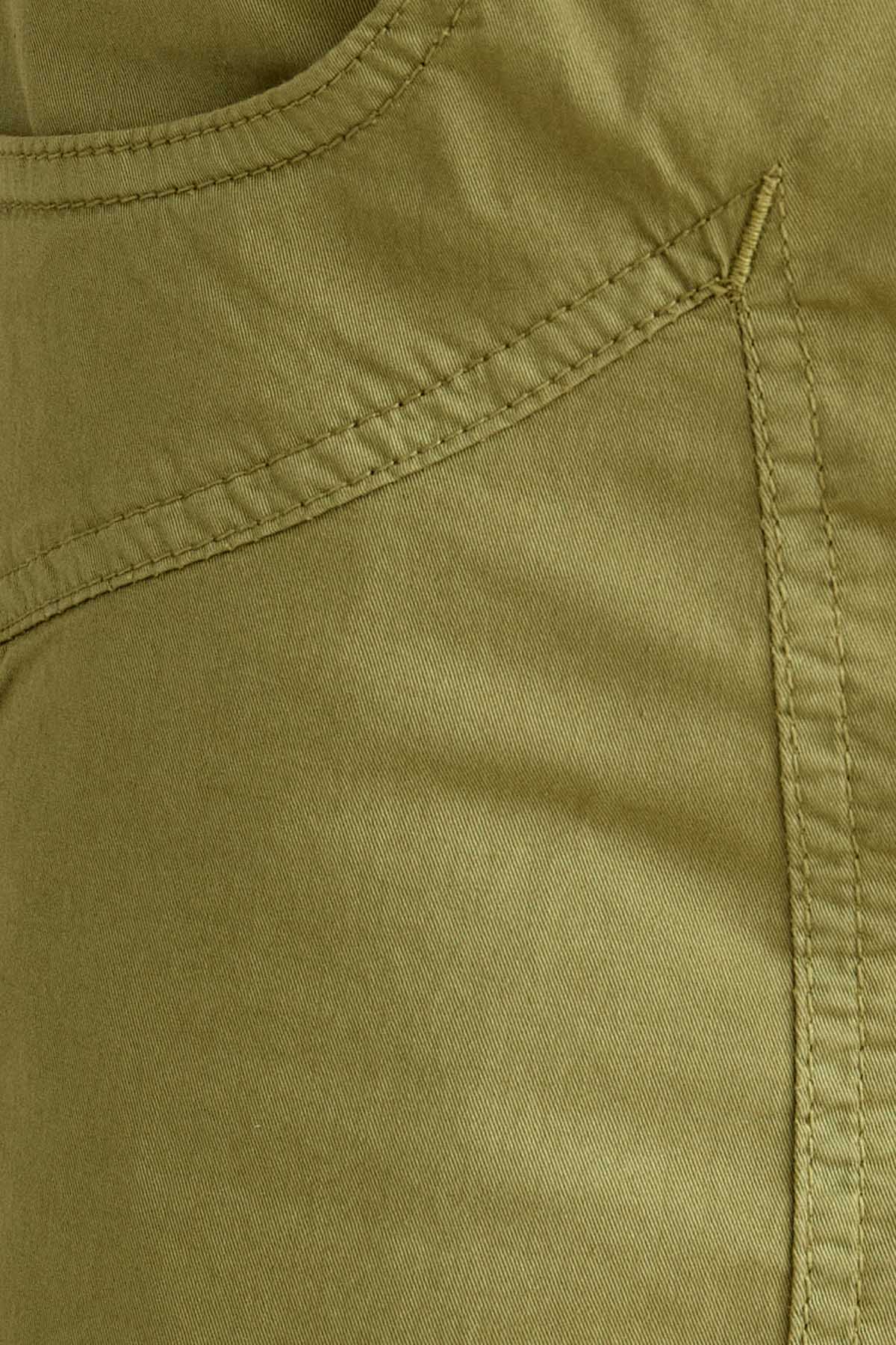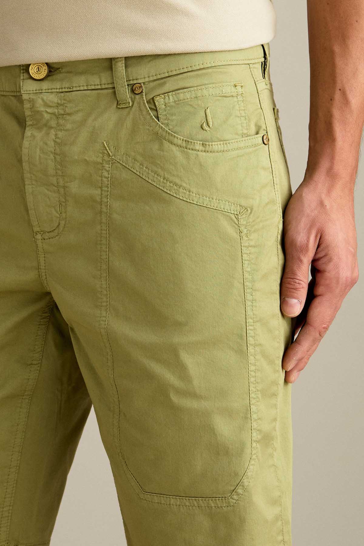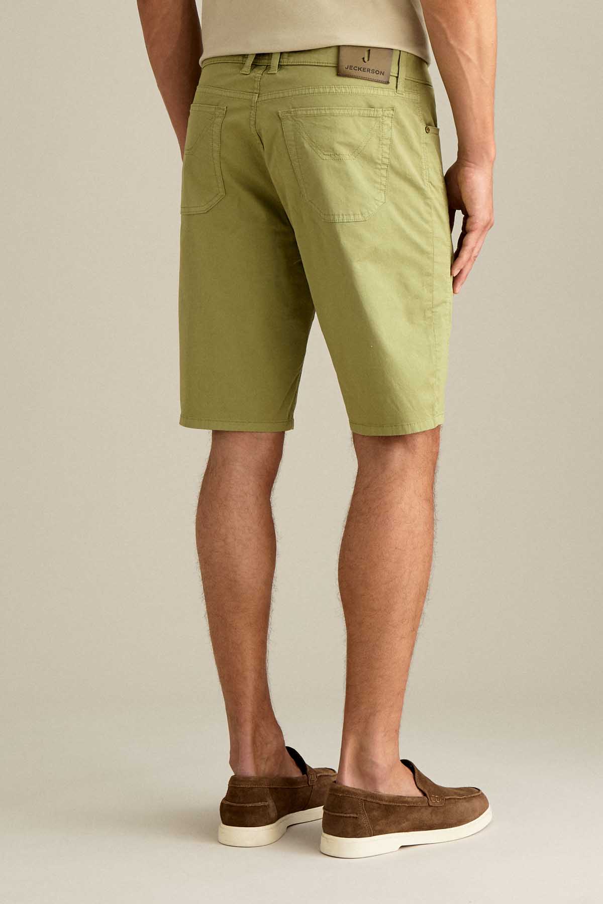 Il bermuda 5 tasche slim fit con iconico inserto toppa è ideale per un look estivo moderno e versatile. Realizzato in gabardina light comfort, assicura leggerezza, traspirabilità e comfort per tutta la giornata. Tinto in capo nella tonalità Verde Salvia, dona al capo un aspetto naturale e sofisticato. Dotato di chiusura con zip e bottone, è completato da salpa logata in pelle, bottone in vita e rivetti in finitura ottone opaco.