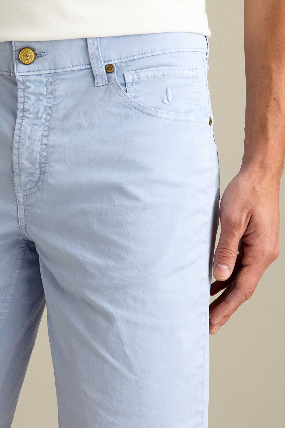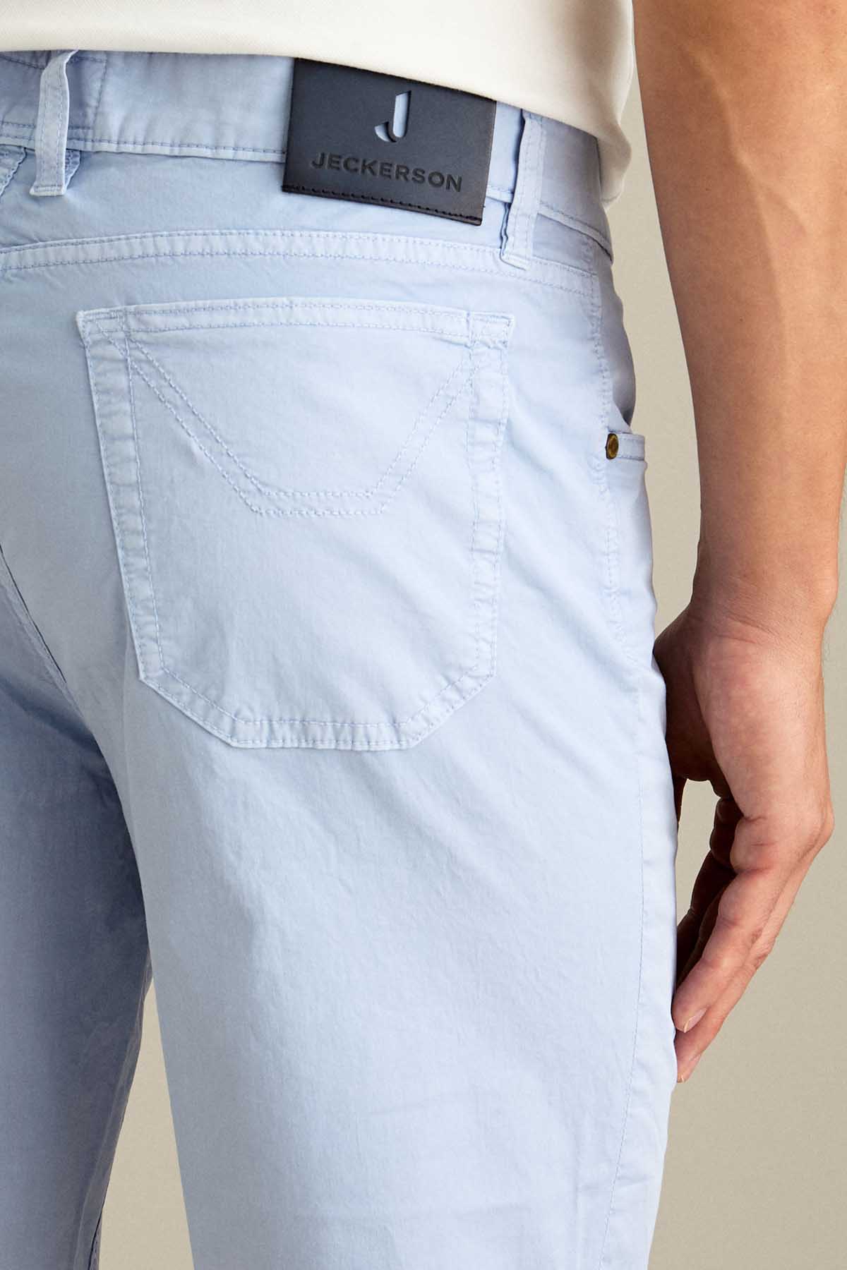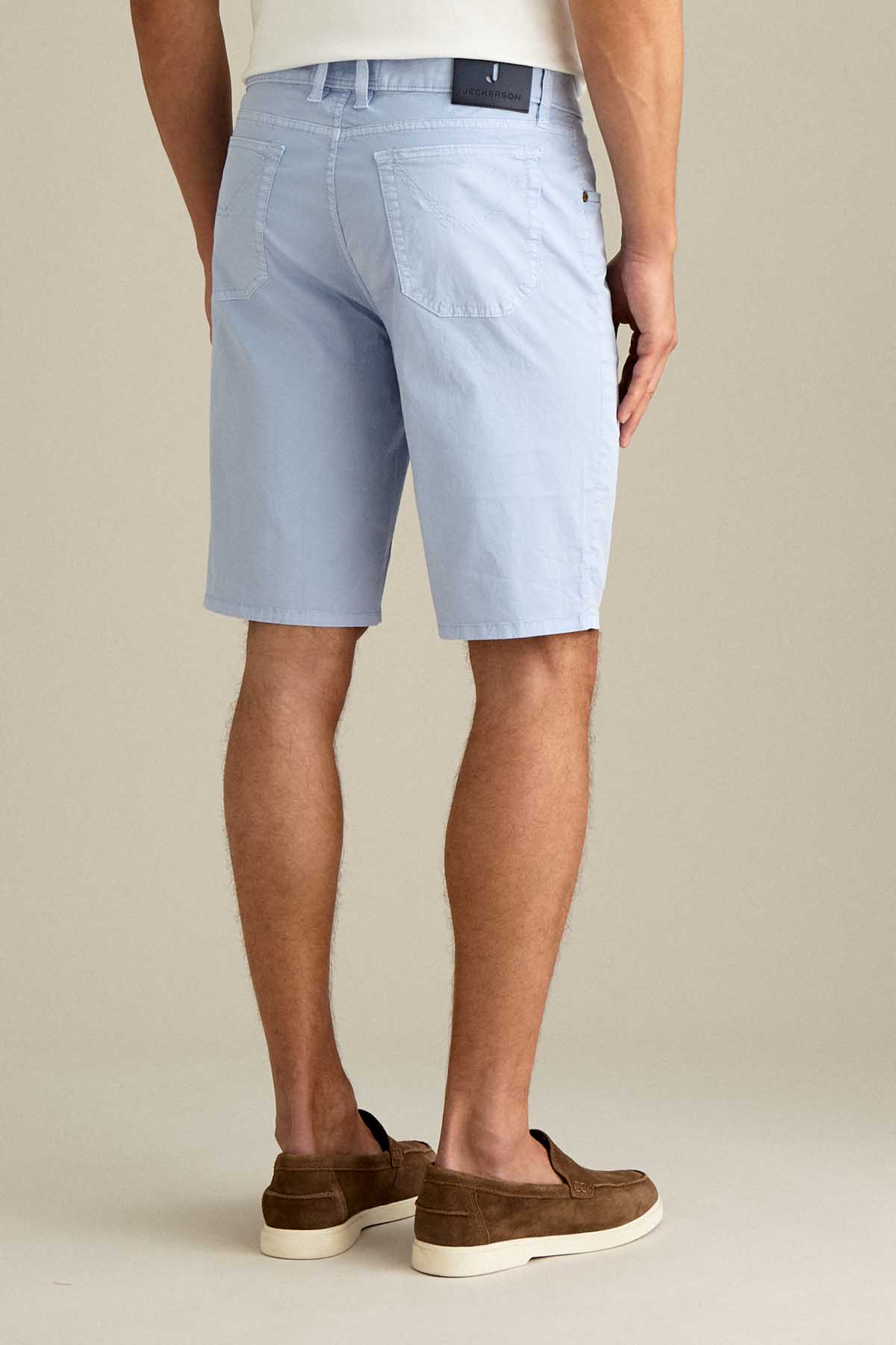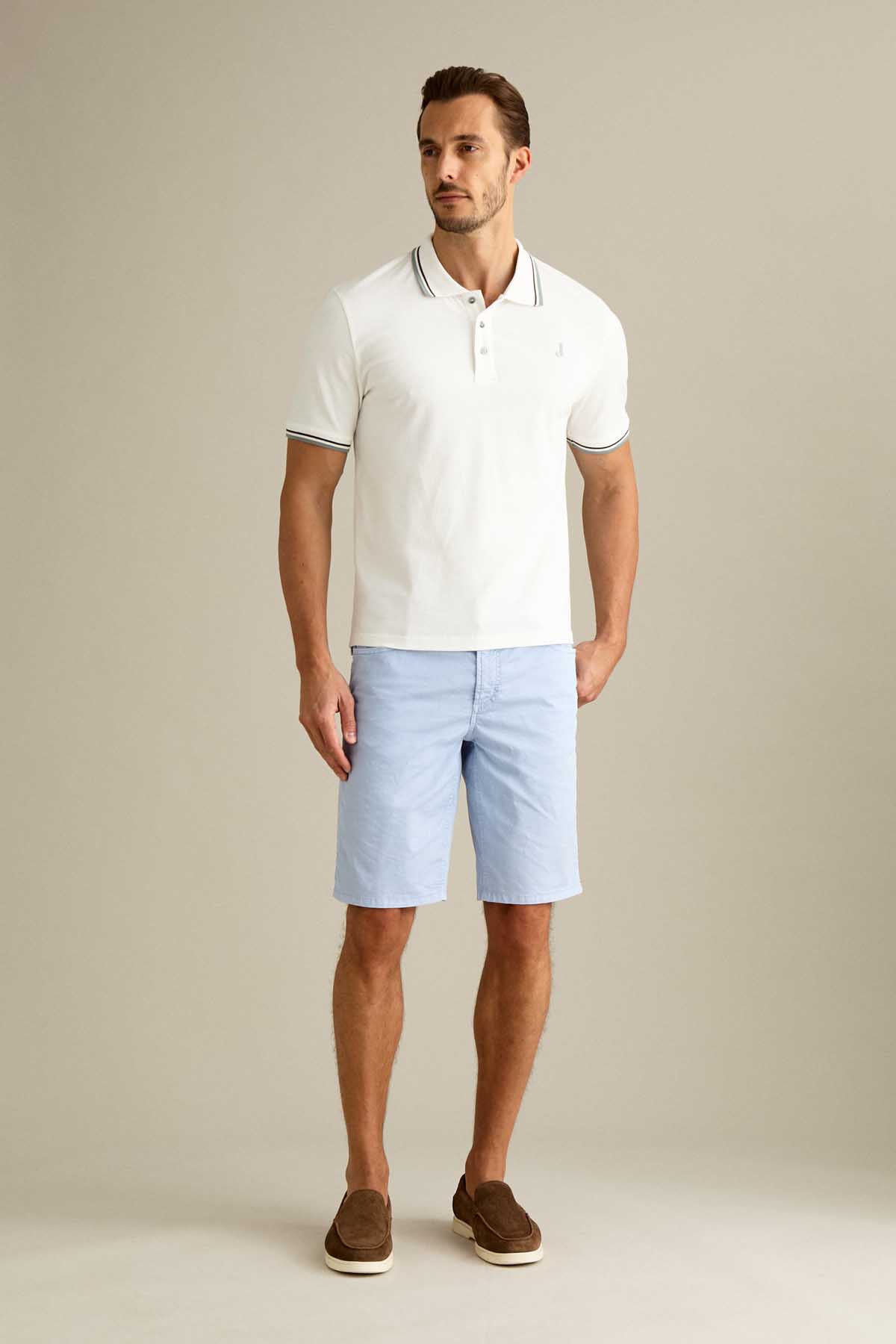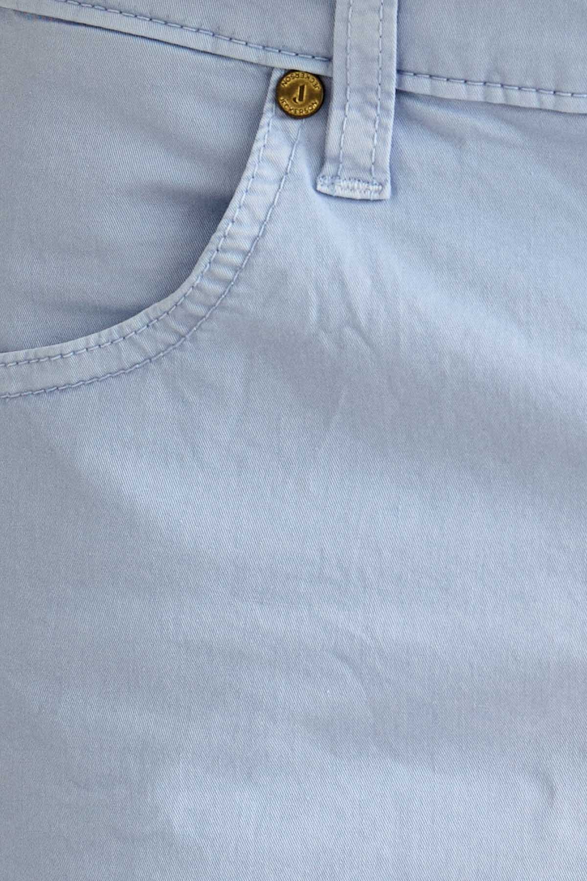 Il bermuda Jo’ 5 tasche slim fit è ideale per uno stile estivo moderno e versatile. Realizzato in gabardina light comfort, assicura leggerezza, traspirabilità e comfort durante tutta la giornata. Tinto in capo nella tonalità Azzurro Chiaro, dona un’estetica fresca e luminosa. Dotato di chiusura con zip e bottone, è completato da salpa in pelle logata, bottone in vita e rivetti in finitura ottone opaco con loghi a rilievo.