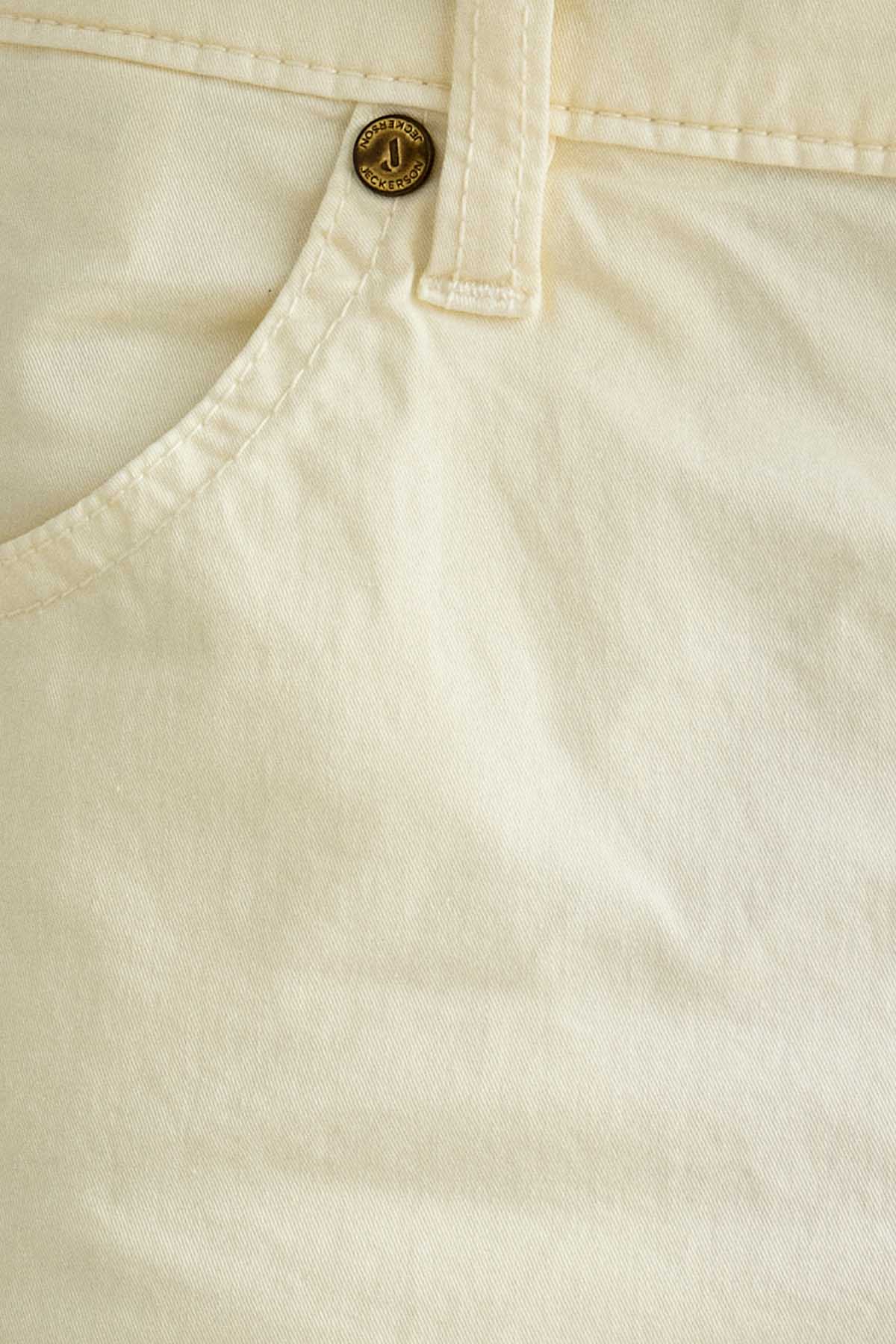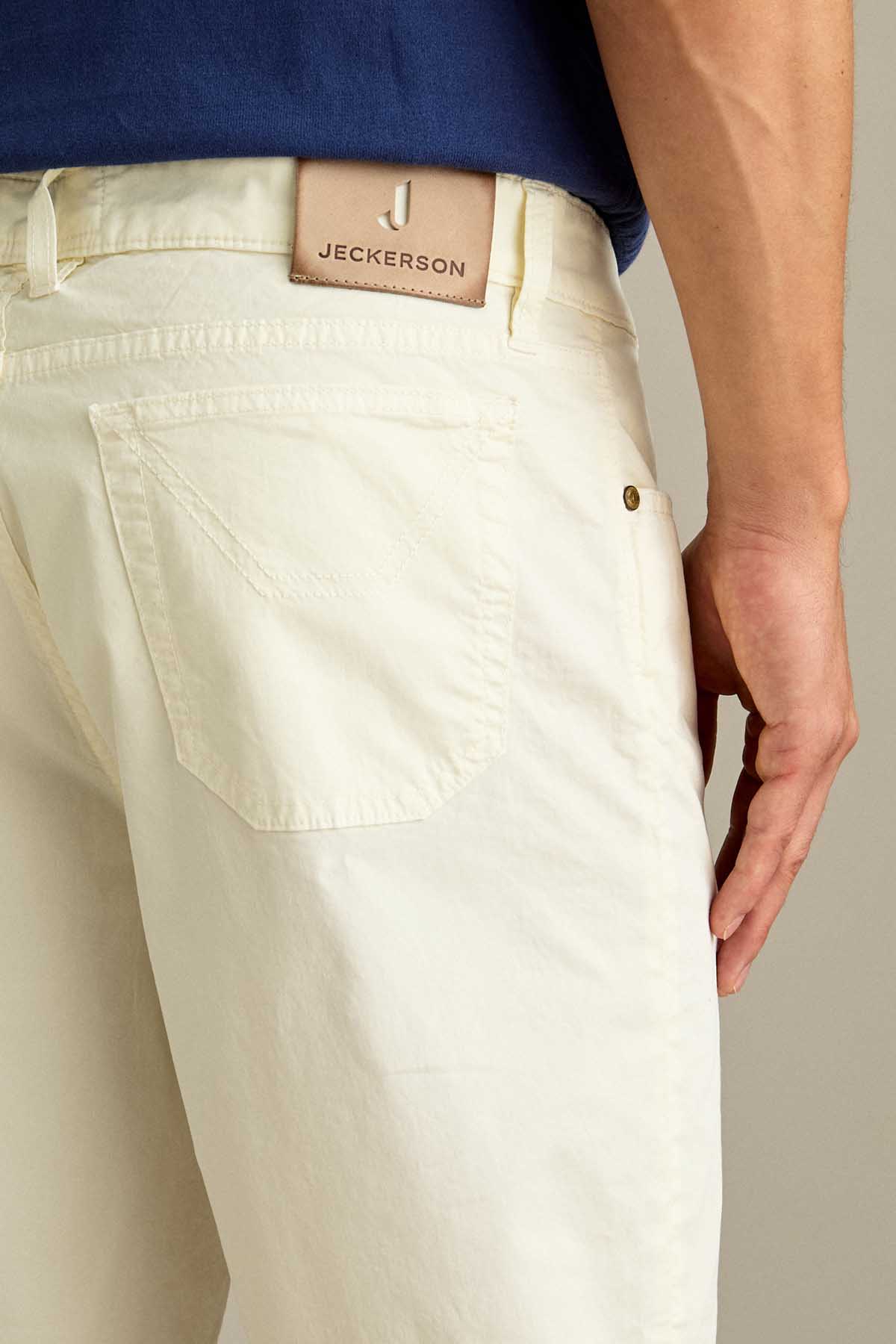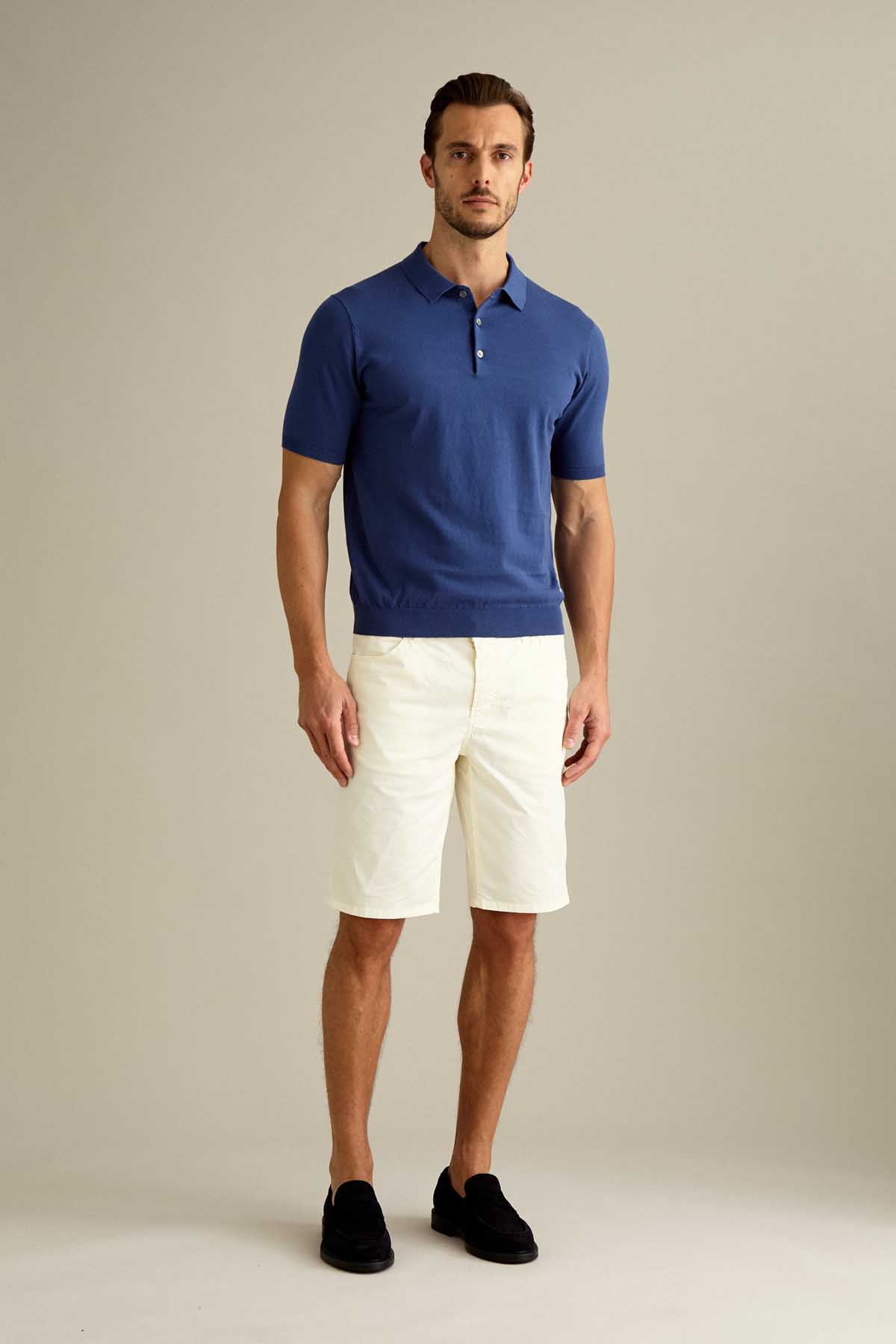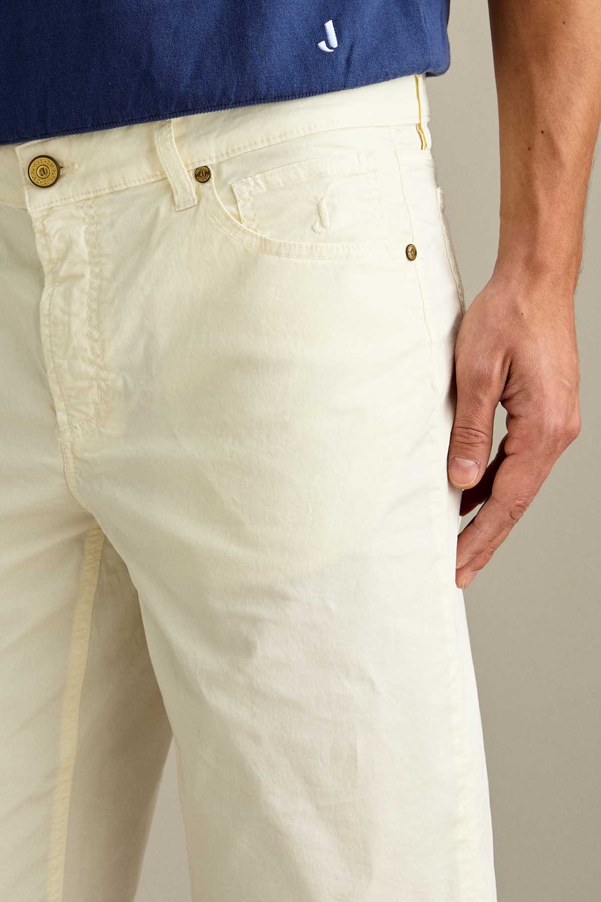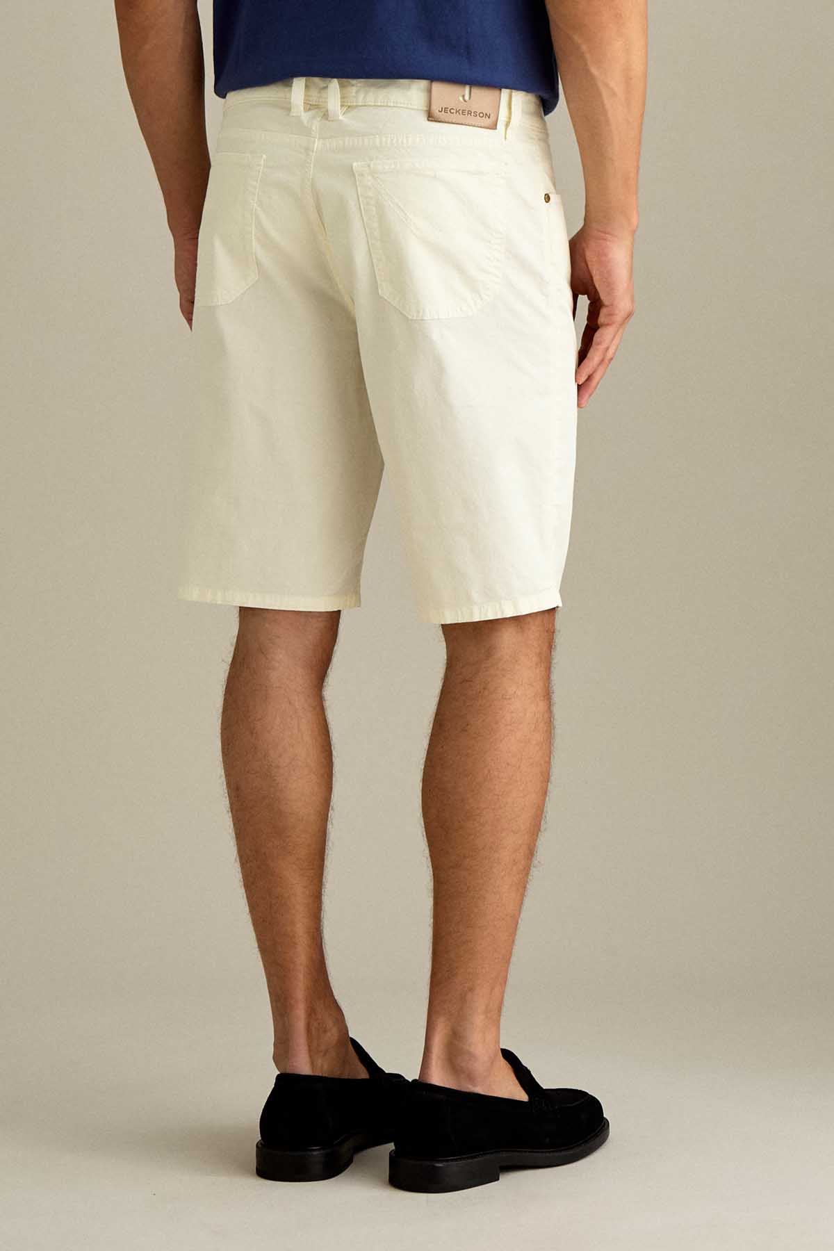 Il bermuda Jo’ 5 tasche slim fit è ideale per uno stile estivo moderno e versatile. Realizzato in gabardina light comfort, assicura leggerezza, traspirabilità e comfort durante tutta la giornata. Tinto in capo nella tonalità Bianco Neve, dona un’estetica fresca e contemporanea. Dotato di chiusura con zip e bottone, è completato da salpa in pelle logata, bottone in vita e rivetti in finitura ottone opaco con loghi a rilievo.