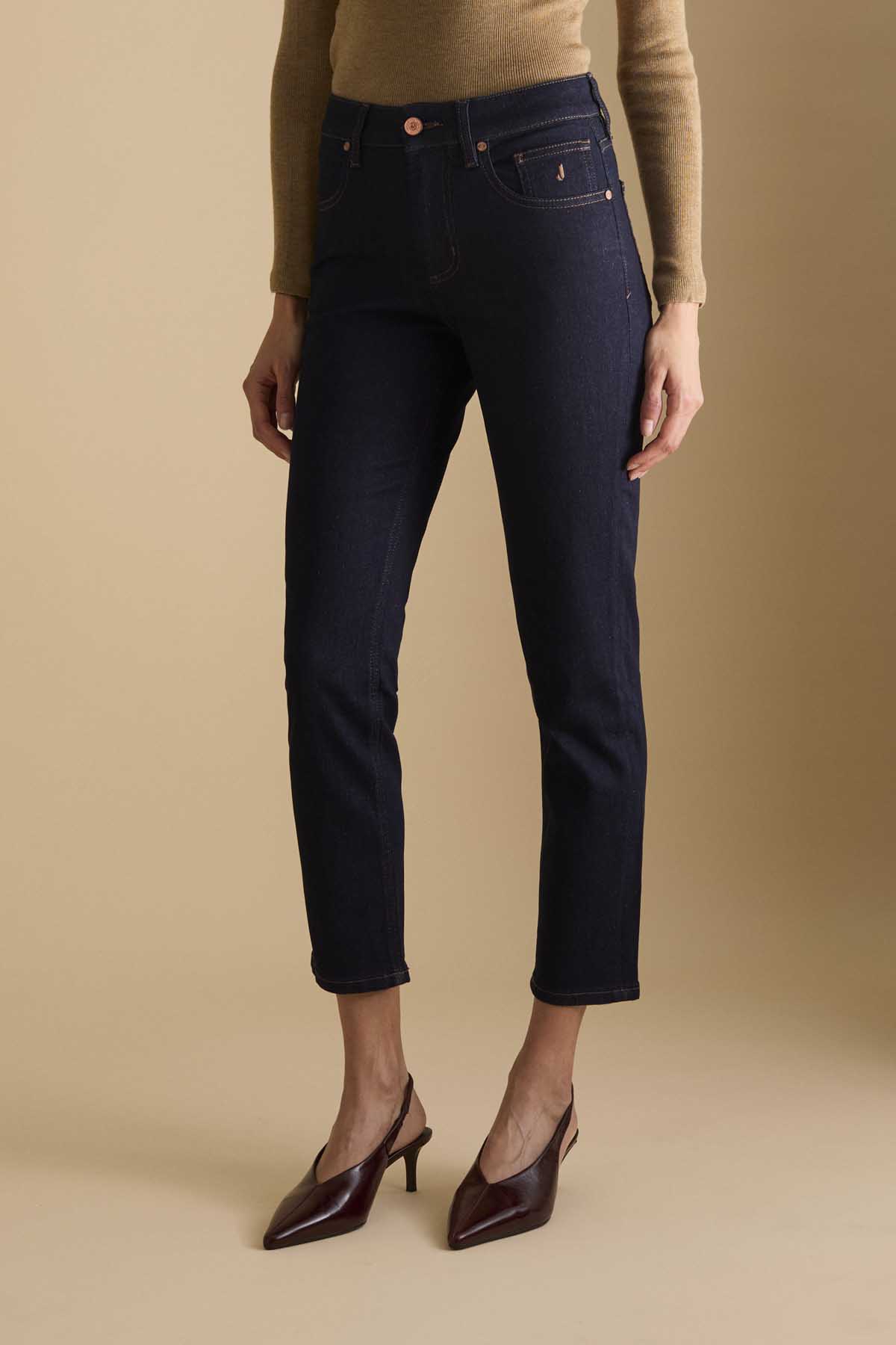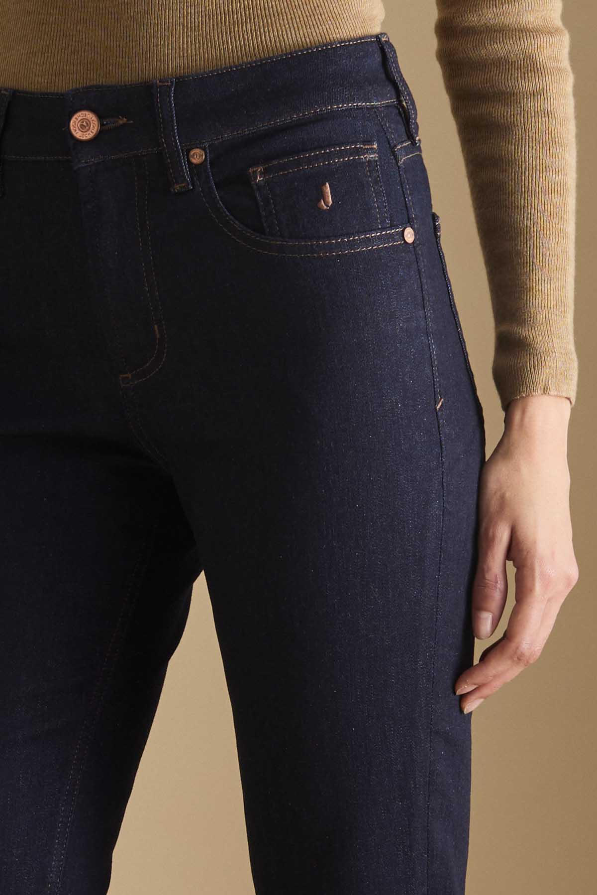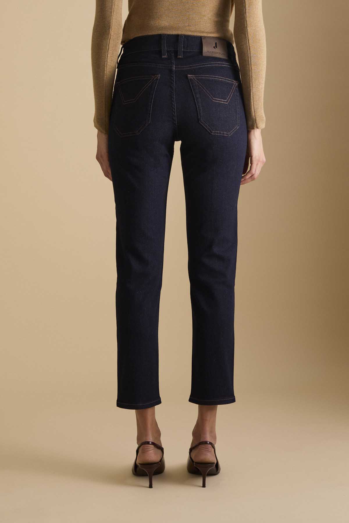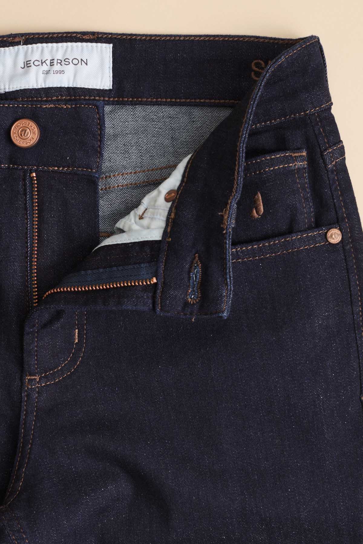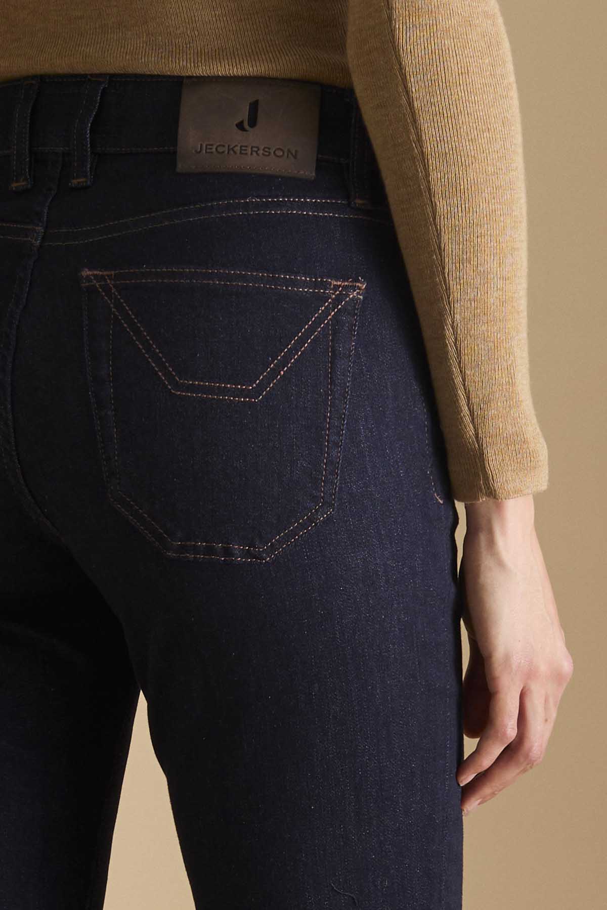 Pantalone 5 tasche slim fit, realizzato in denim stretch tri blend base blu . Lavaggio blu rinse. Gli accessori quali bottone e rivetti personalizzati sono in metallo galvanizzati in colore rame. Cuciture e i ricami del nome pantalone e fit interno cinta e ricamo logo J in taschino sono in colore tabacco . Salpa retrocinta in pelle in colore marrone con marchio inciso.