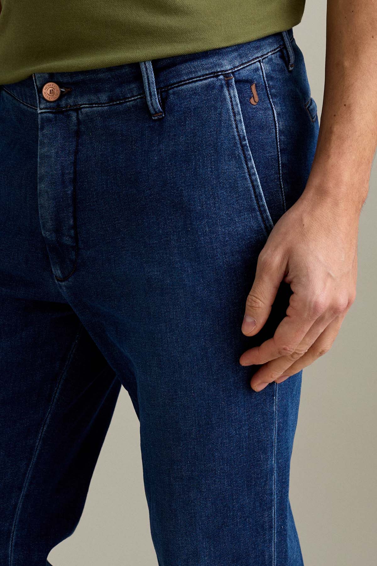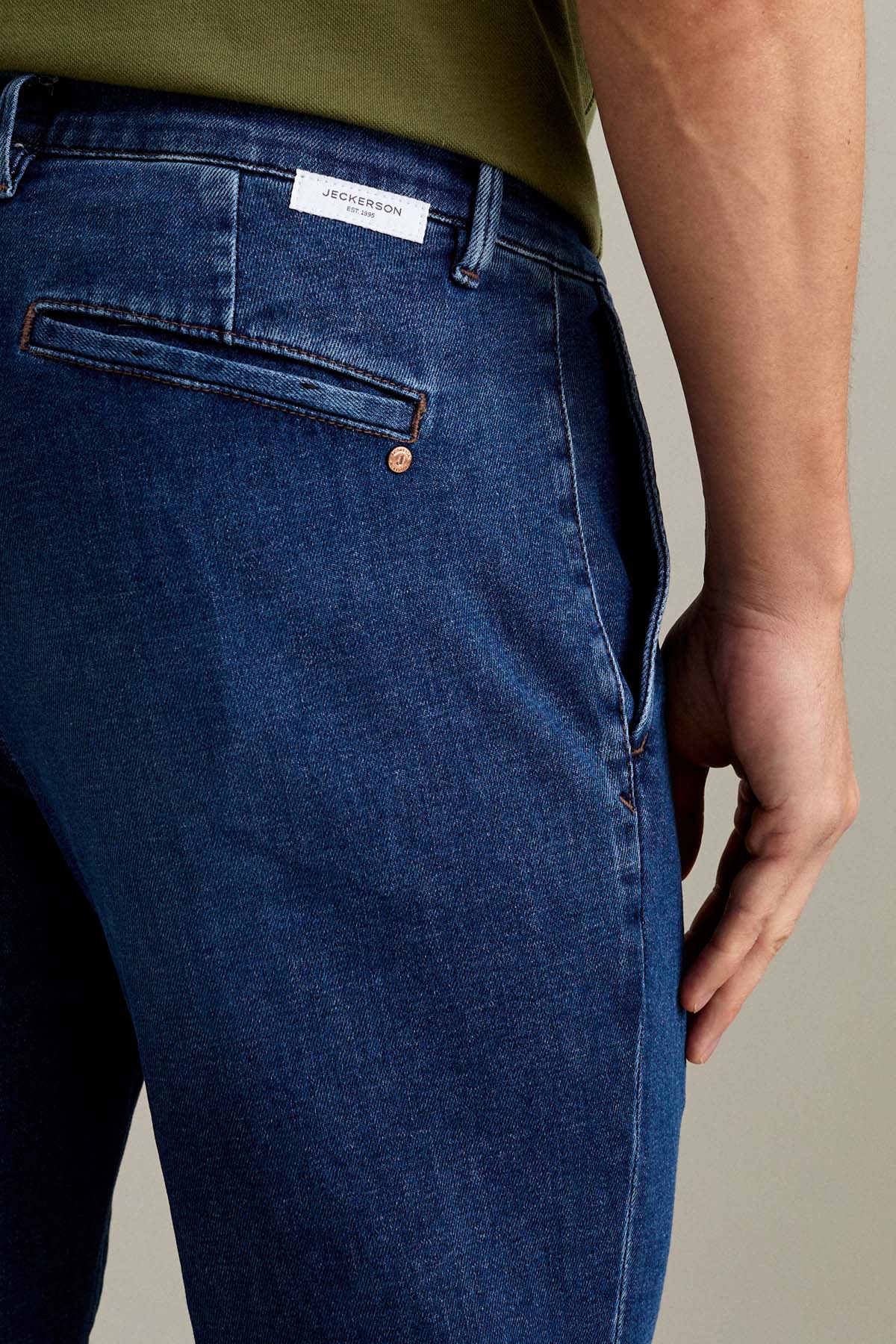 Il pantalone Jack chino slim fit interpreta uno stile moderno e contemporaneo, con una vestibilità asciutta e linee pulite. Realizzato in denim base blu comfort, altamente performante, in colore blu medio scuro, è ideale per un utilizzo quotidiano versatile.