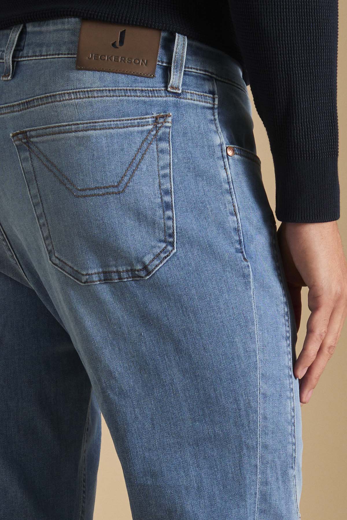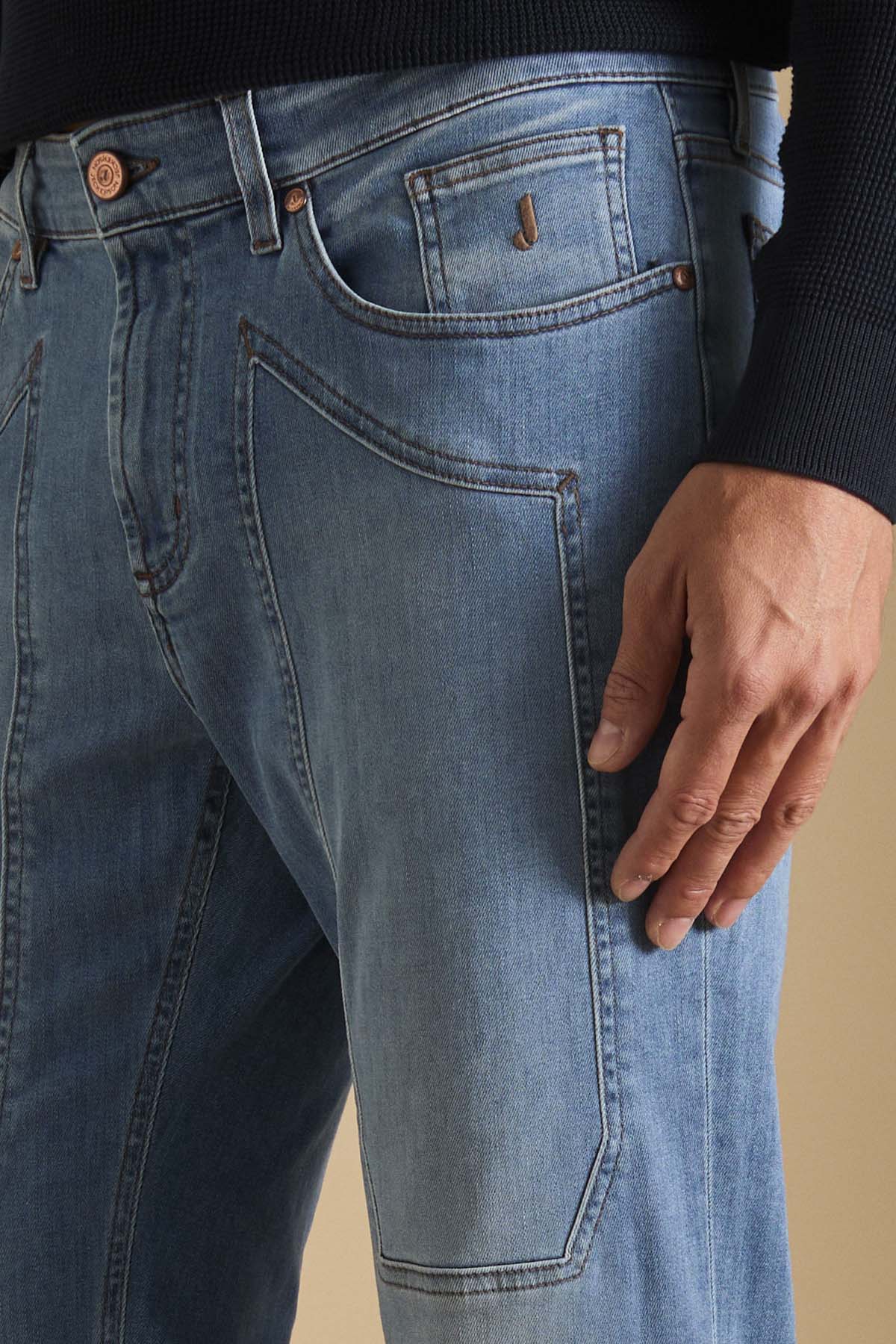 John pantalone 5 tasche con inserto dell’iconico disegno toppa slim fit. Allacciatura con zip. Realizzato in denim super stretch base blu, denim morbido e con un buon recovery che permette al pantalone indossato di mantenere sempre la sua linea agevolando i movimenti. Il lavaggio conferisce al pantalone un colore blu di intensità medio chiara con lievi sabbiature sui punti di cucitura che conferiscono al pantalone un aspetto molto casual chic.