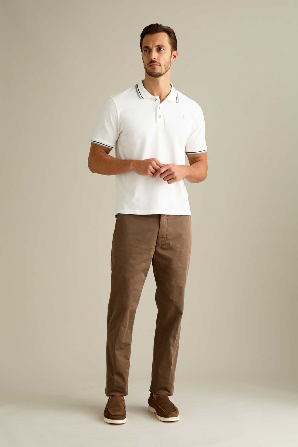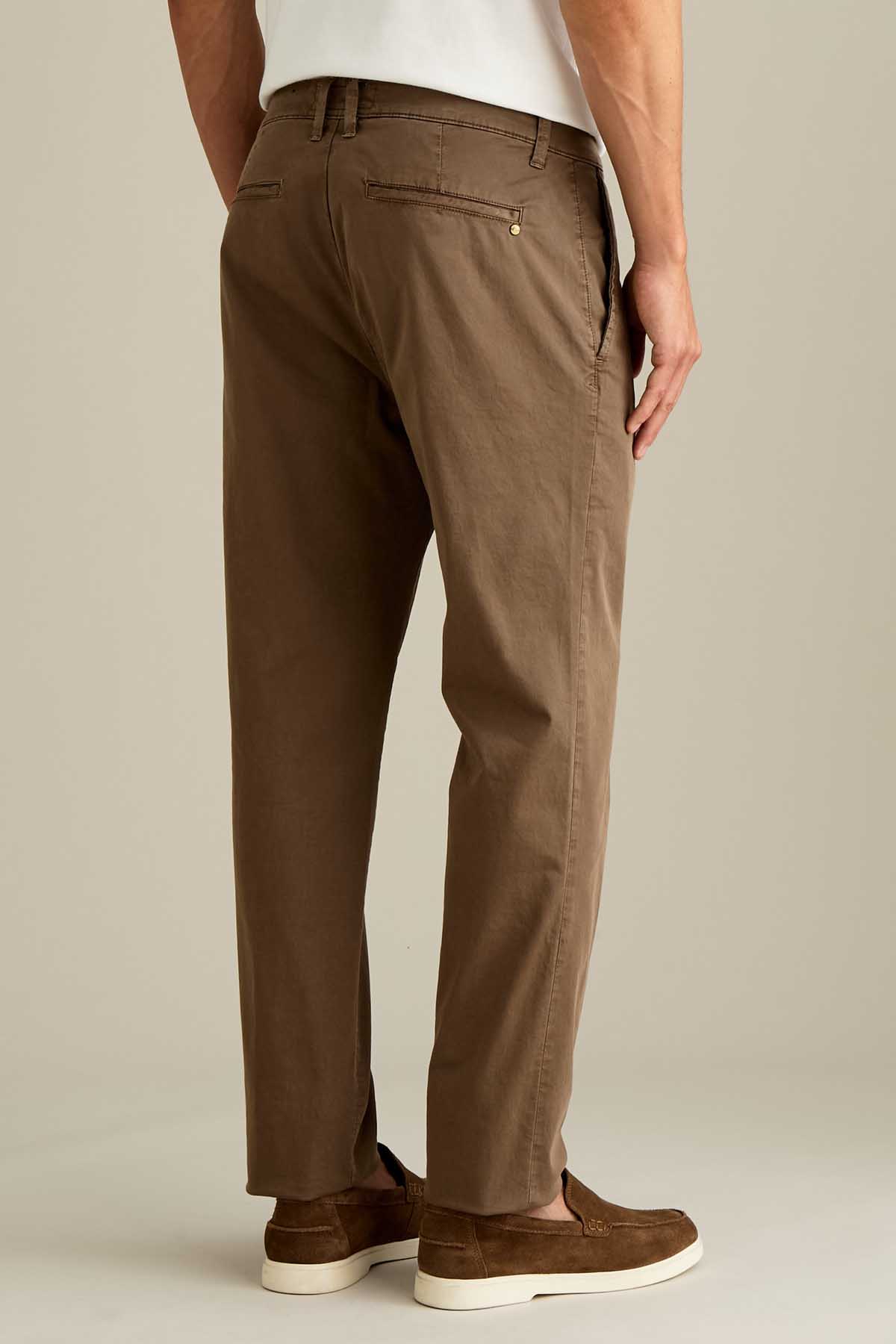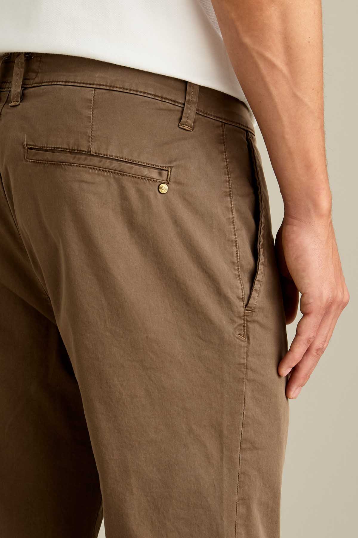 Il pantalone Jack chino slim fit è ideale per uno stile contemporaneo e versatile. Realizzato in raso comfort e sottoposto a lavaggio old, conferisce al capo un effetto tridimensionale e una mano piacevole al tatto. Proposto nella tonalità Marrone Chiaro, dona un’estetica calda e naturale. Dotato di chiusura con zip e bottone, è completato da salpa in pelle, bottone in vita e rivetto personalizzato in finitura ottone opaco.