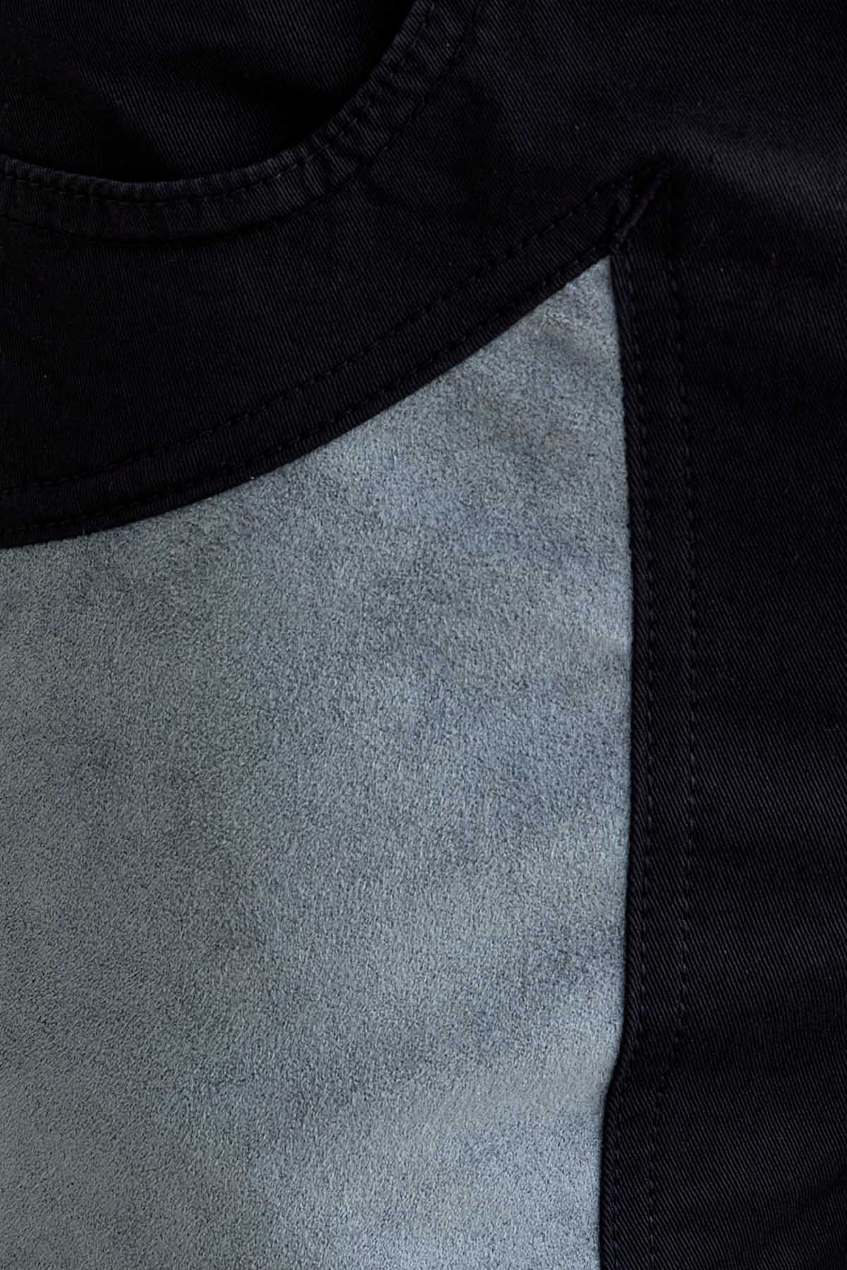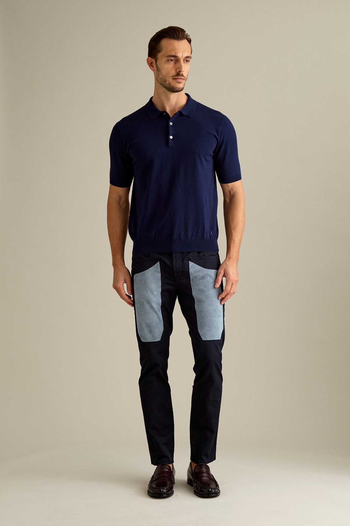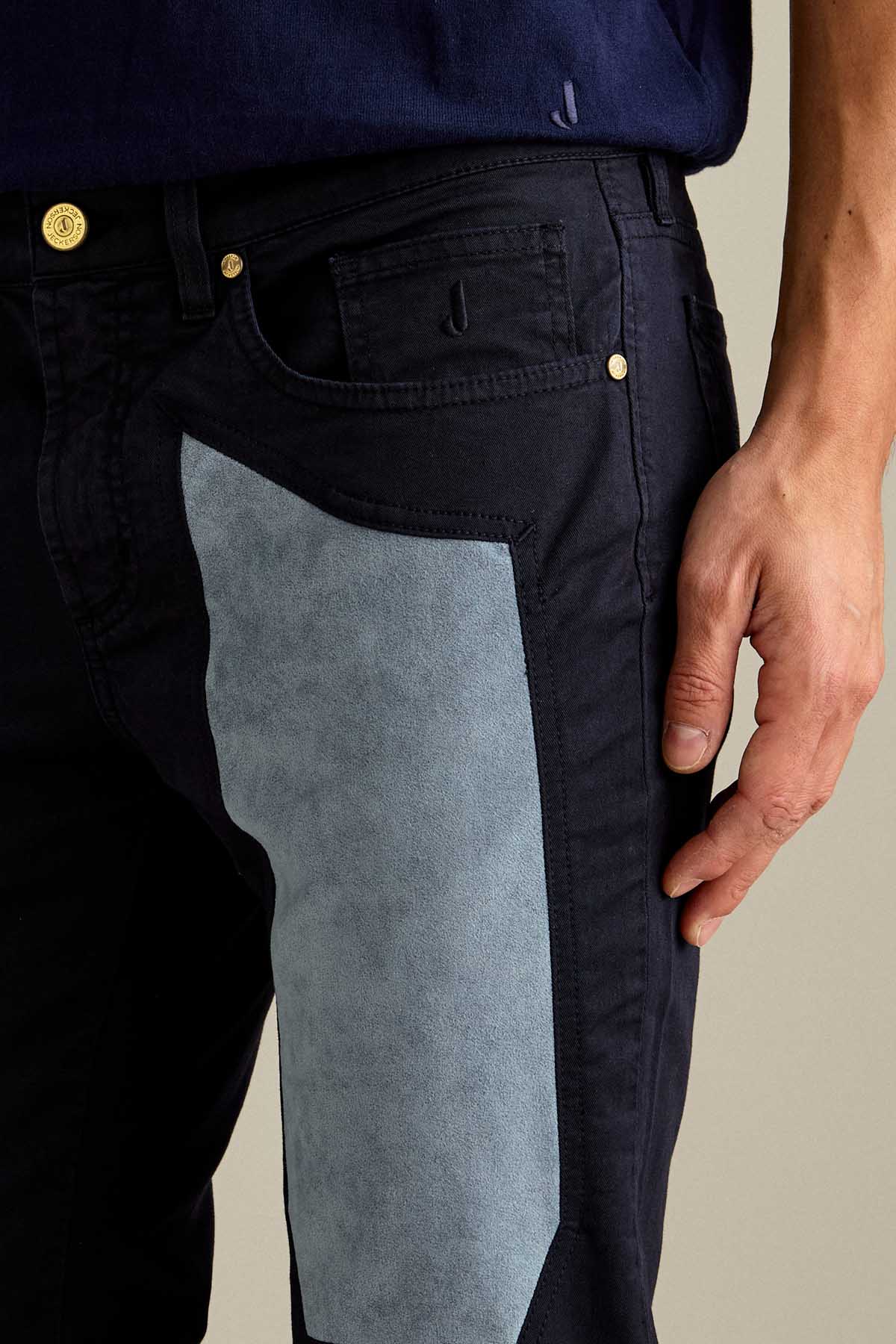 Il pantalone James 5 tasche slim fit, con iconico inserto toppa in Alcantara®, è ideale per uno stile contemporaneo e distintivo. Realizzato in gabardina comfort, assicura una piacevole vestibilità e comfort durante tutta la giornata. Proposto nella tonalità Blu Scuro, è caratterizzato da toppe in Alcantara® in un tono di blu chiaro effetto velluto, per un elegante contrasto materico. Dotato di chiusura con zip e bottone, è completato da salpa in pelle, bottone in vita e rivetti personalizzati in finitura ottone.