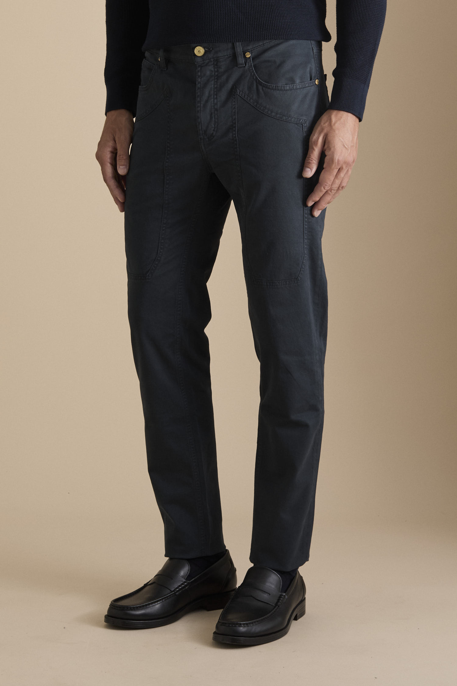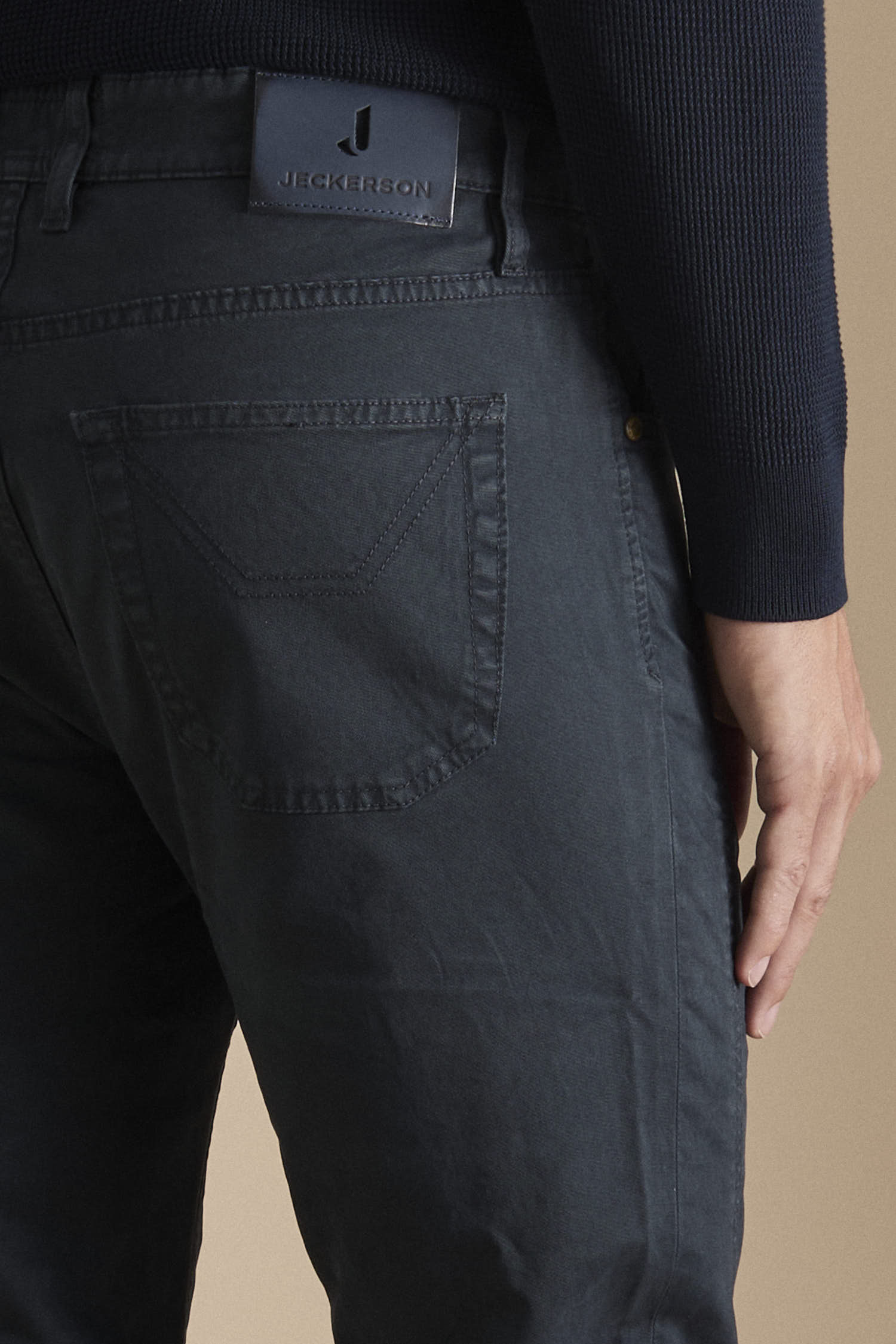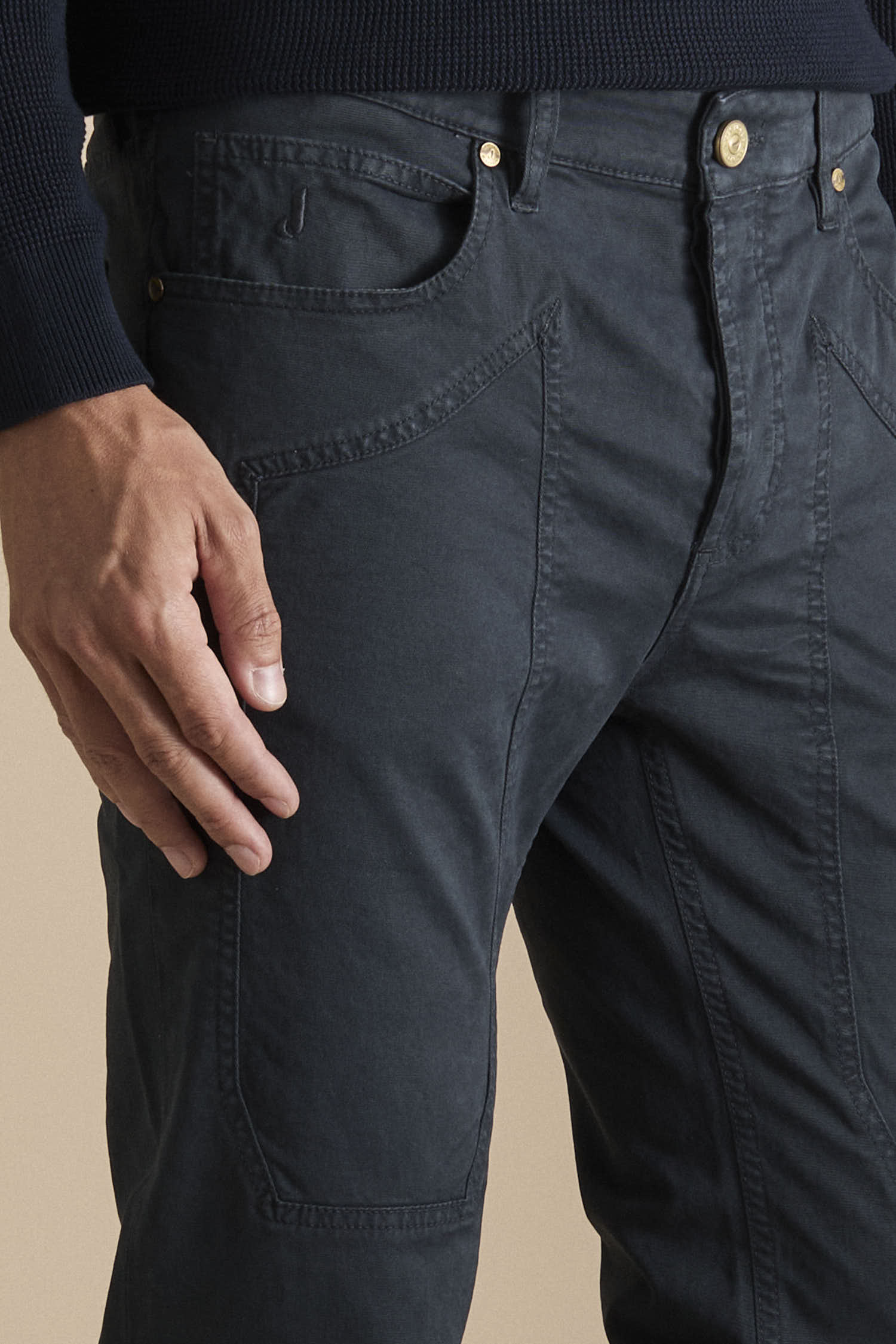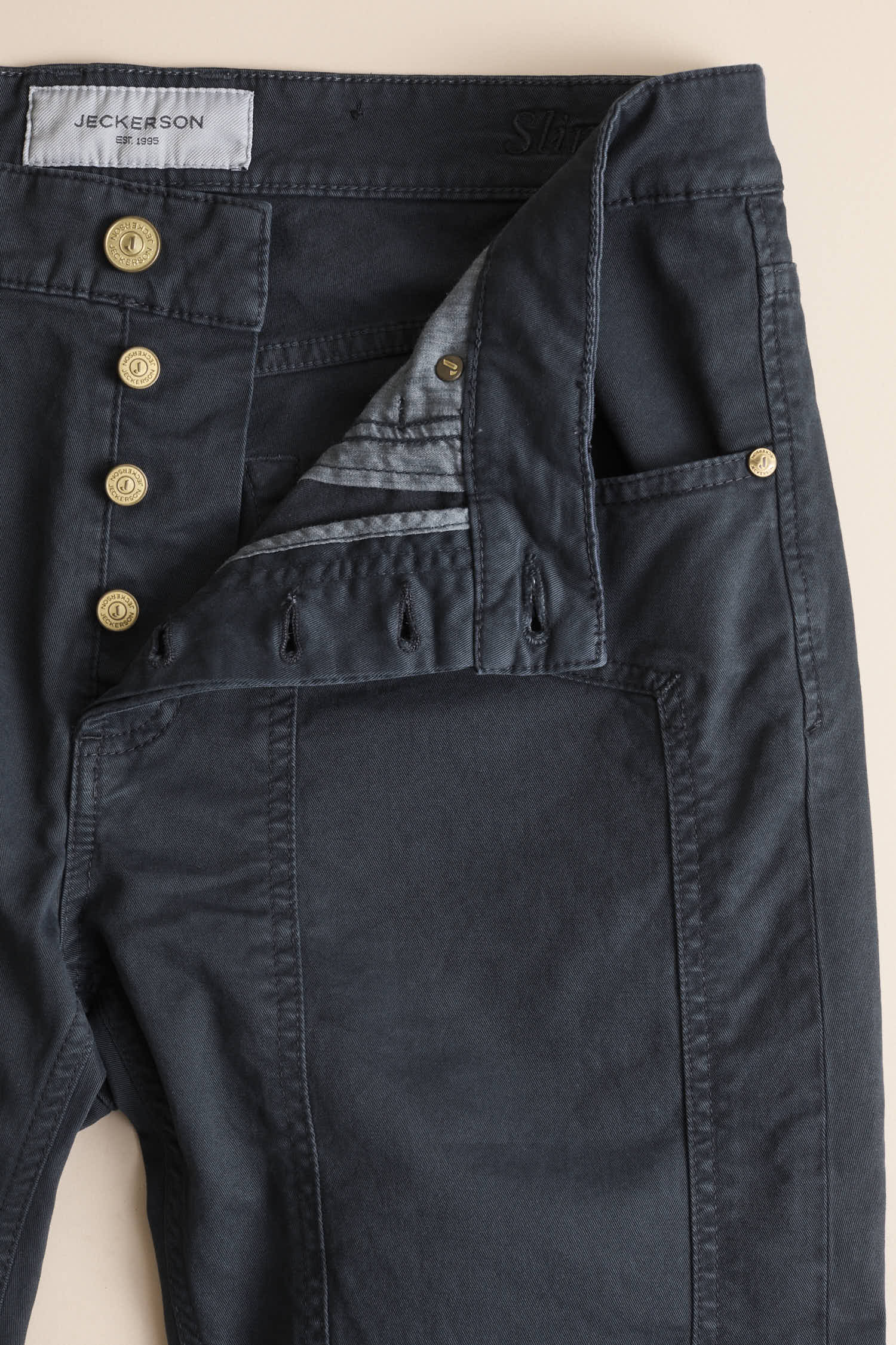 Jax pantalone 5 tasche con inserto disegno iconico toppa slim fit. Allacciatura con bottoni. Realizzato in gabardina stretch di cotone dalla mano peach skin, un tessuto compatto e resistente con un elevato recovery che perfette al pantalone indossato di mantenere sempre la sua linea agevolando i movimenti.