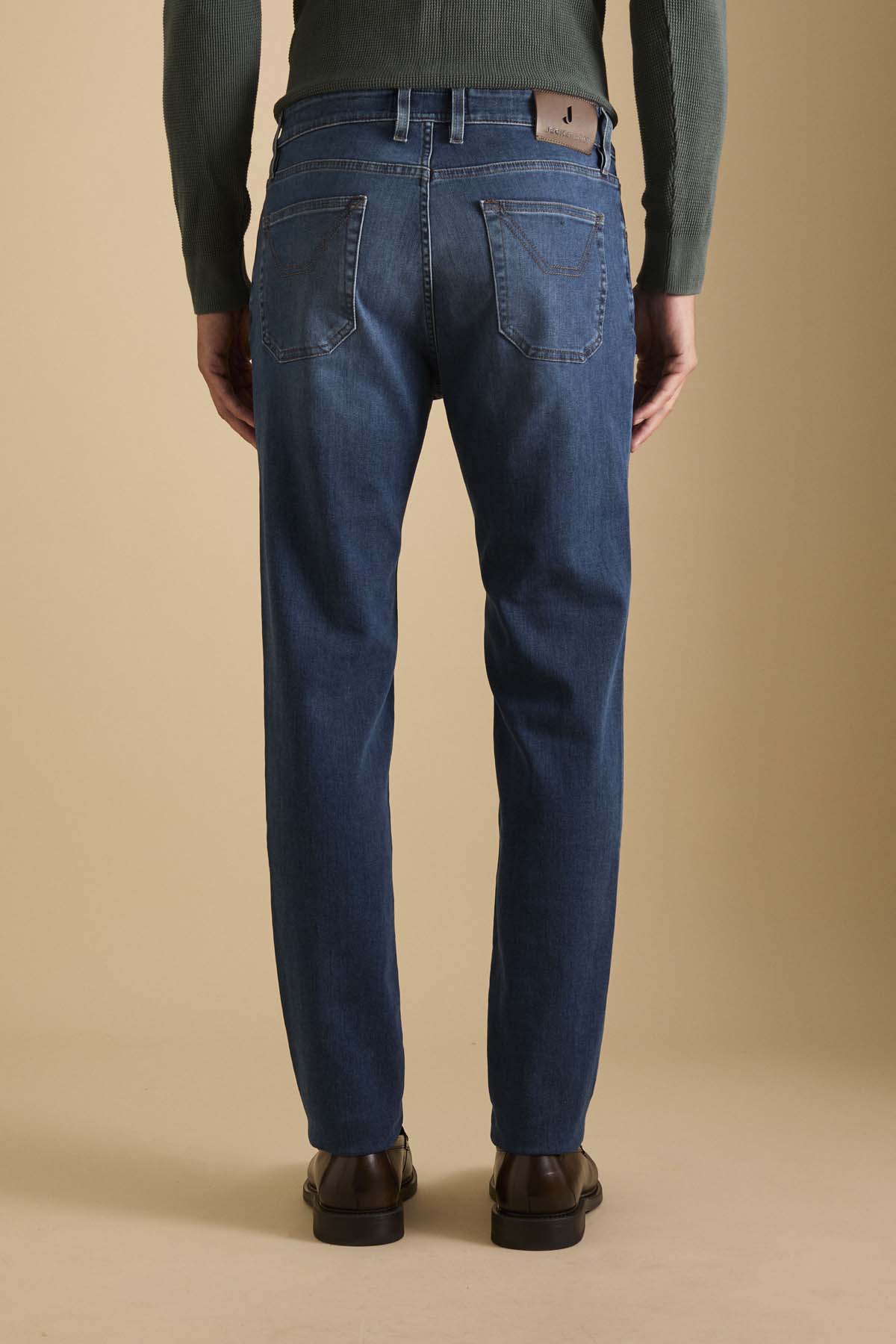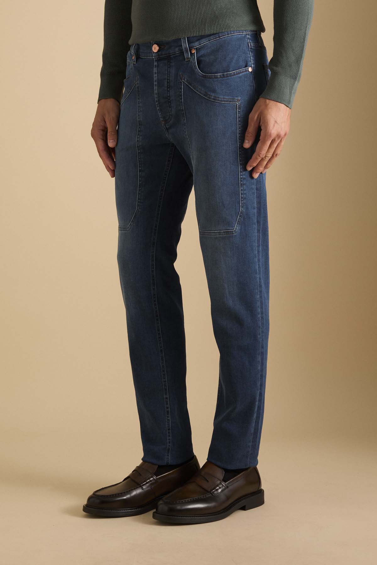 Jax pantalone 5 tasche con inserto dell’iconico disegno toppa slim fit. Allacciatura con bottoni. Realizzato in denim super stretch base blu, denim morbido e con un buon recovery che permette al pantalone indossato di mantenere sempre la sua linea agevolando i movimenti. Il lavaggio conferisce al pantalone un colore blu di media intensità con lievi sabbiature sui punti di cucitura che conferiscono al pantalone un aspetto molto casual chic.