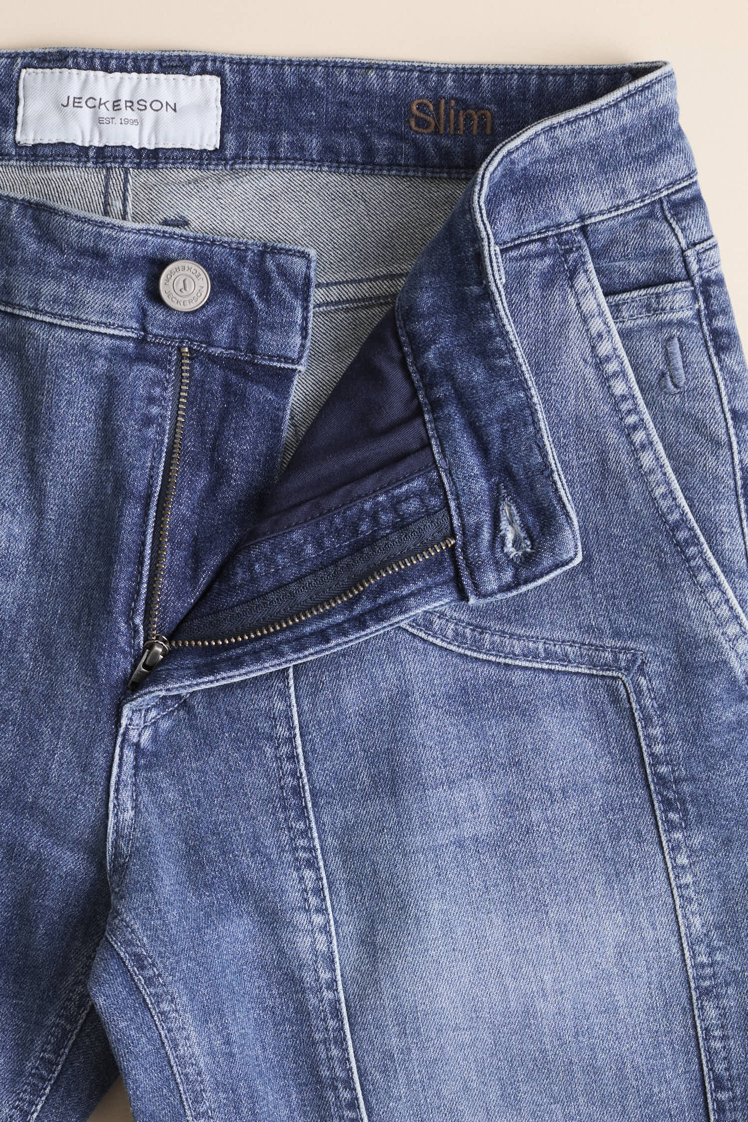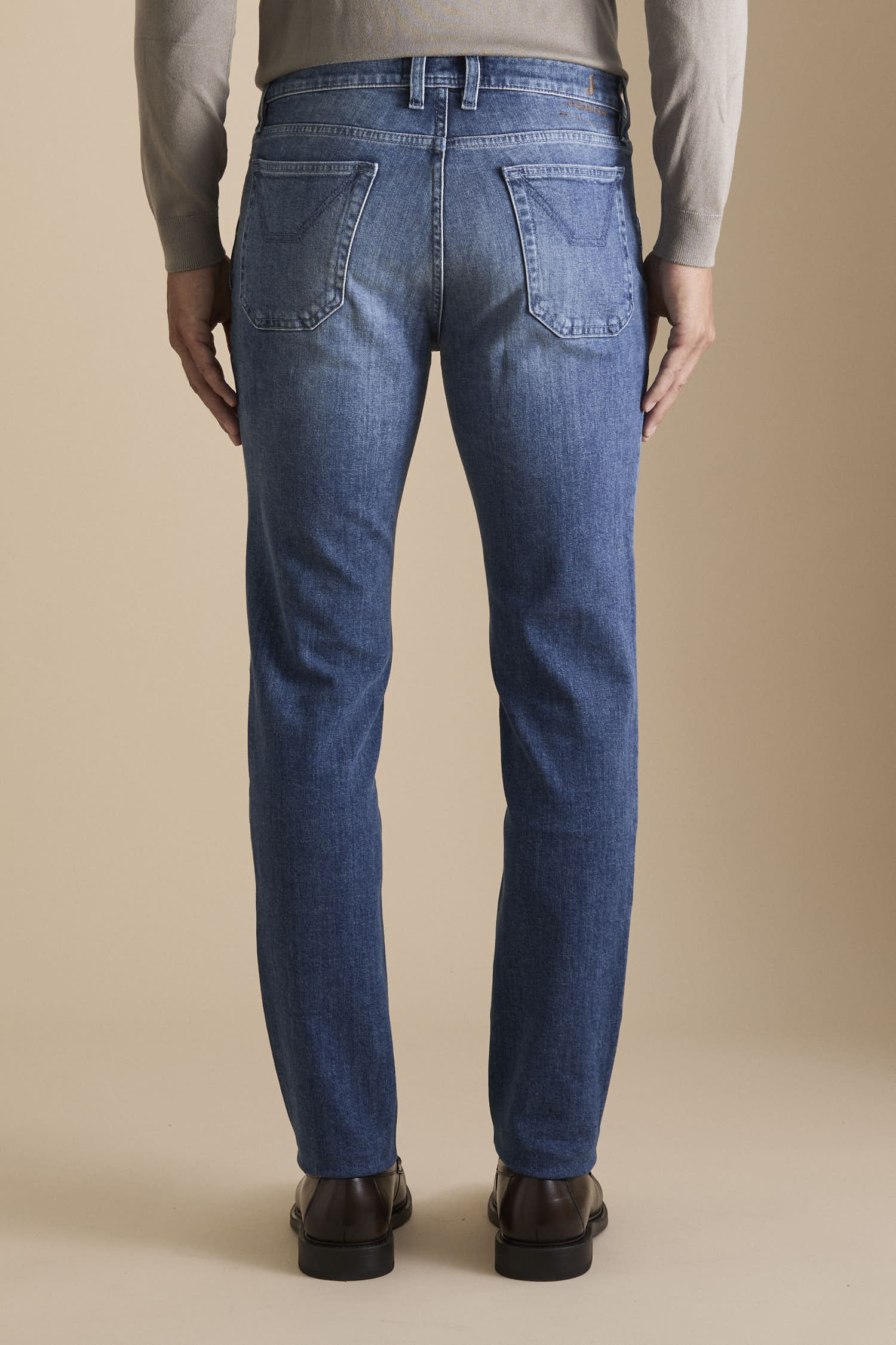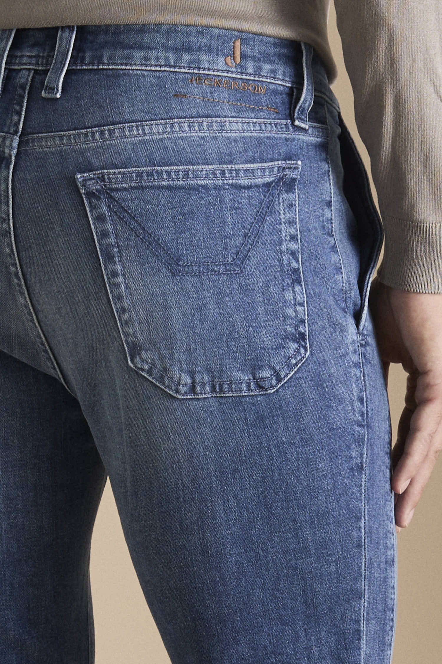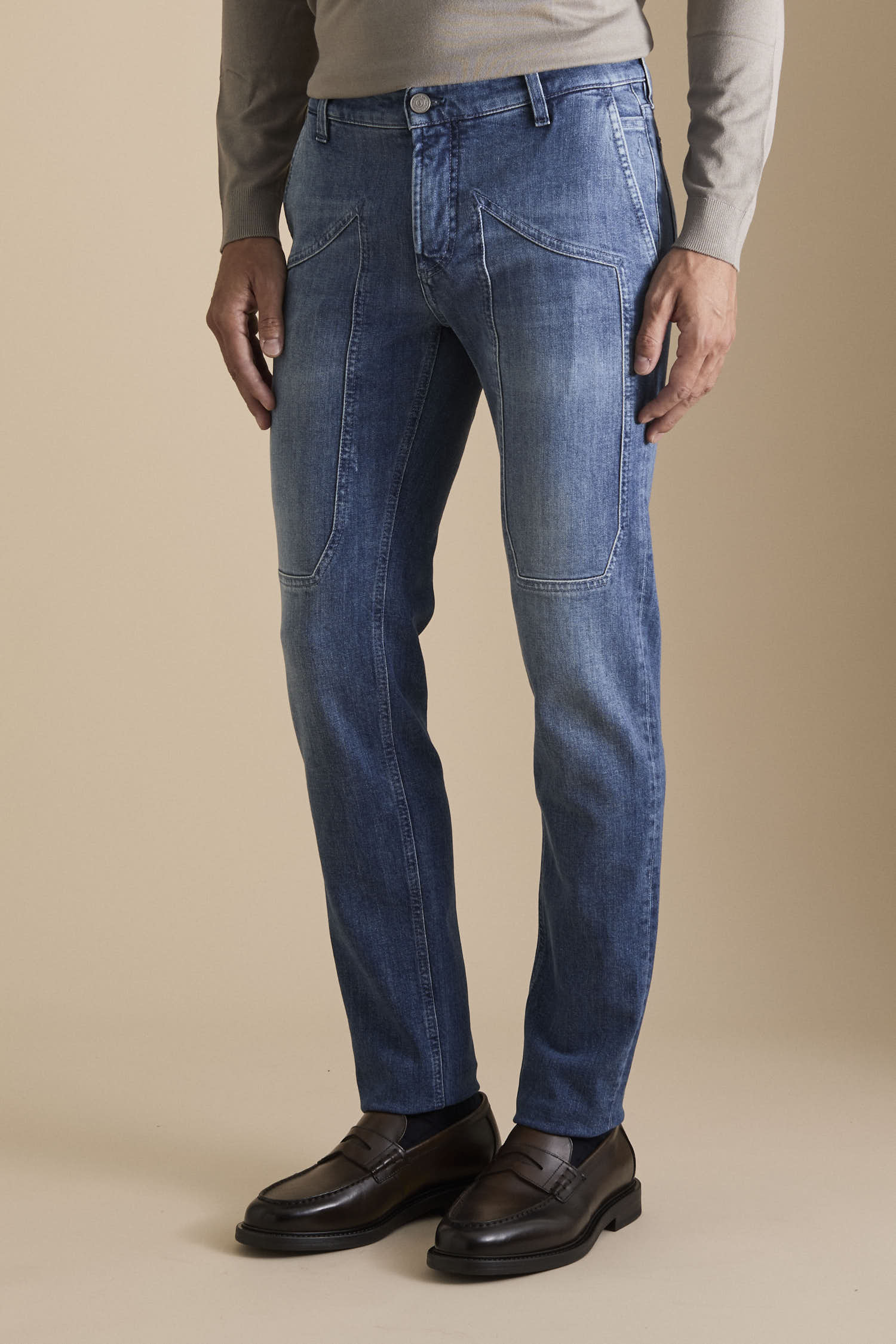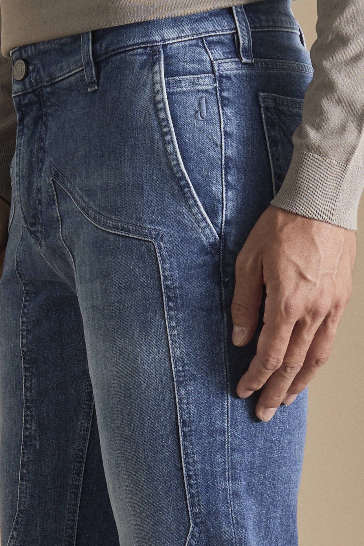 Jevon pantalone 5 tasche tasca america con inserto del disegno iconico toppa, slim fit. Allacciatura con zip. Realizzato in denim comfort base blu. Questo tessuto denim è denominato” Regenagri” in quanto il cotone usato è proveniente da campi in coltivazione rigenerativa, ovvero con forte riduzione se non eliminazione di fertilizzanti sintetici e pesticidi, di CANDIANI. Particolare attenzione è stata data al lavaggio realizzato con tutti i criteri della sostenibilità che sono la riduzione del consumo di acqua ed esclusione di additivi chimici, mantenendo un colore dal blu intenso e sempre con l’ aspetto di una lavaggio denim autentico.