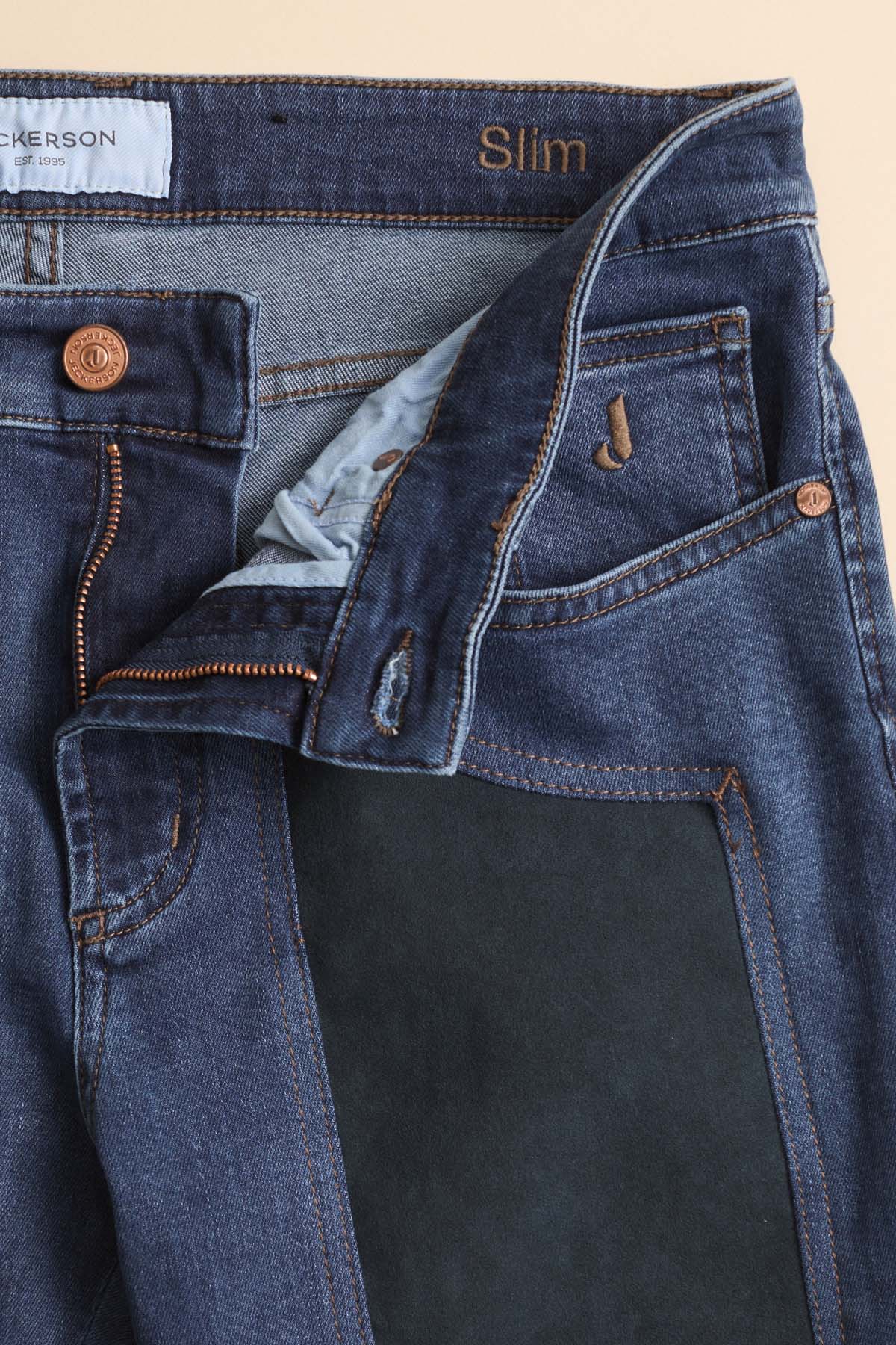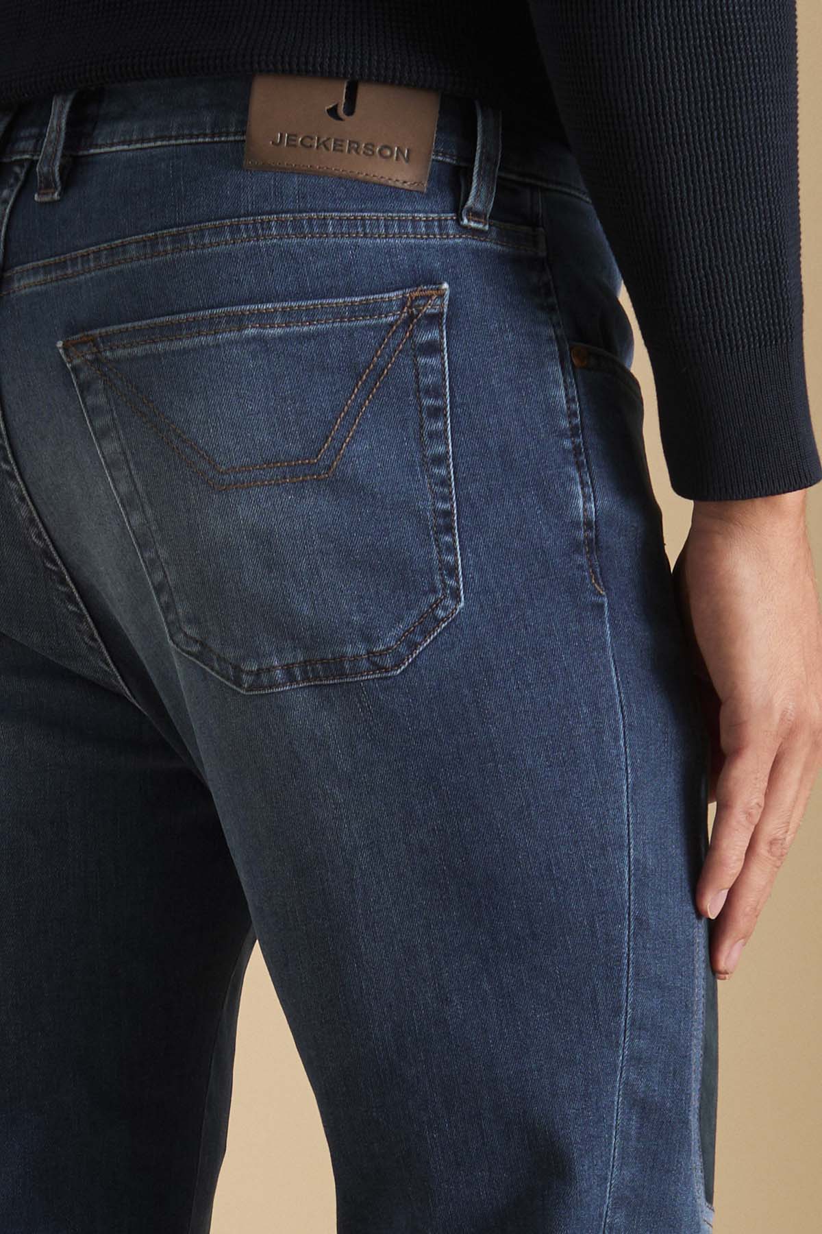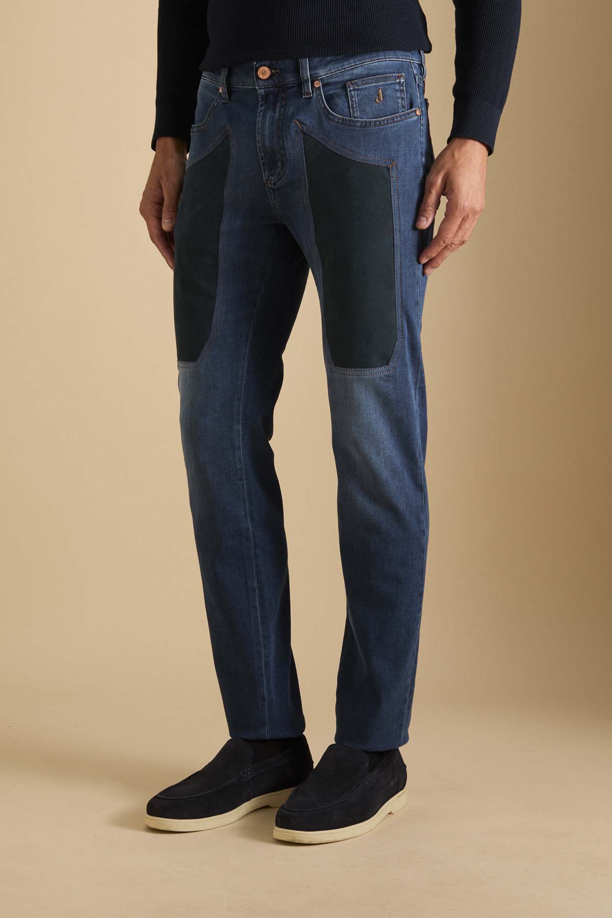 John pantalone 5 tasche con inserto dell’iconico disegno, toppa slim fit. Toppa in Alcantara in colore a contrasto blu mare. Allacciatura con zip. Realizzato in denim super stretch base blu, denim morbido e con un buon recovery che permette al pantalone indossato di mantenere sempre la sua linea agevolando i movimenti. Il lavaggio conferisce al pantalone un colore blu di media intensità con lievi sabbiature sui punti di cucitura che conferiscono al pantalone un aspetto molto casual chic.