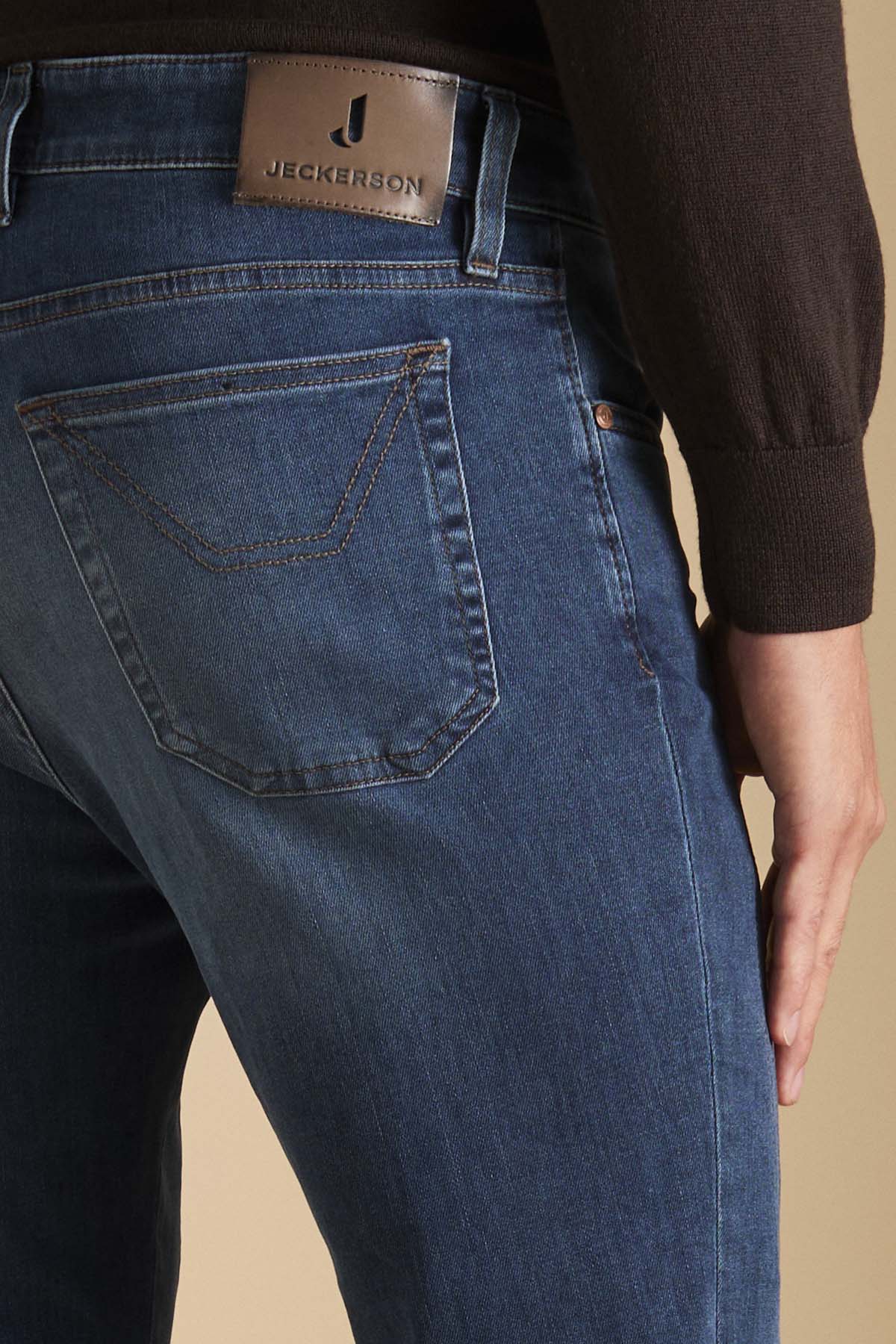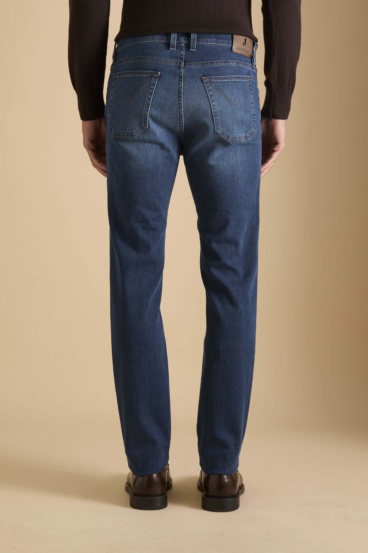 John pantalone 5 tasche con inserto dell’iconico disegno, toppa slim fit. Toppa in Alcantara in colore a contrasto marrone noce. Allacciatura con zip. Realizzato in denim super stretch base blu, denim morbido e con un buon recovery che permette al pantalone indossato di mantenere sempre la sua linea agevolando i movimenti. Il lavaggio conferisce al pantalone un colore blu di media intensità con lievi sabbiature sui punti di cucitura che conferiscono al pantalone un aspetto molto casual chic.