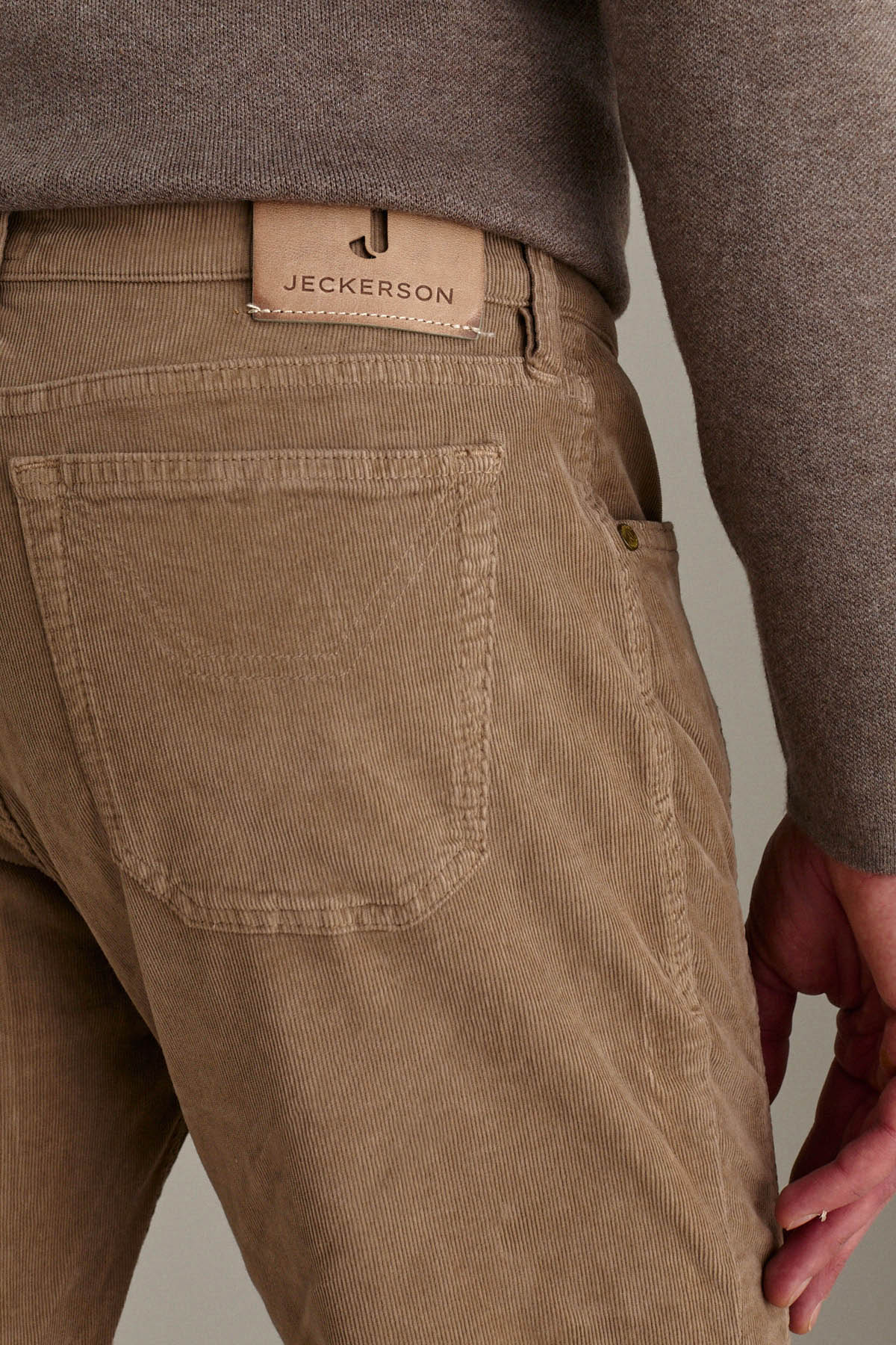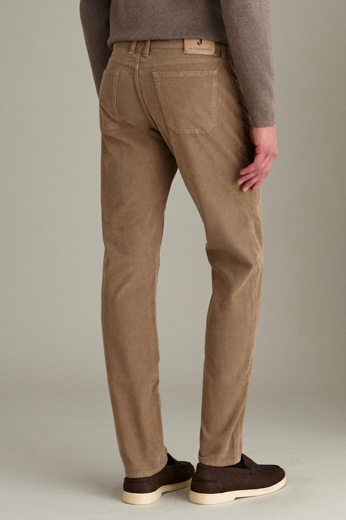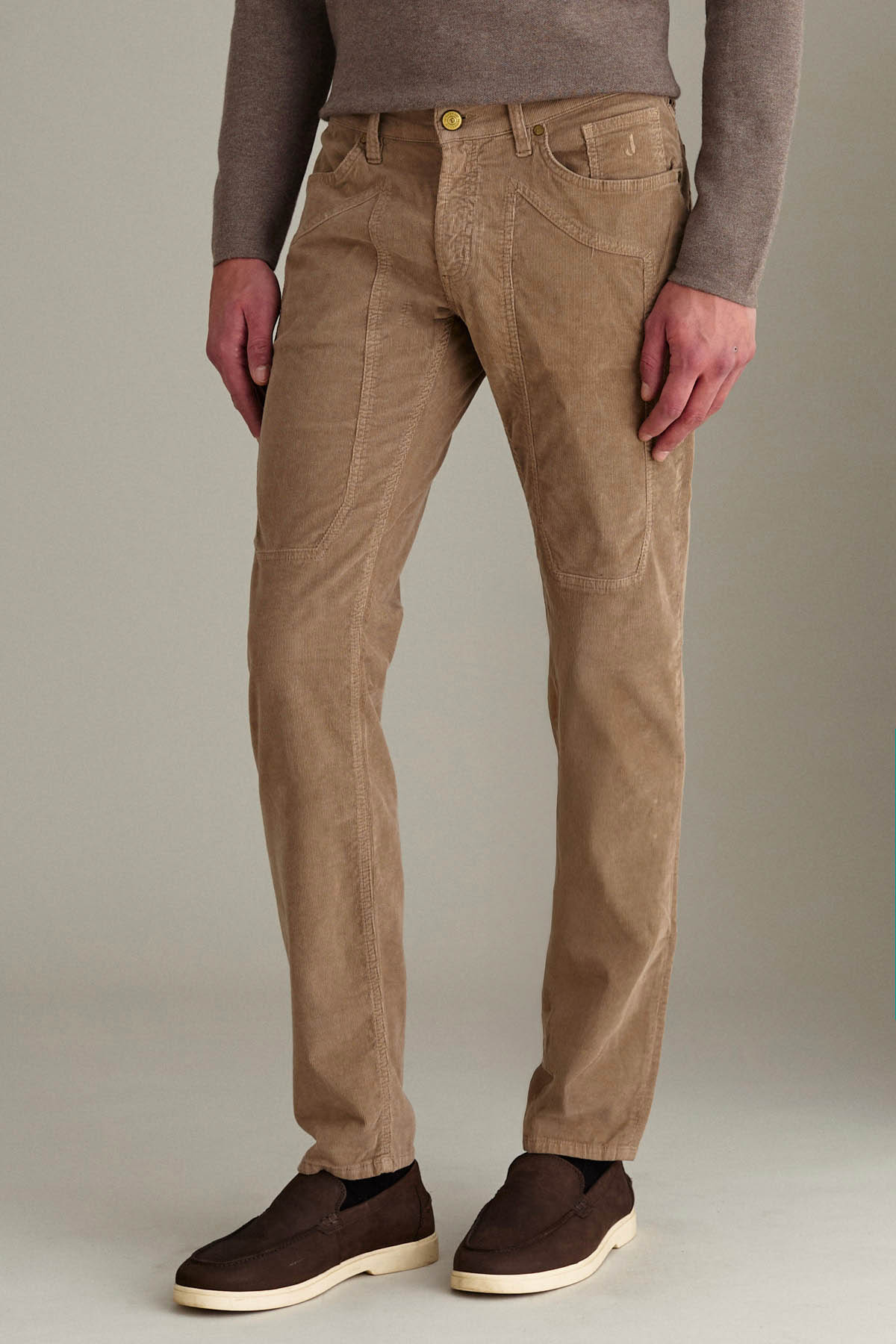 Pantalone slim fit a cinque tasche in velluto soft touch, color sabbia.