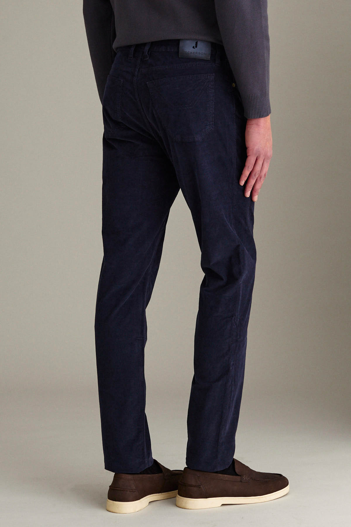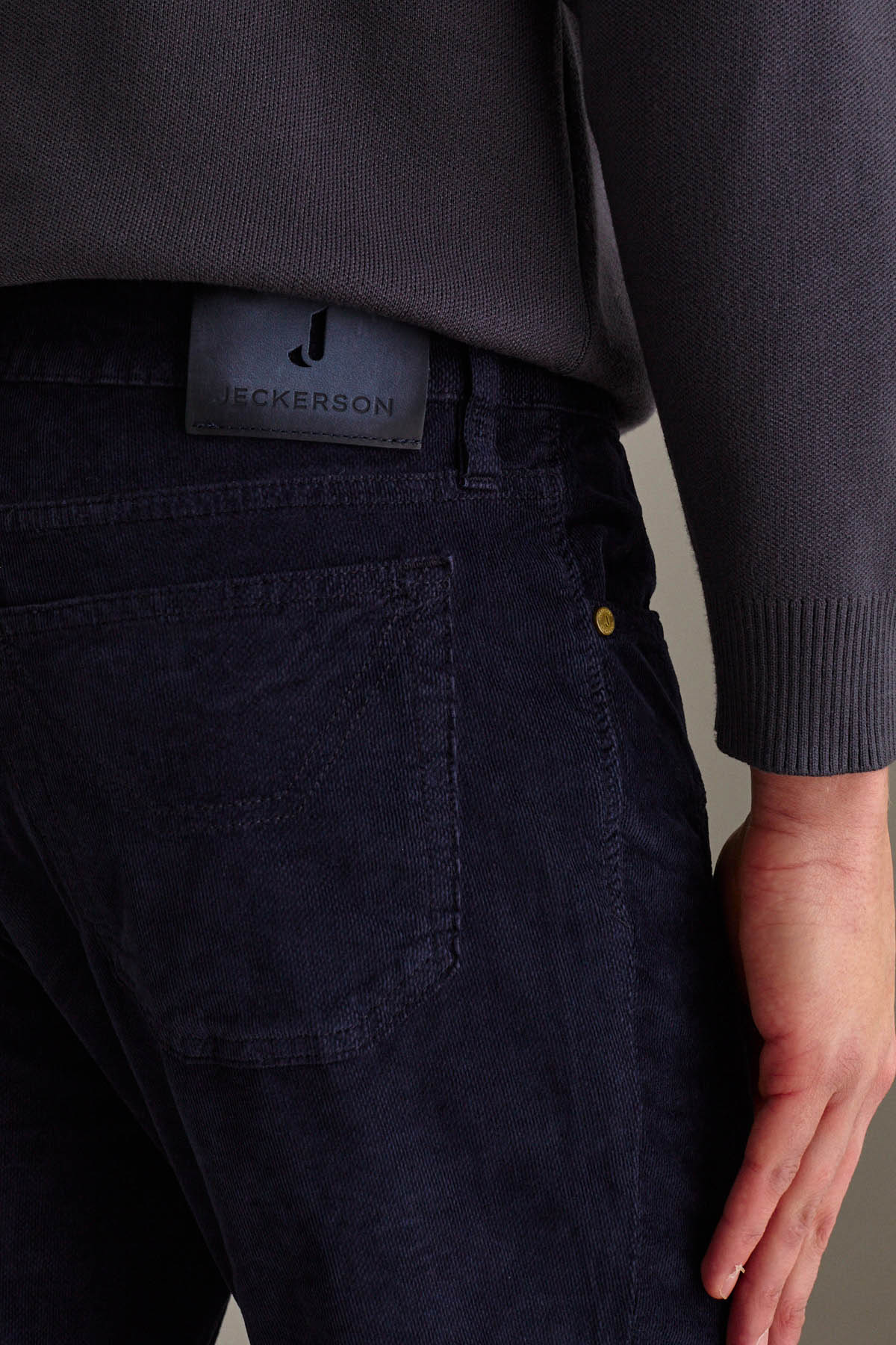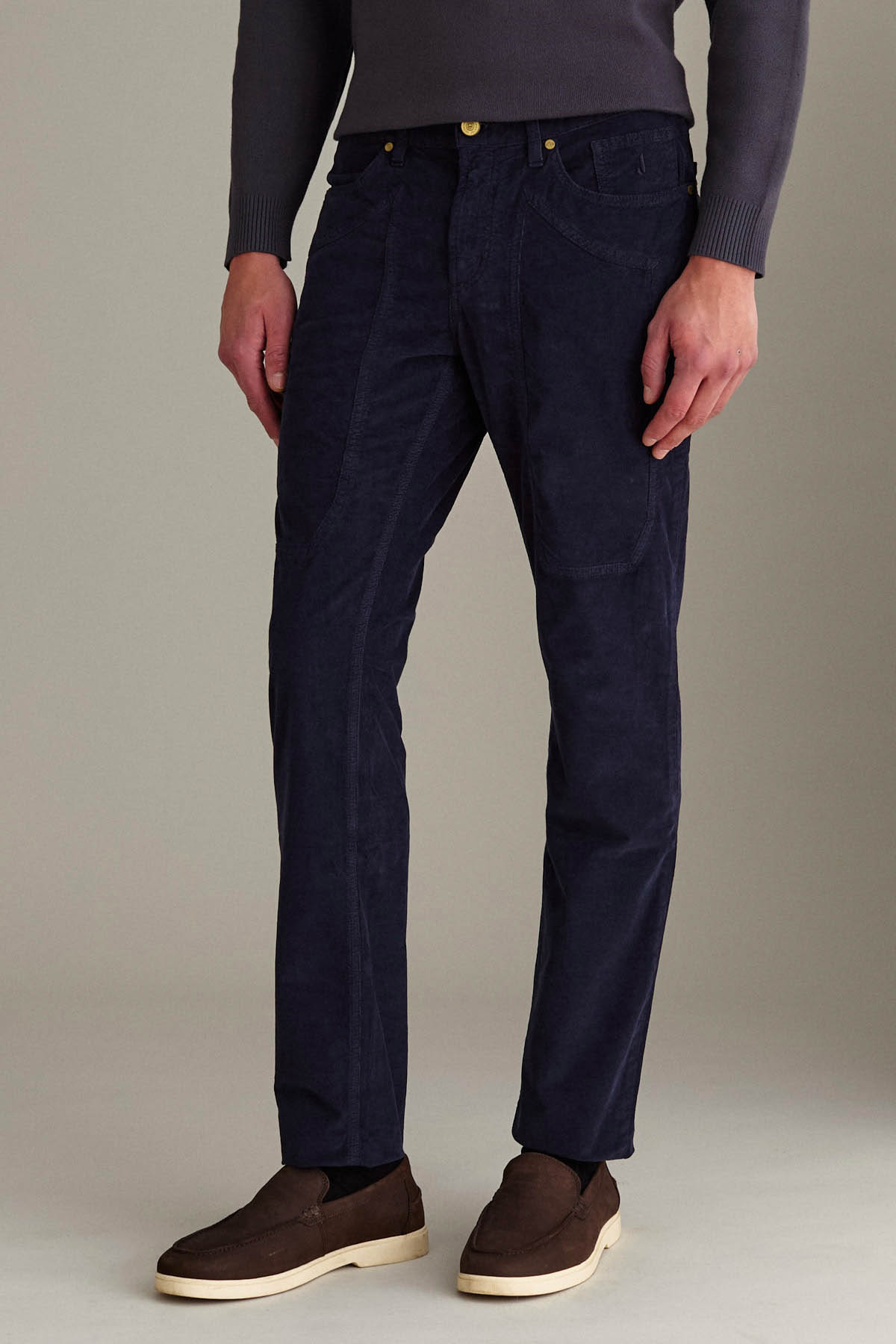 Pantalone 5 tasche con toppa slim fit, realizzato in velluto comfort dall’armatura piquet. Tinto in capo in un sofisticato blu scuro. Accessori metallici, quali bottone e rivetti personalizzati, sono galvanizzati in colore ottone, aggiungendo un tocco di classe al design. Cuciture e ricami in tono. Salpa in pelle con marchio inciso.
