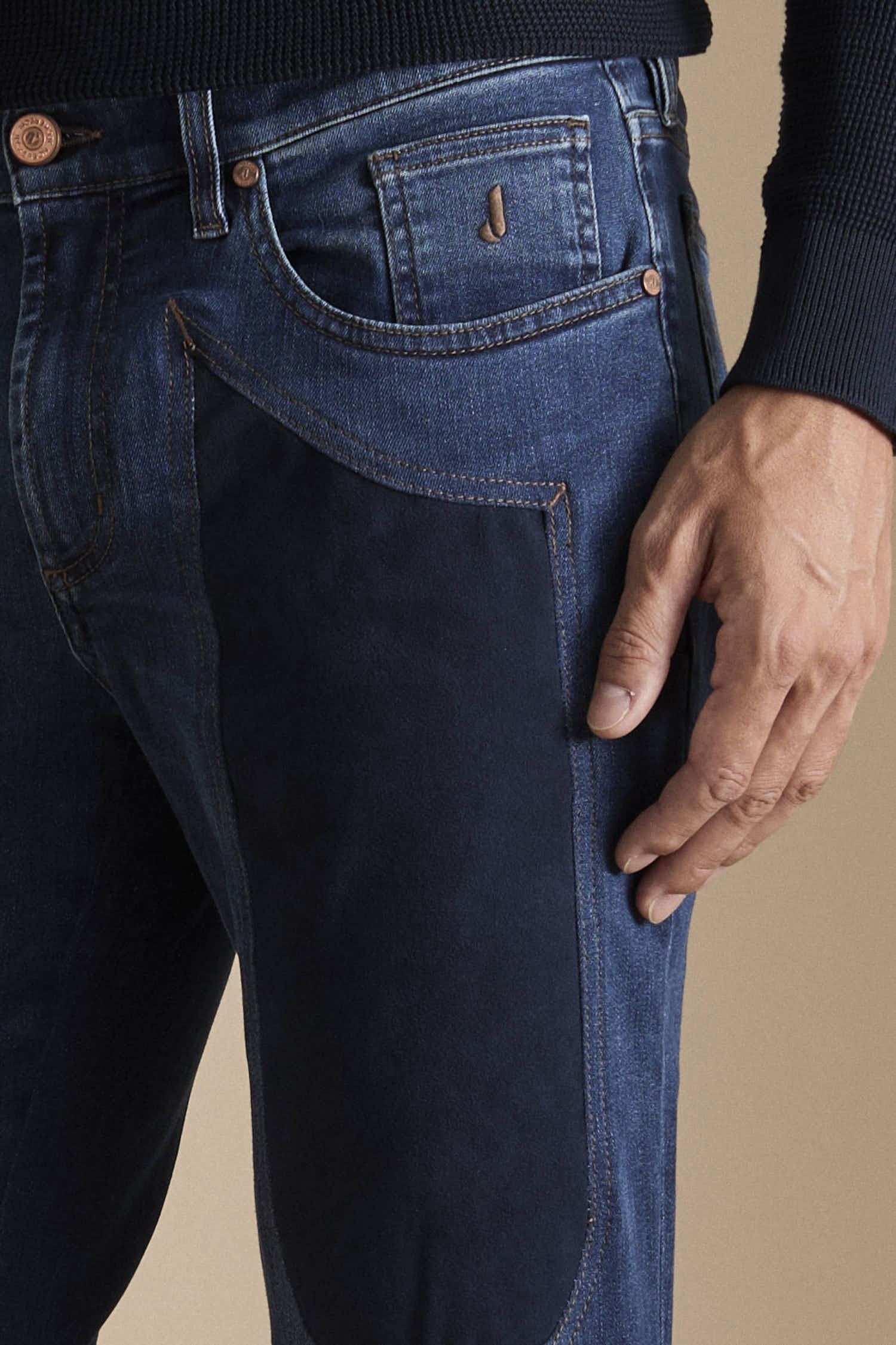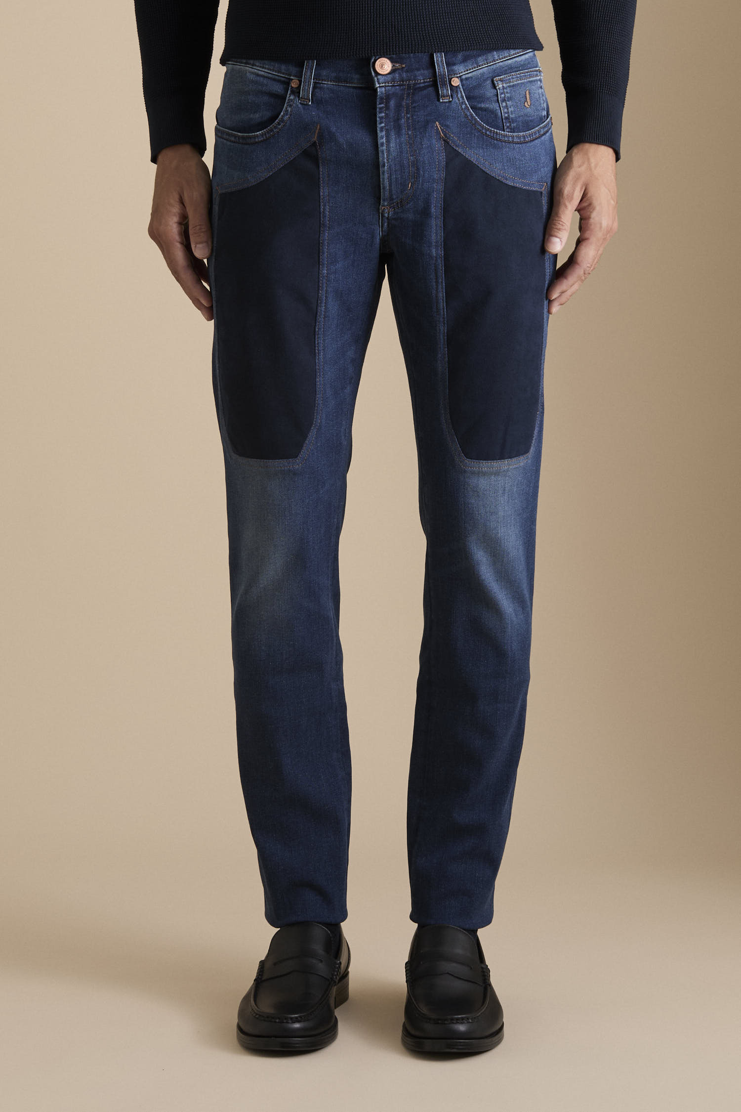 Pantalone 5 tasche slim fit, realizzato in denim stretch tri blend base blu scuro e toppe in alcantara.