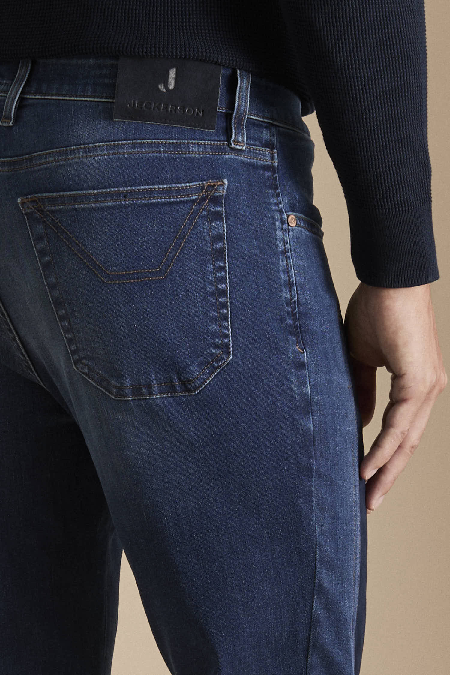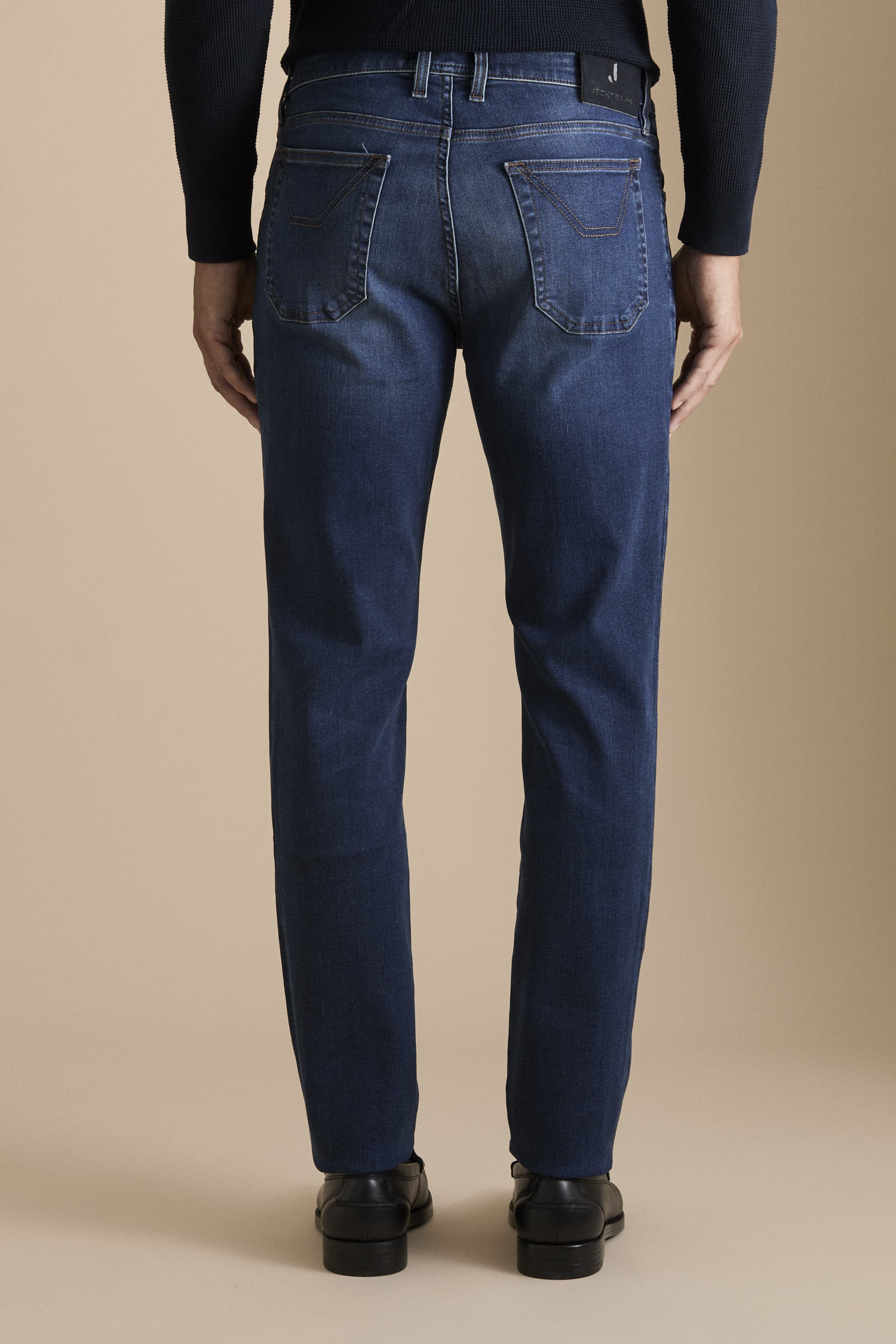 Gli accessori metallici, quali bottone e rivetti personalizzati sono galvanizzati in colore rame. Cuciture e i ricami e logo J sul taschino sono in colore tabacco. Salpa retrocinta in pelle con marchio inciso.