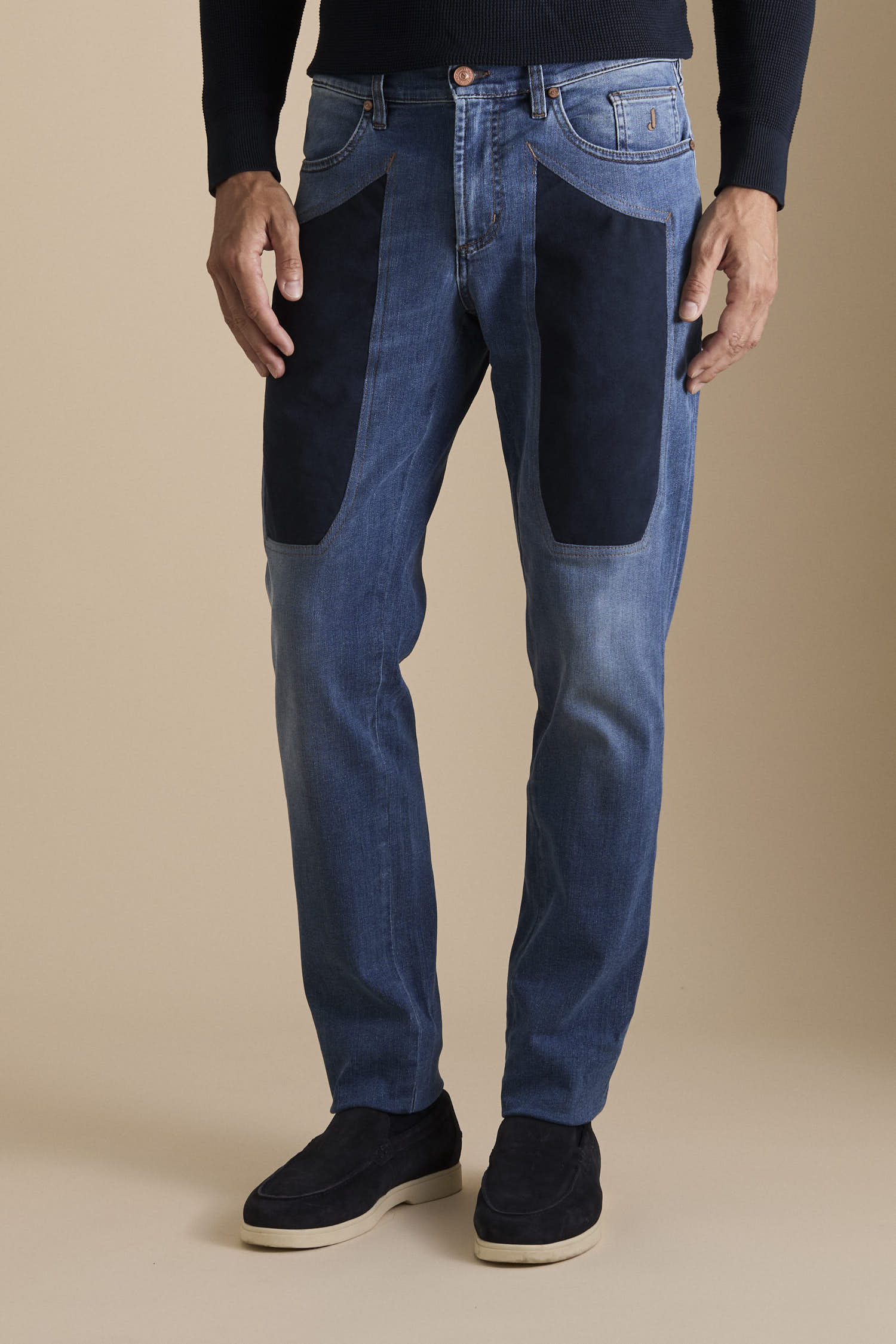 Pantalone 5 tasche slim fit, realizzato in denim stretch tri blend base blu chiaro e toppe in alcantara.