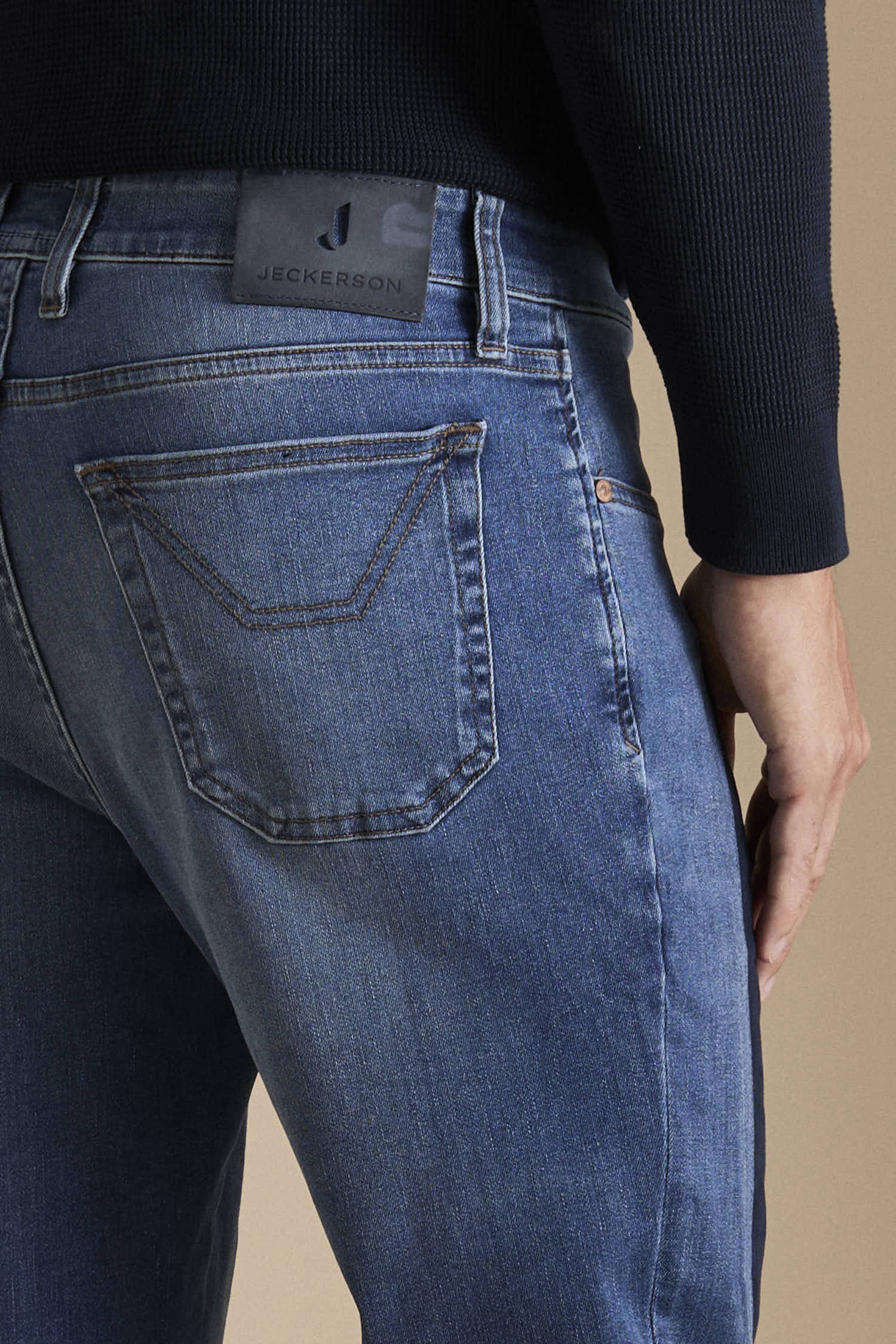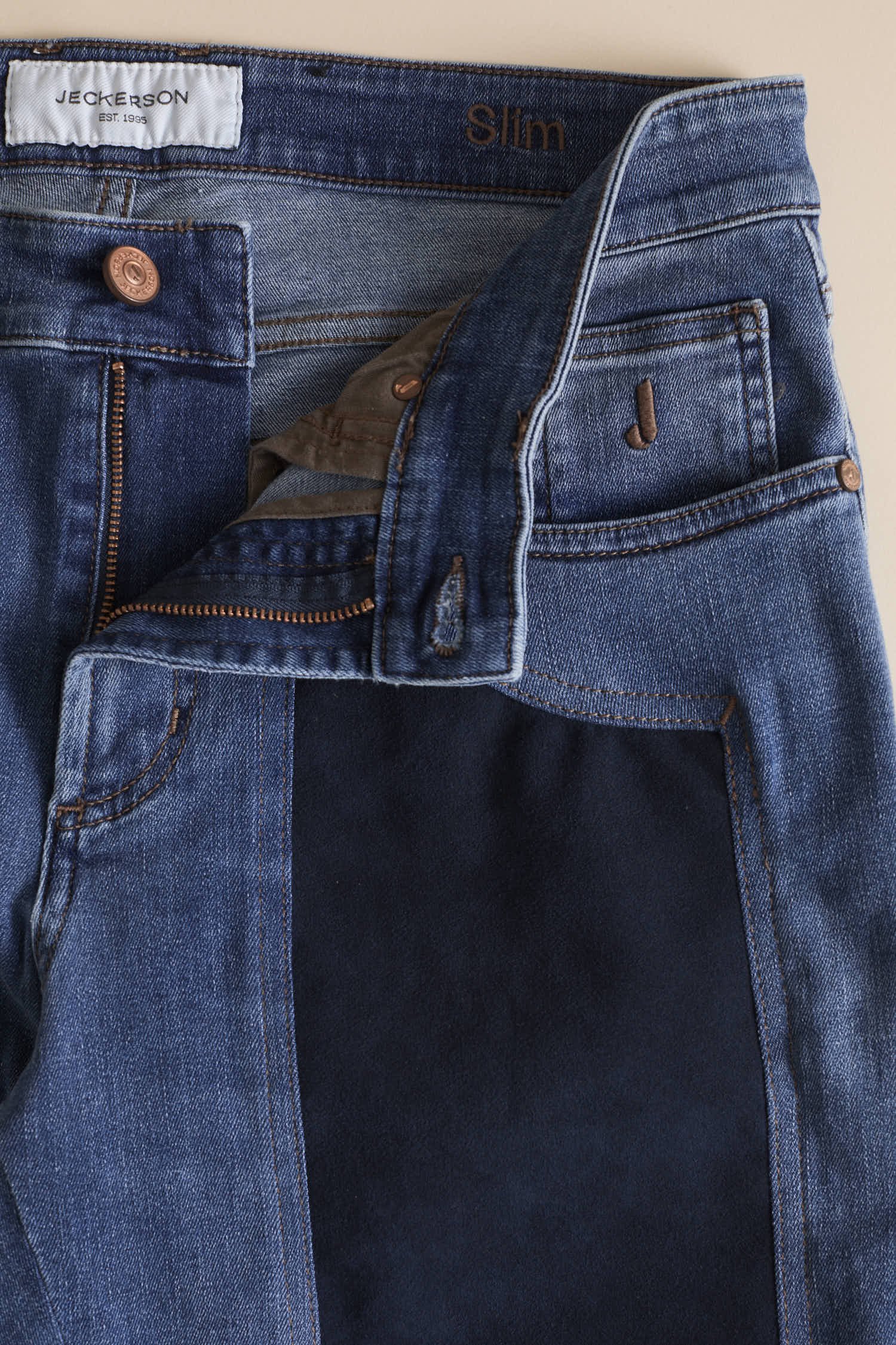 Gli accessori metallici, quali bottone e rivetti personalizzati sono galvanizzati in colore rame. Cuciture e i ricami e logo J sul taschino sono in colore tabacco. Salpa retrocinta in pelle con marchio inciso.