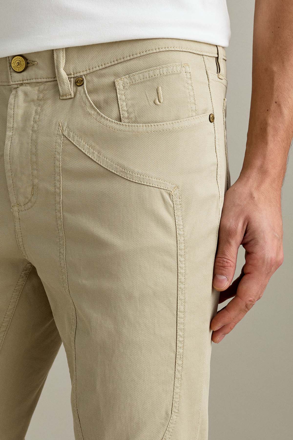 Il pantalone 5 tasche John slim fit con l’iconico inserto toppa interpreta uno stile contemporaneo garantendo comfort e versatilità, con una linea pulita e attuale. Realizzato in armatura comfort micro nido d’ ape tinta in capo in colore beige chiaro, la tinta in capo beige chiaro regala un’estetica raffinato e versatile, perfetta per look casual e smart casual. Chiusura con zip, salpa in pelle, bottone cintura e rivetti personalizzati color ottone opaco definiscono il capo con dettagli iconici e curati.