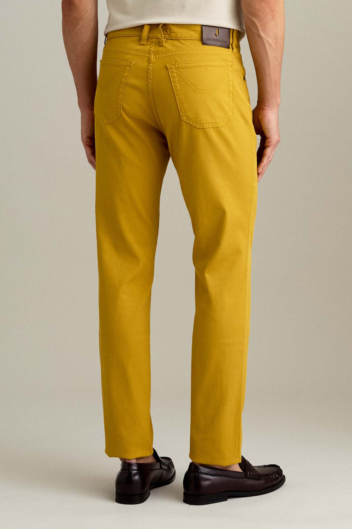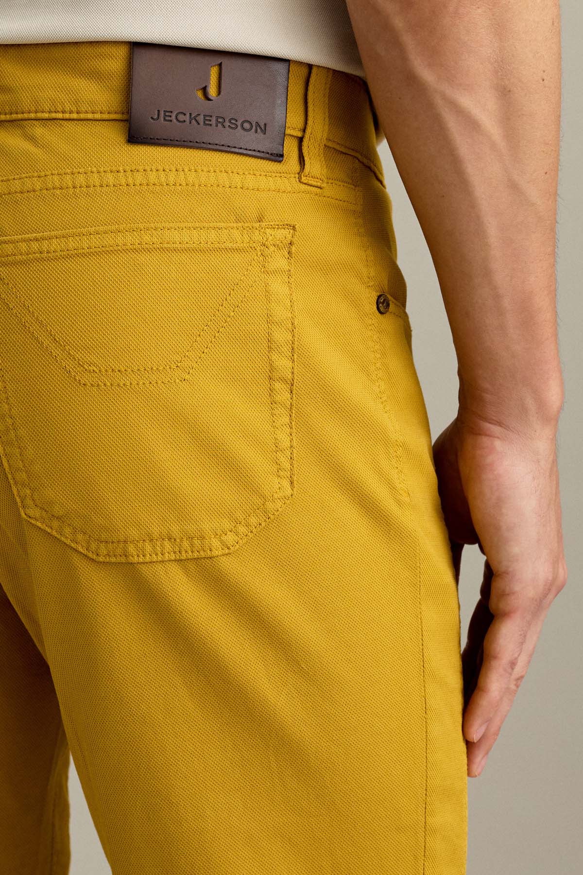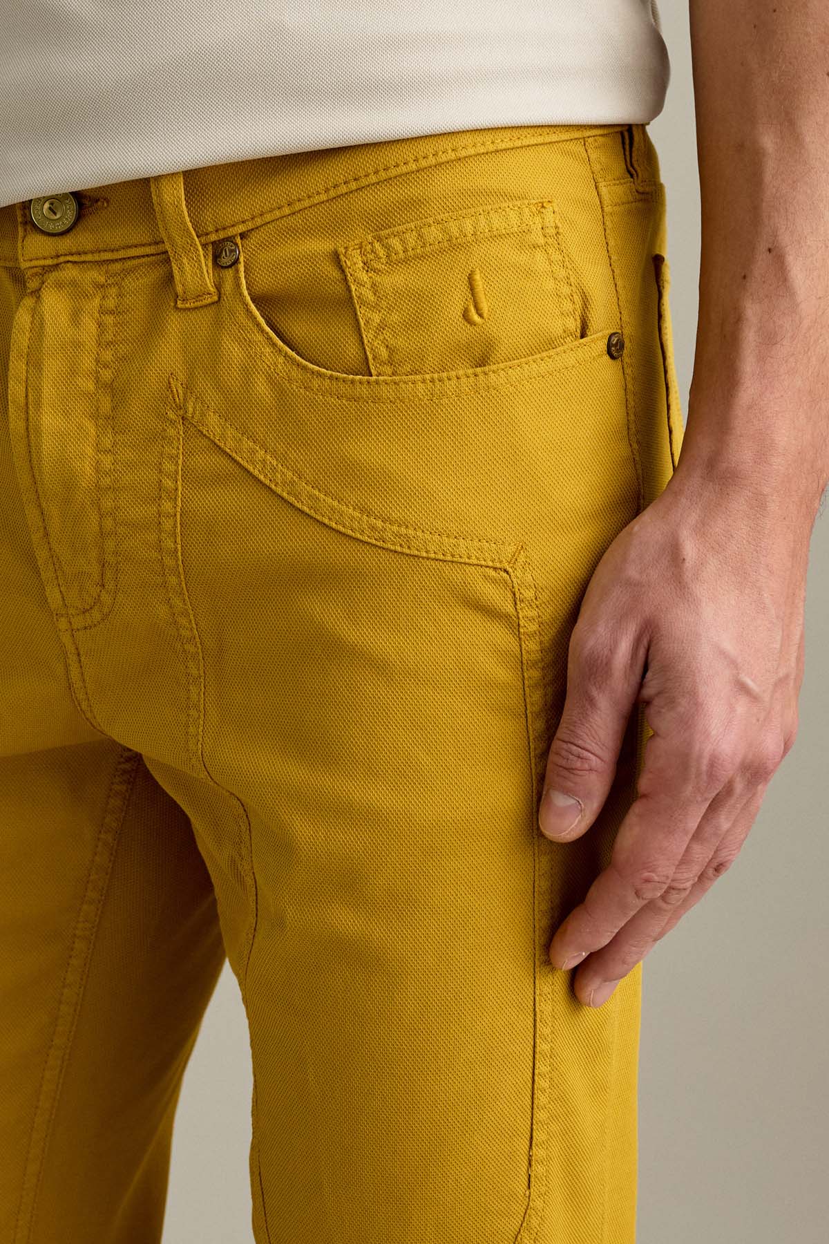 Il pantalone 5 tasche John slim fit con l’iconico inserto toppa interpreta uno stile contemporaneo garantendo comfort e versatilità, con una linea pulita e attuale. Realizzato in armatura comfort micro nido d’ ape, la tinta in capo in colore Giallo Gold regala un’estetica raffinata e versatile, perfetta per look casual e smart casual. Chiusura con zip, salpa in pelle, bottone cintura e rivetti personalizzati color ottone opaco definiscono il capo con dettagli iconici e curati.