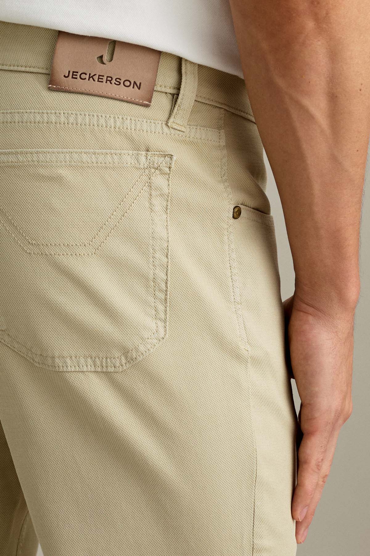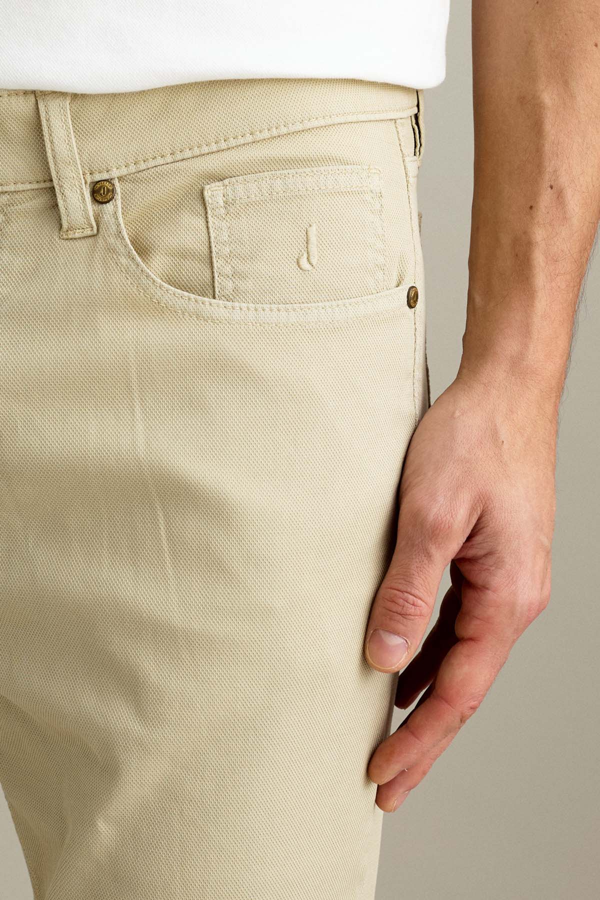 Il pantalone Jordan 5 tasche slim fit unisce linee moderne e comfort. Realizzato in armatura comfort micro nido d’ape tinta in capo Beige Chiaro, è ideale per look casual e smart casual. La chiusura con zip, la salpa in pelle, bottone cintura e i rivetti personalizzati color ottone opaco completano il capo con dettagli distintivi di qualità.