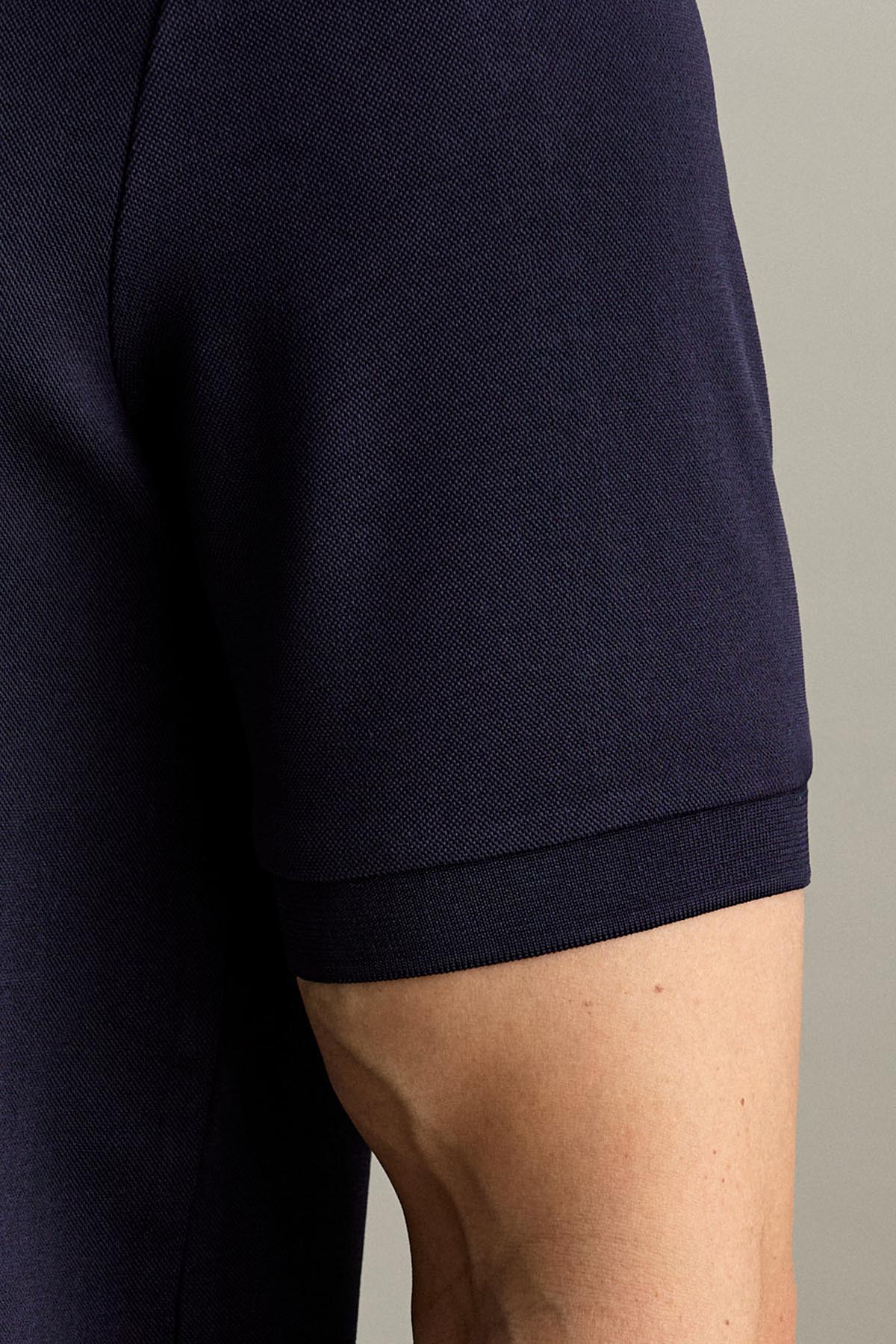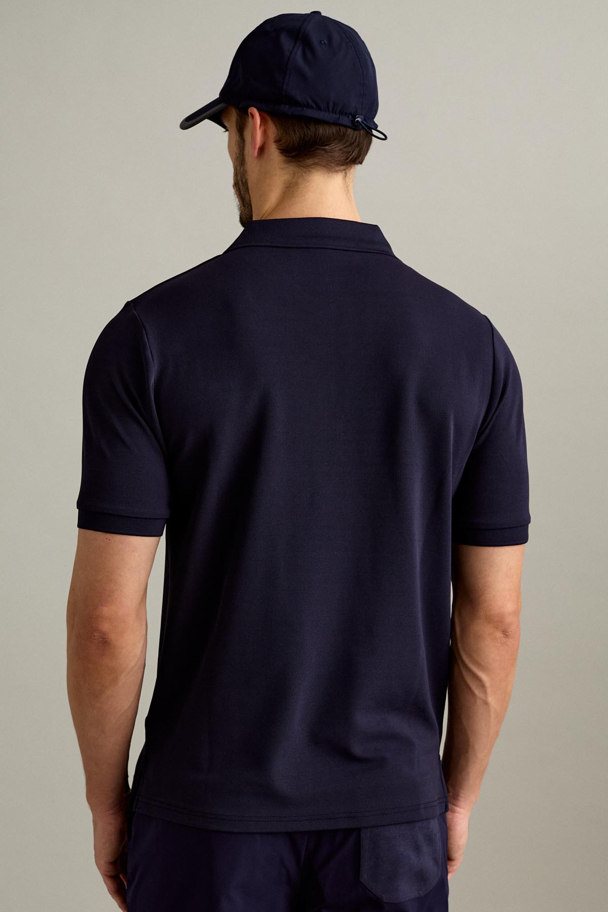 La polo a manica corta con chiusura a tre bottoni è realizzata in piquet tecnico in fibra di poliestere comfort, nel colore Blu Scuro.