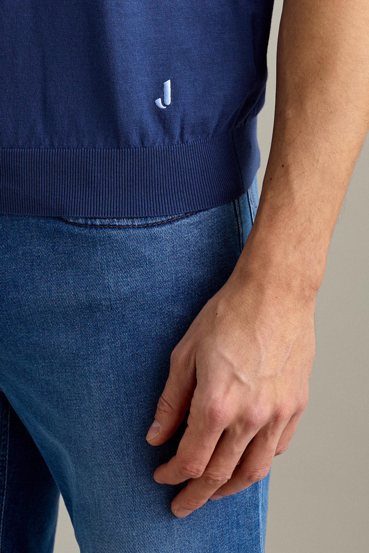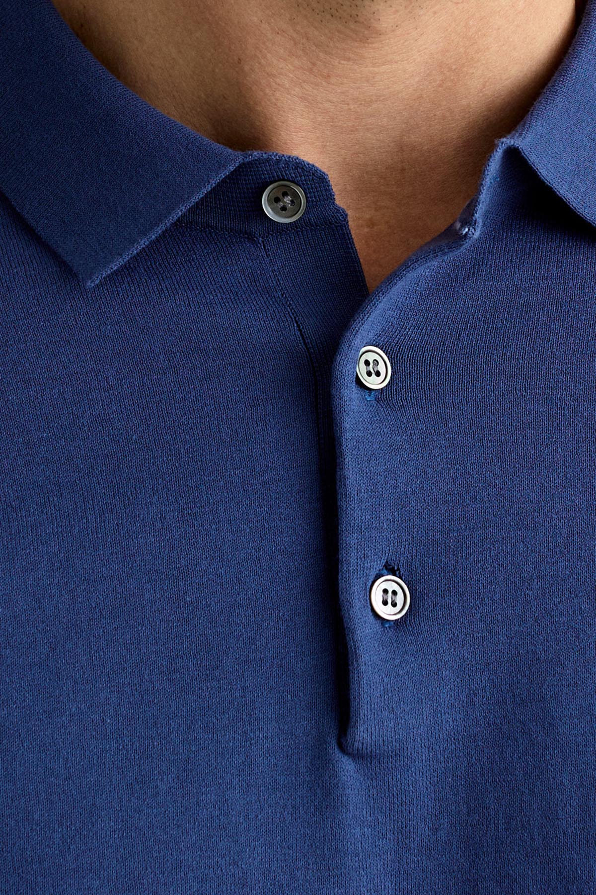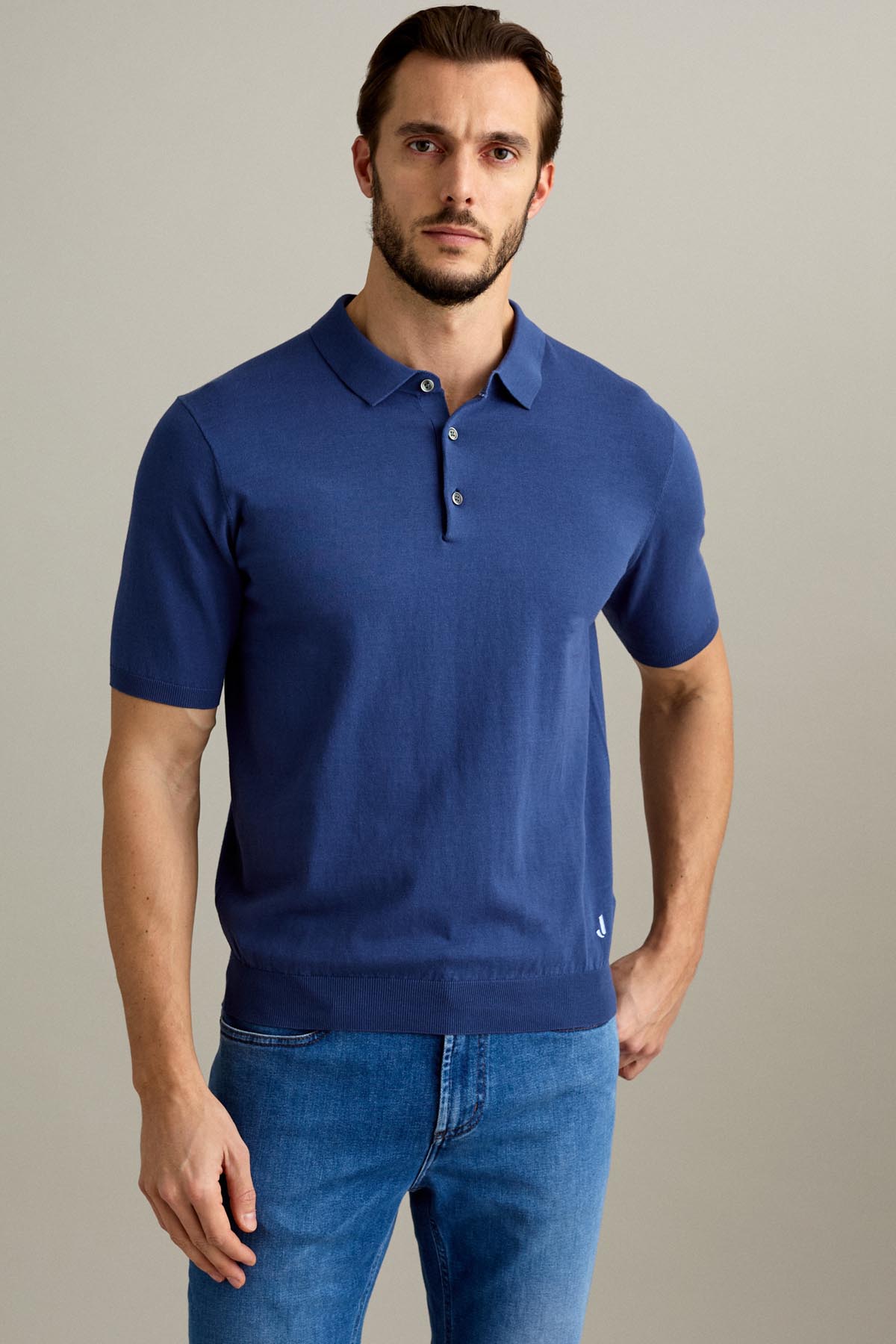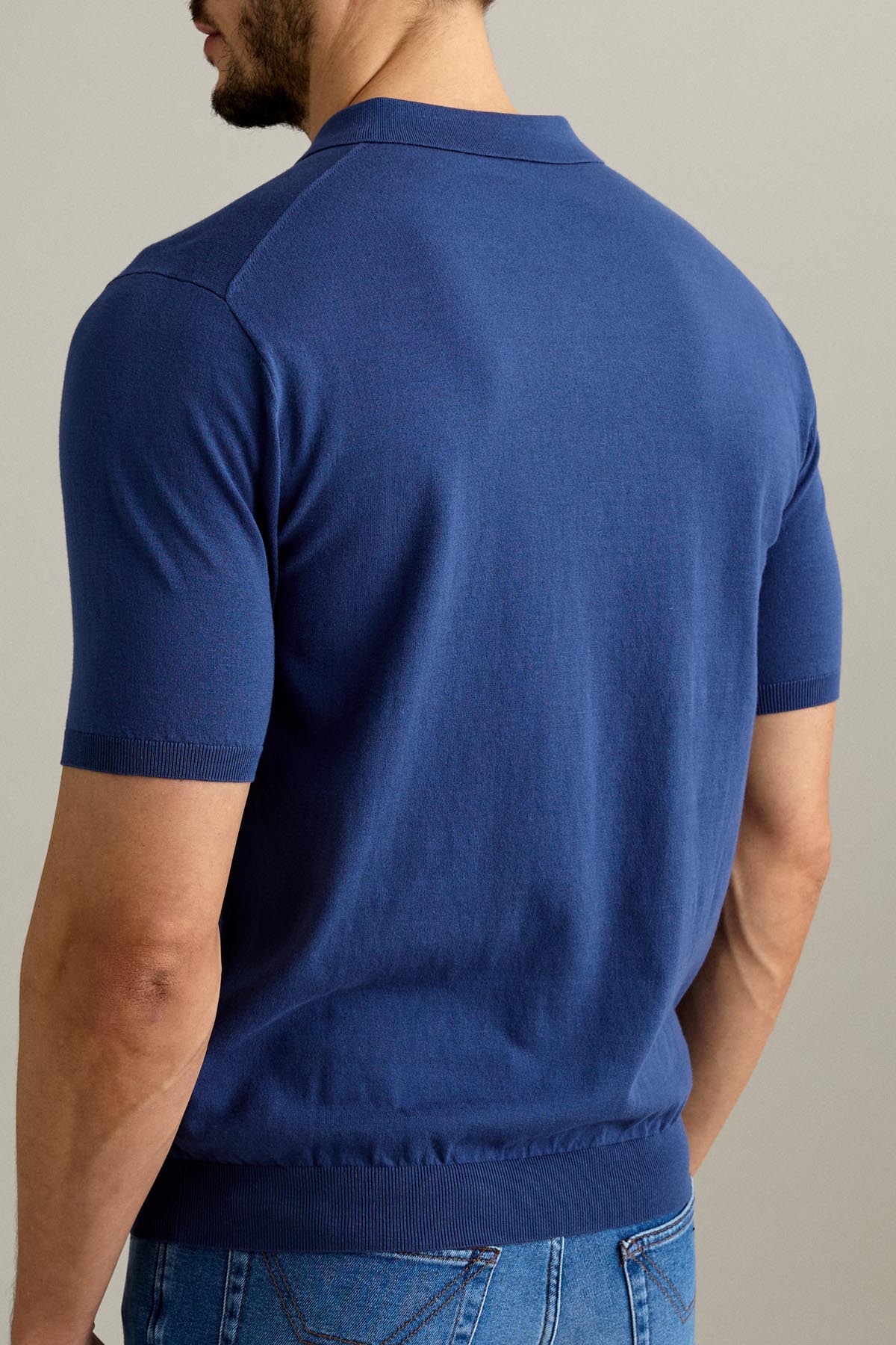 La polo a manica corta con chiusura a tre bottoni è realizzata in maglieria calata in filato di cotone crepe nel colore Blu Chiaro.