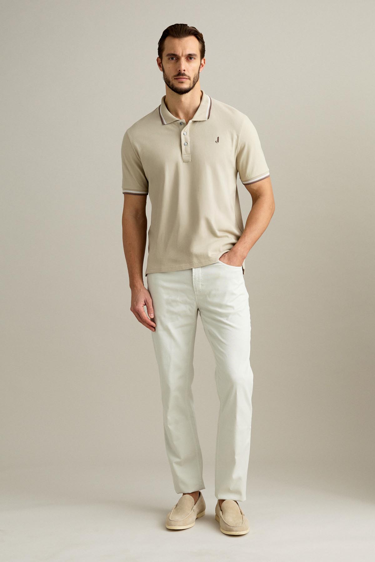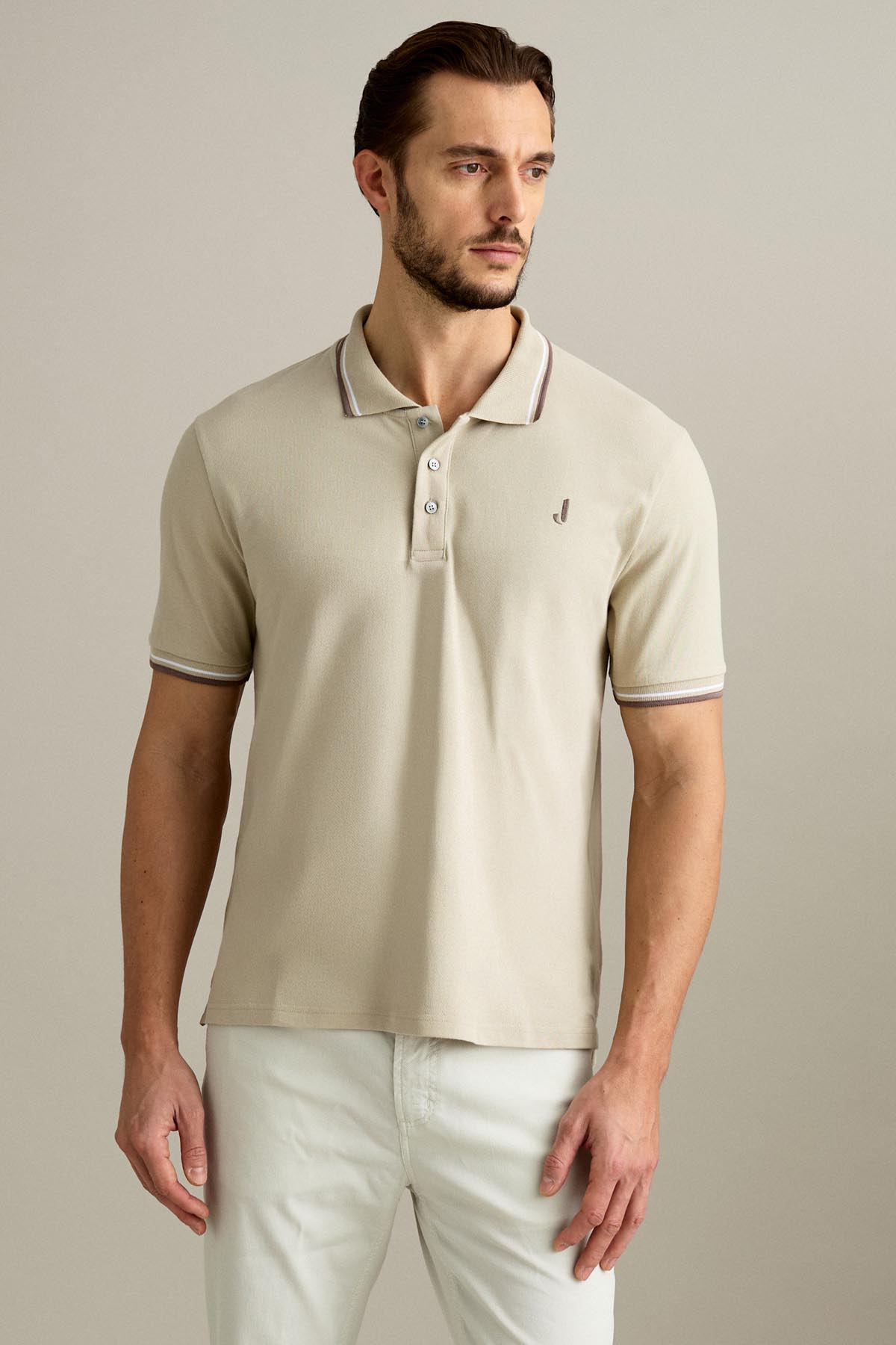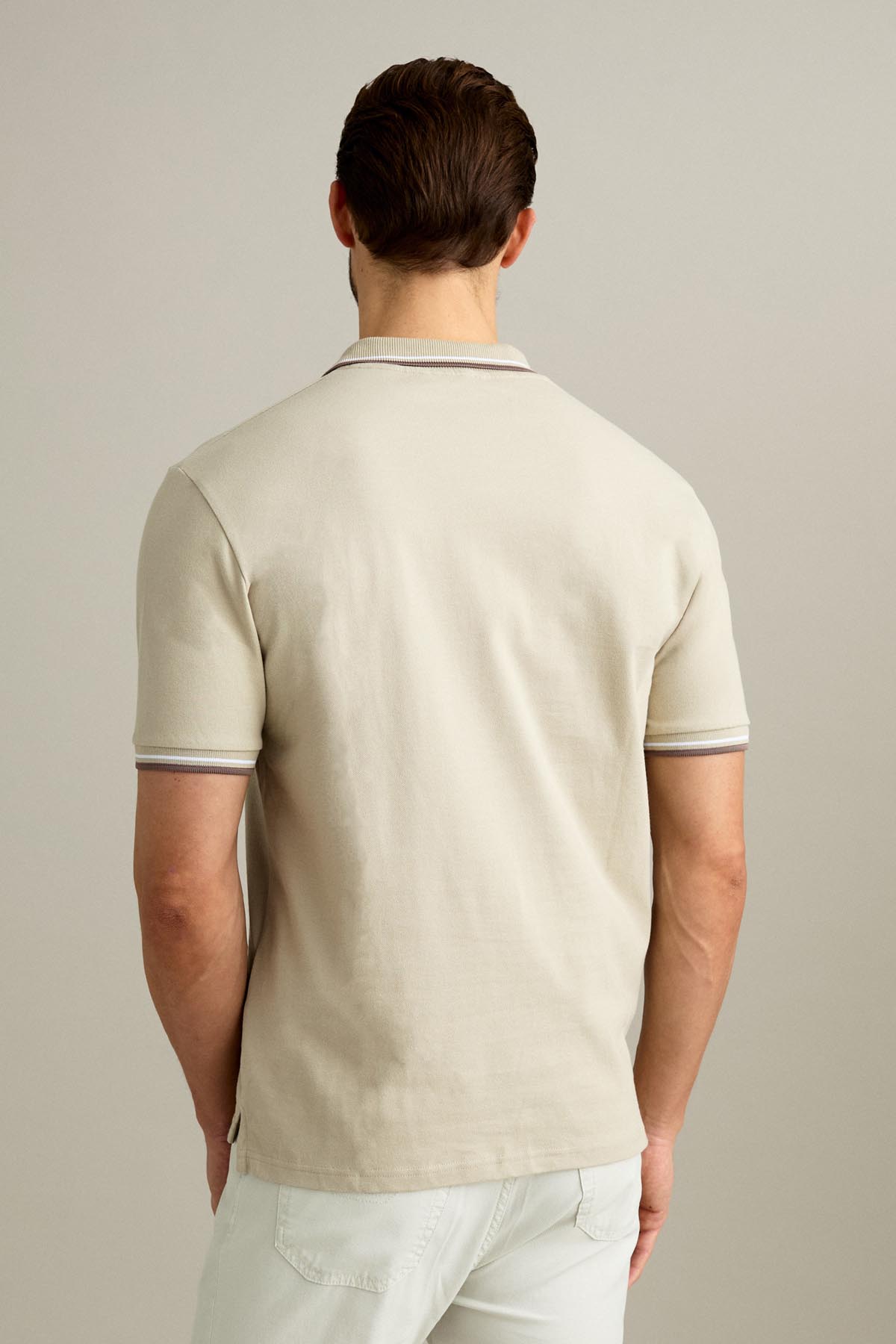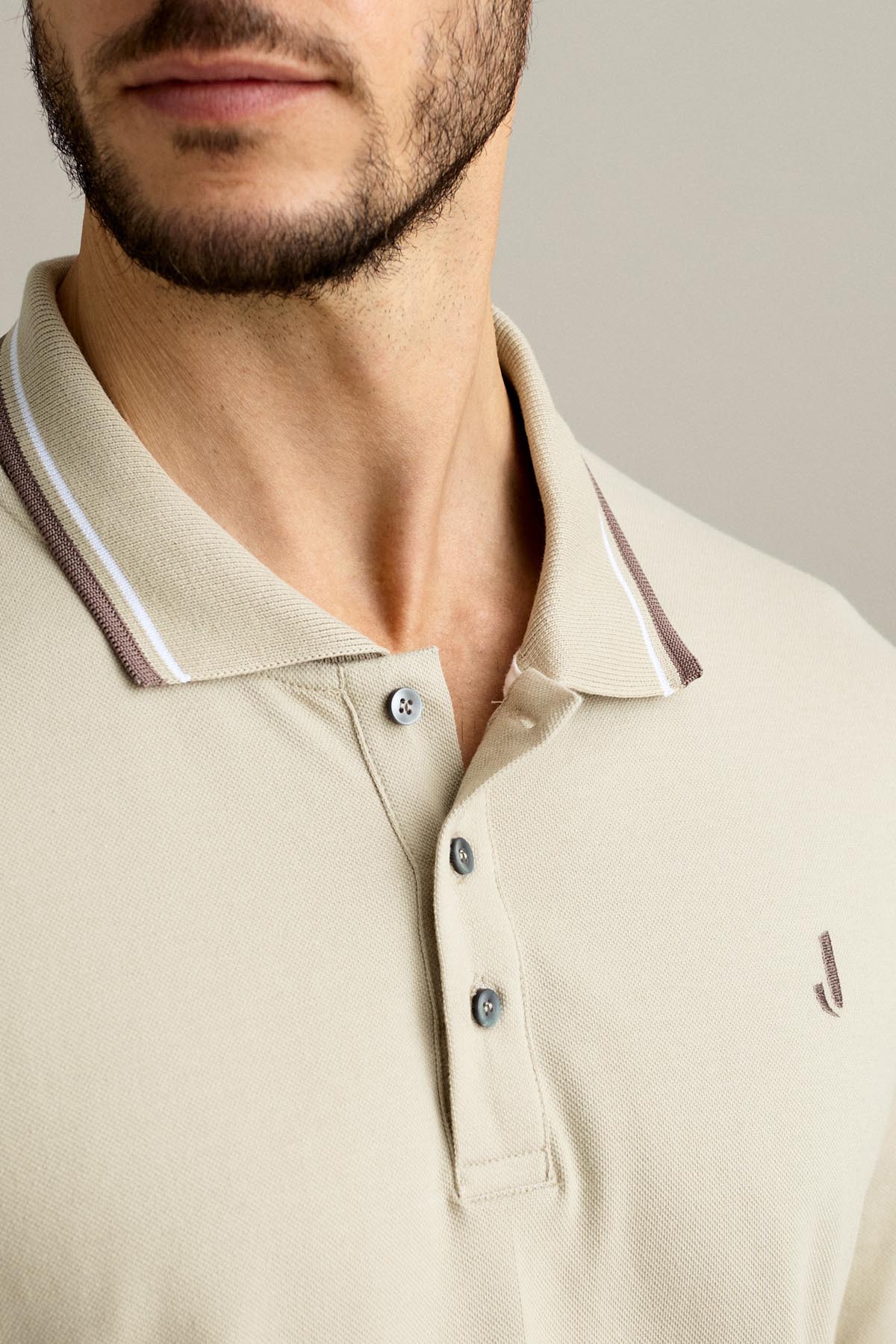 La polo a manica corta con chiusura a tre bottoni è realizzata in piquet comfort nel colore Beige Chiaro.