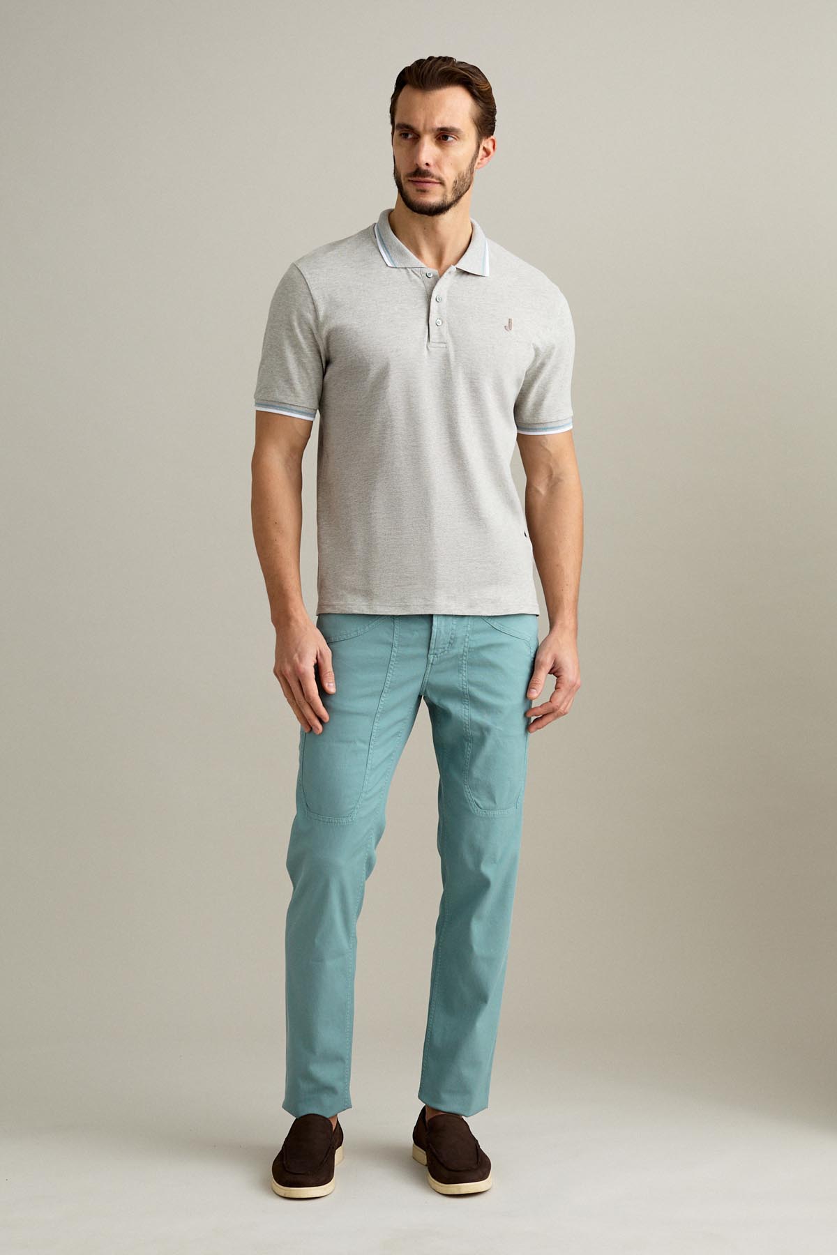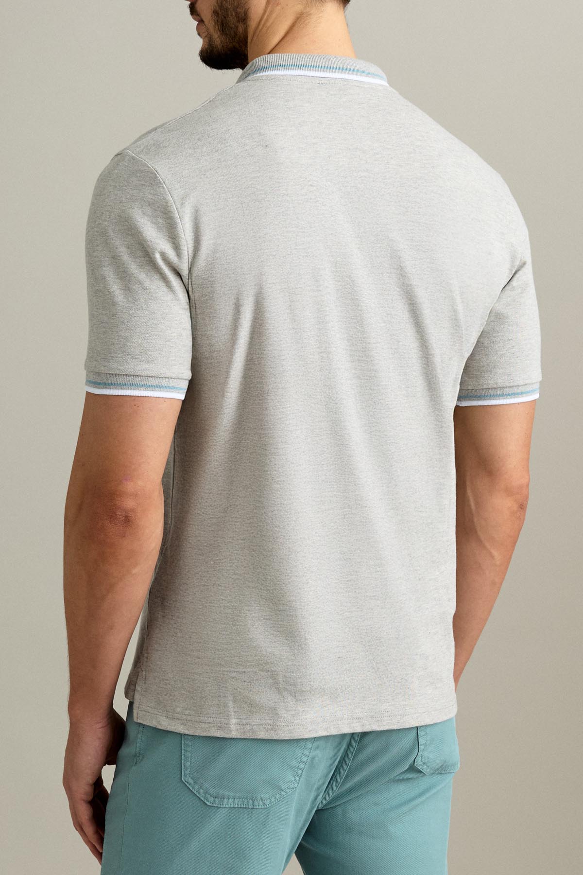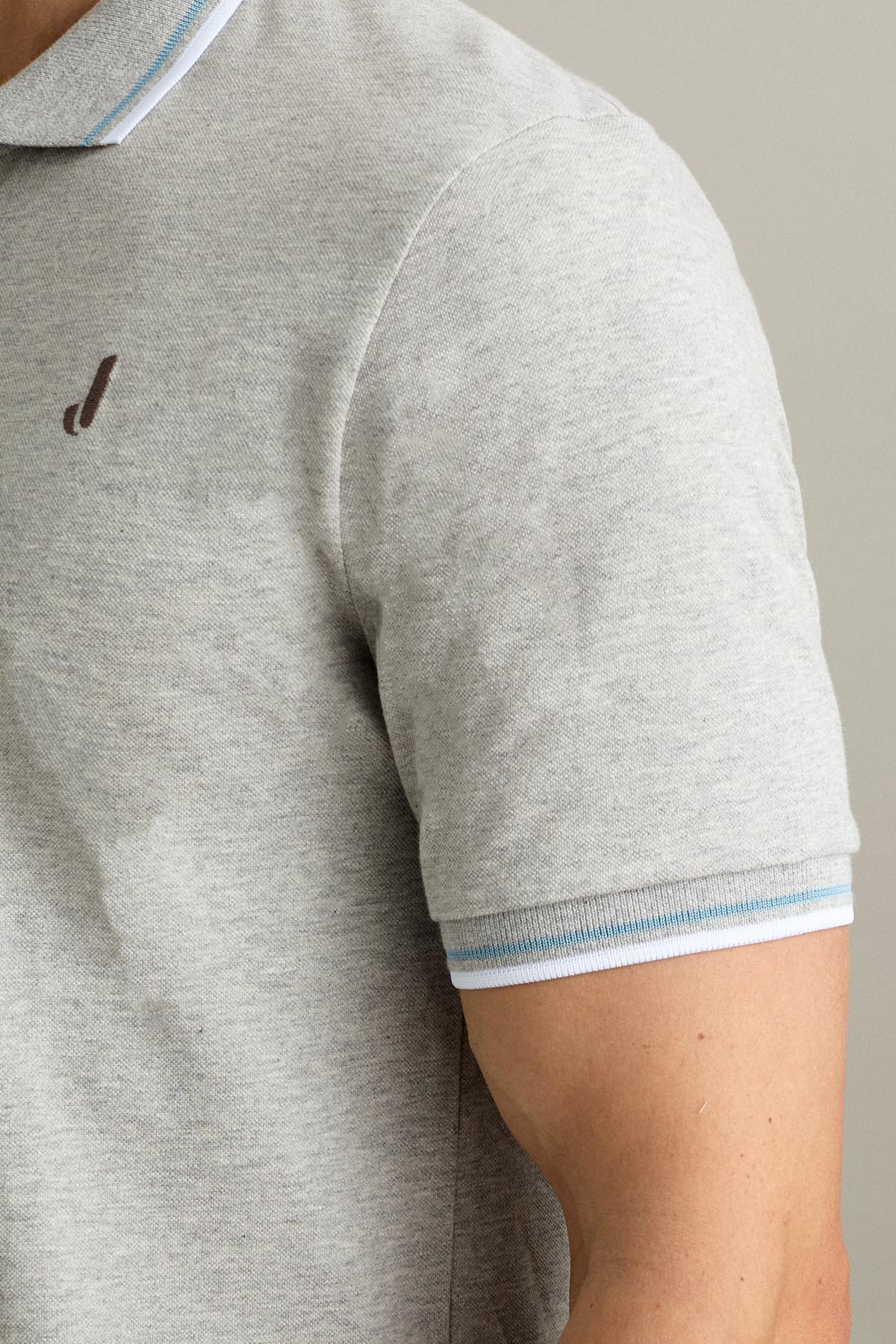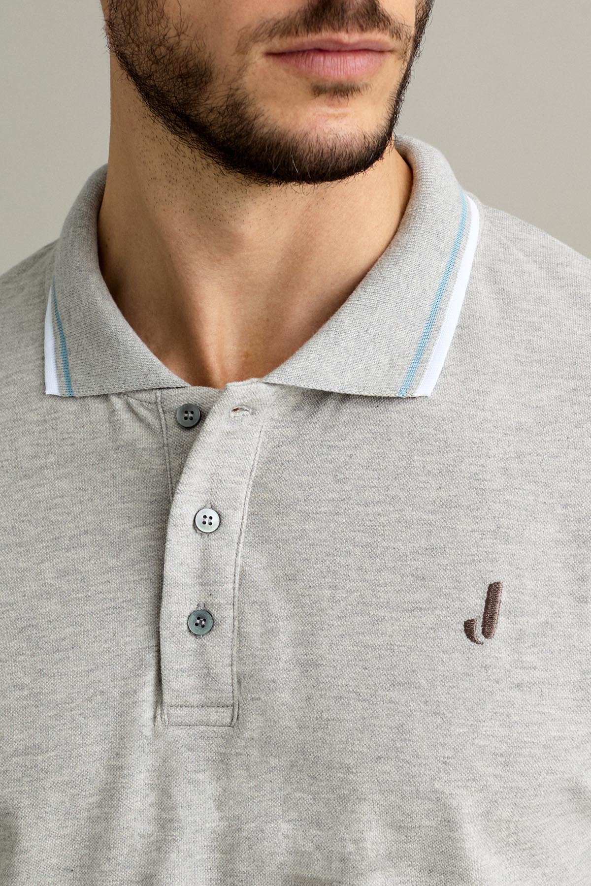 La polo a manica corta con chiusura a tre bottoni è realizzata in piquet comfort con effetto finto filo melange nel colore Grigio.
