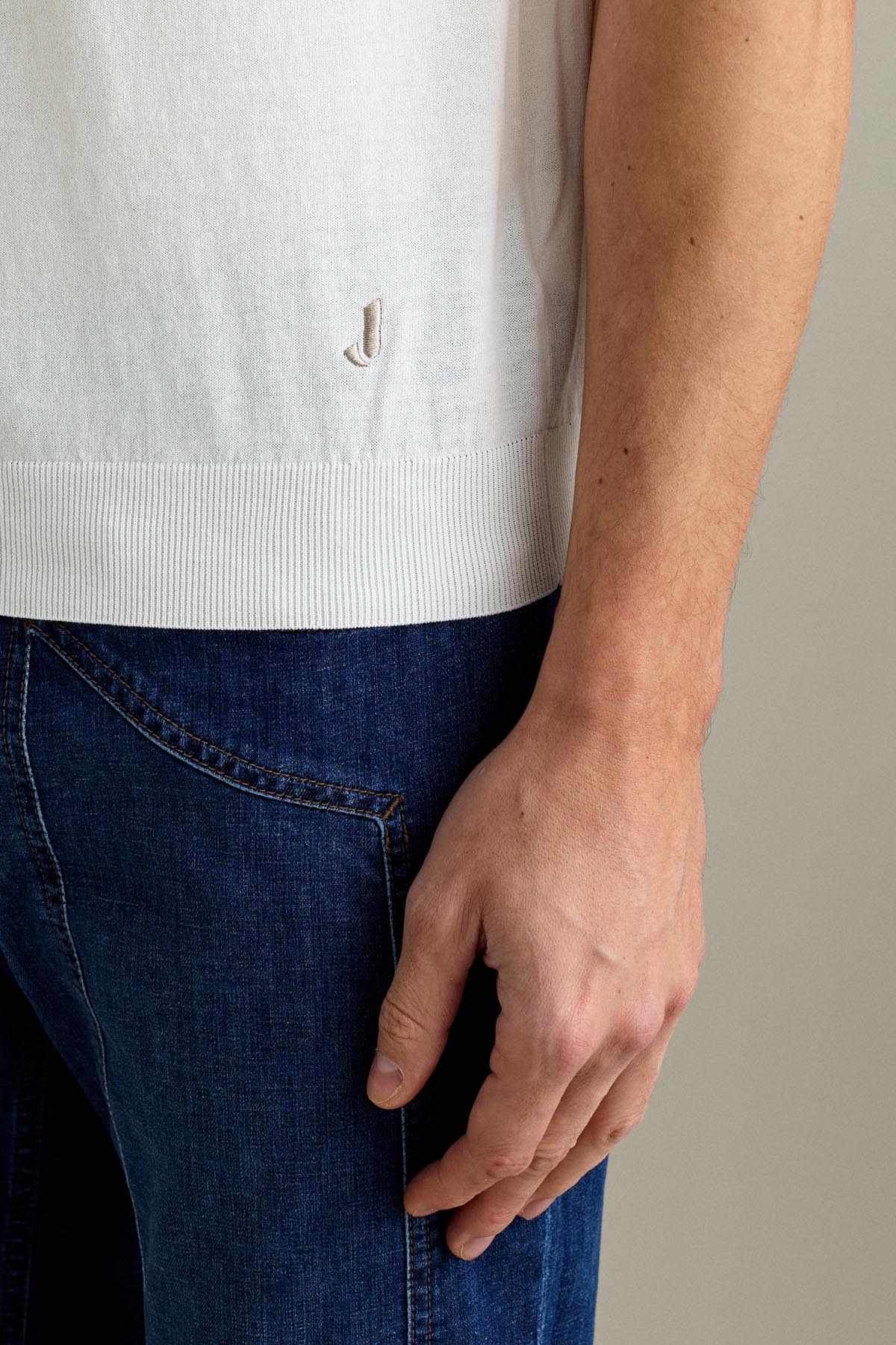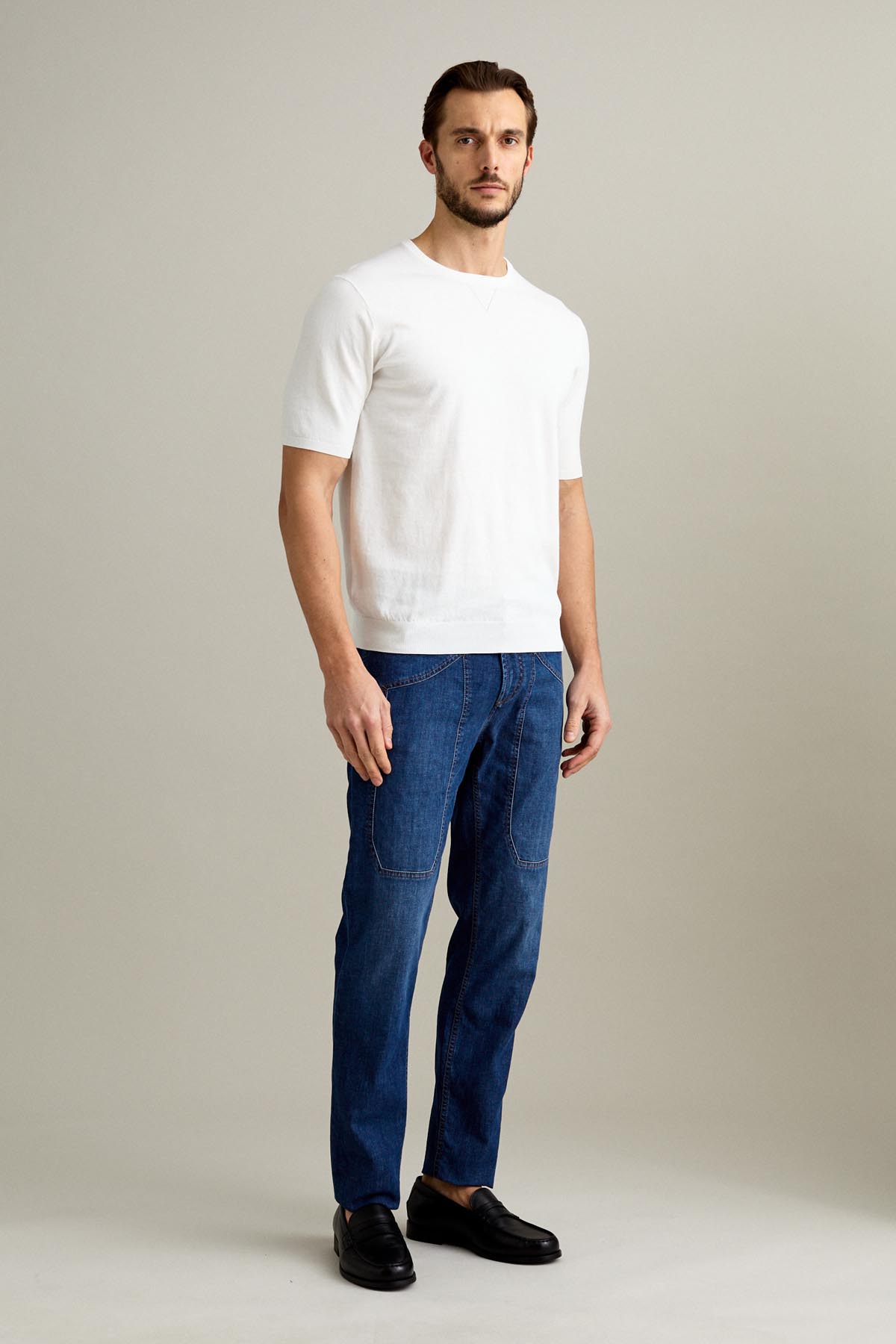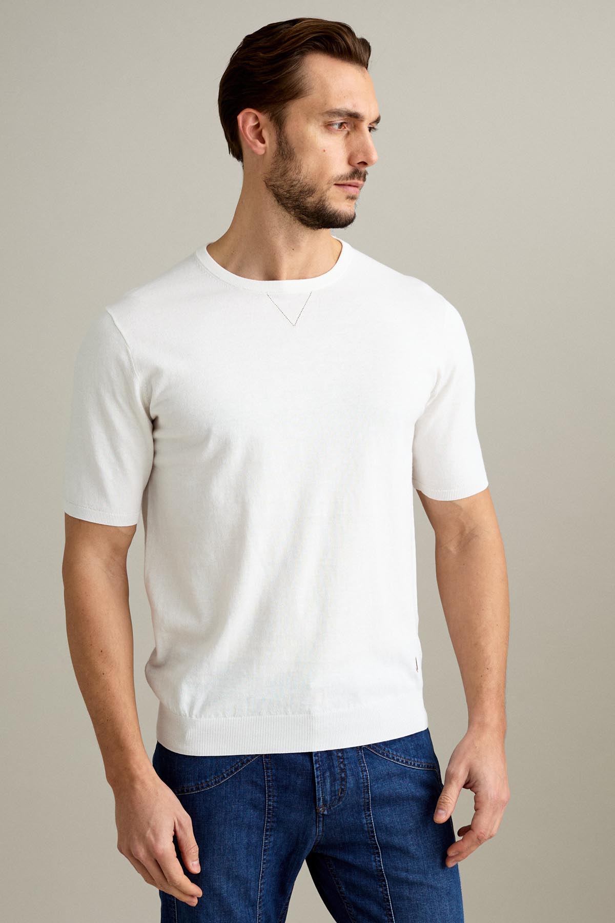 La t-shirt a manica corta è realizzata in maglieria calata finezza 14 in filato di cotone crepe, nel colore Bianco Lana.